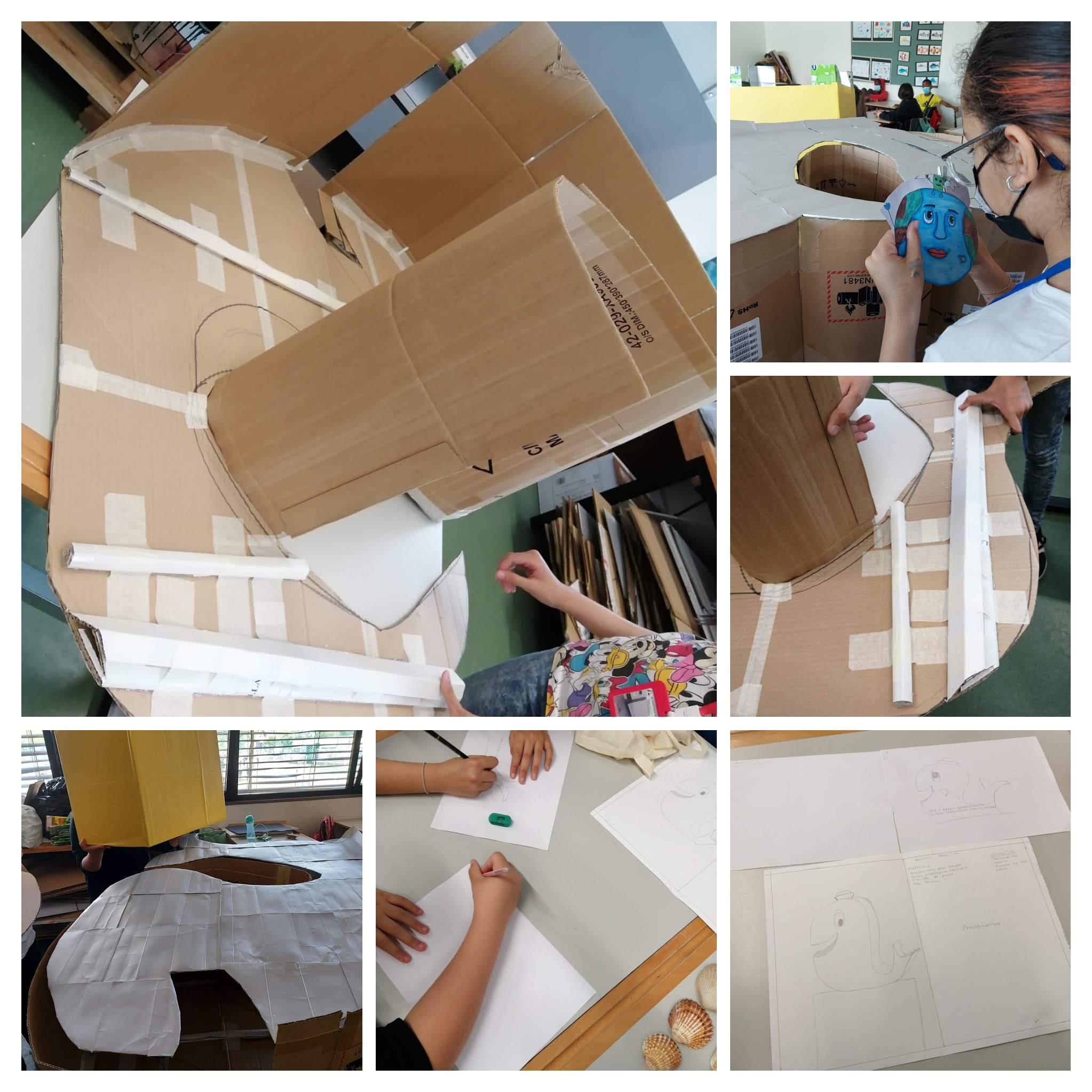 Numa primeira fase, decidiu-se o formato do embalão - uma baleia - uma vez que, desta forma, o poderíamos ligar aos Oceanos – Tema desenvolvido no âmbito da Autonomia e Flexibilidade Curricular, com o subtema “Vamos dar tempo ao Oceano”.