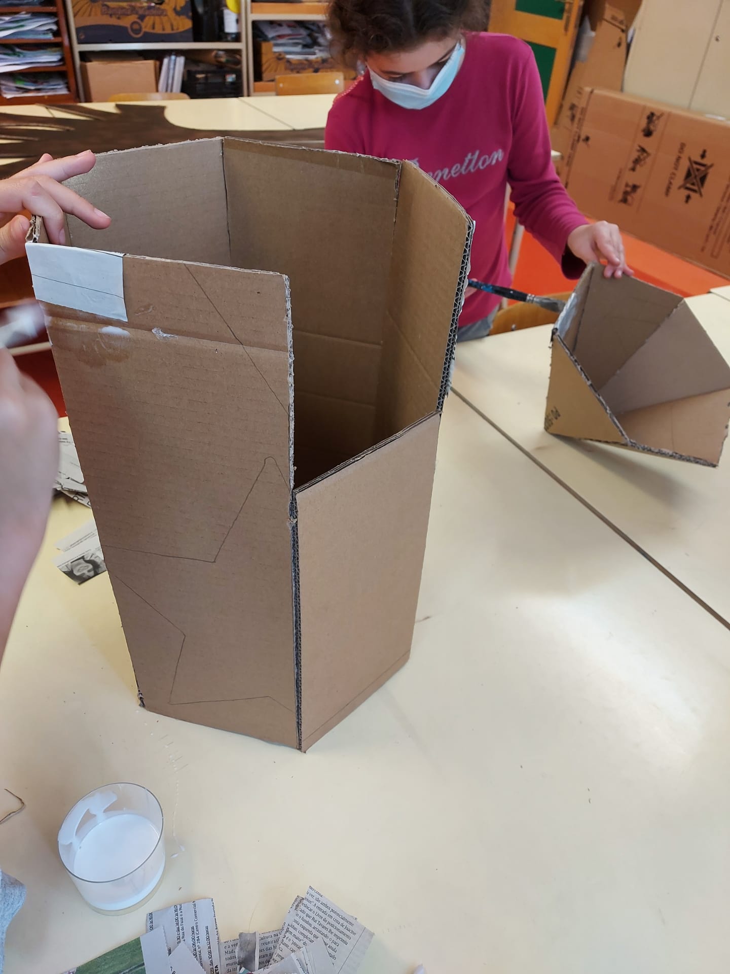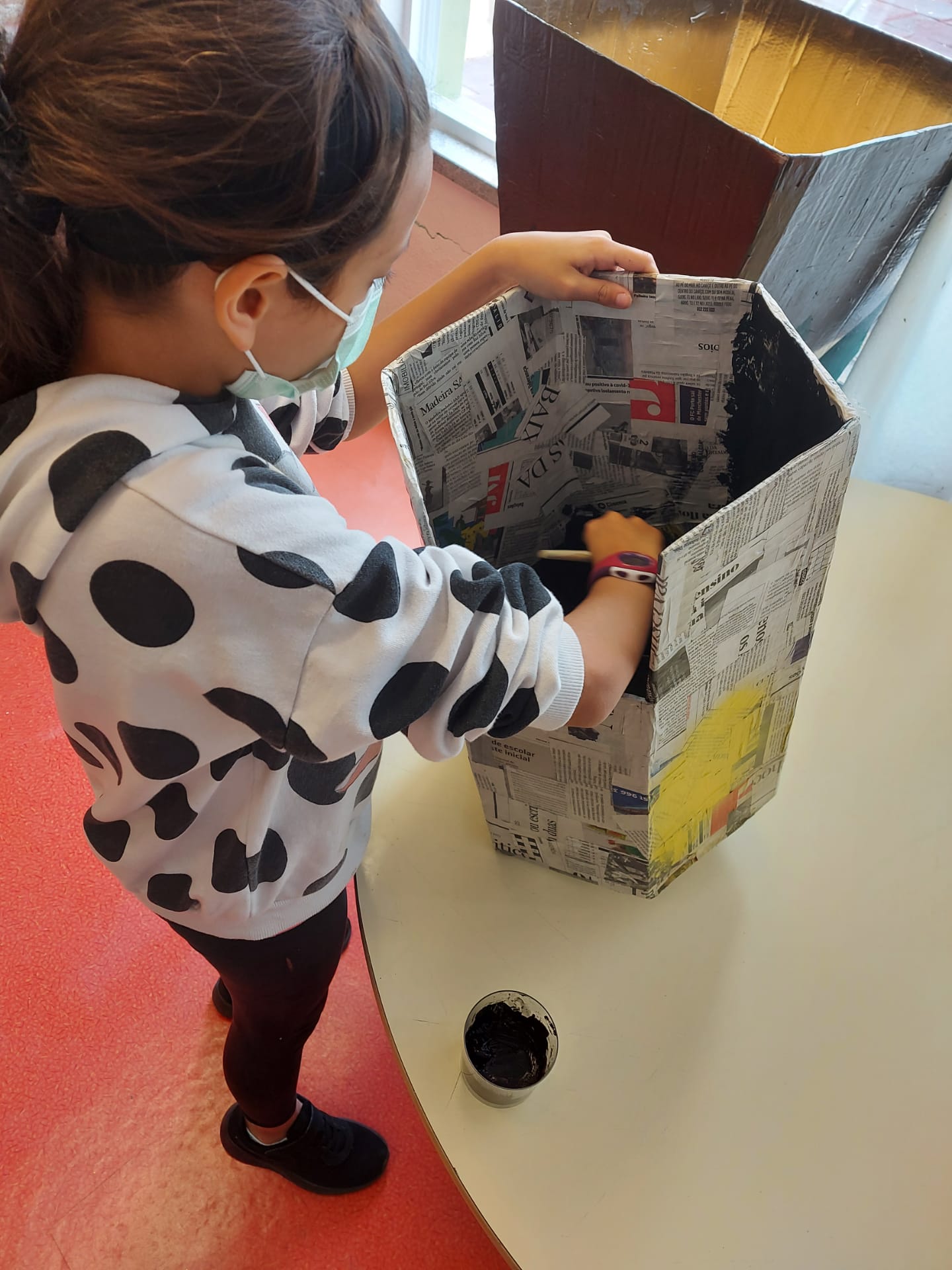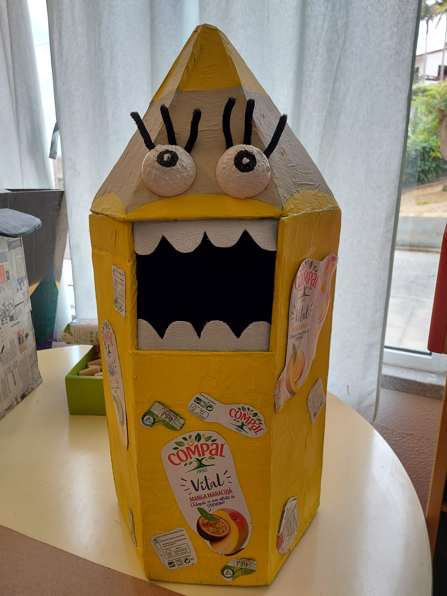 Ecoponto construído com a ajuda dos alunos do 4º ano tendo como base cartão. Após o corte e a dobragem para lhe dar forma, foi forrado com tiras de jornal e cola branca de modo a criar o seu revestimento. Posteriormente foi pintado de amarelo e aplicadas as respetivas embalagens/logotipos da Compal. Por fim, colocadas pequenas decorações que lhe deram vida.