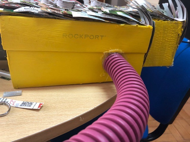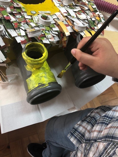 Primeiramente houve a recolha dos materiais para elaboração o do Eco Robô. Os alunos recortaram as embalagens em tiras e separaram ao gargalo. Posteriormente sobrepôs-se uma caixa em cima da outra, colando-as. Foi utilizada cola para a junção de todos os materiais e para identificação da cor do ecoponto foi utilizada a tinta amarela. O mesmo foi construído com os alunos do terceiro e quartos anos.
