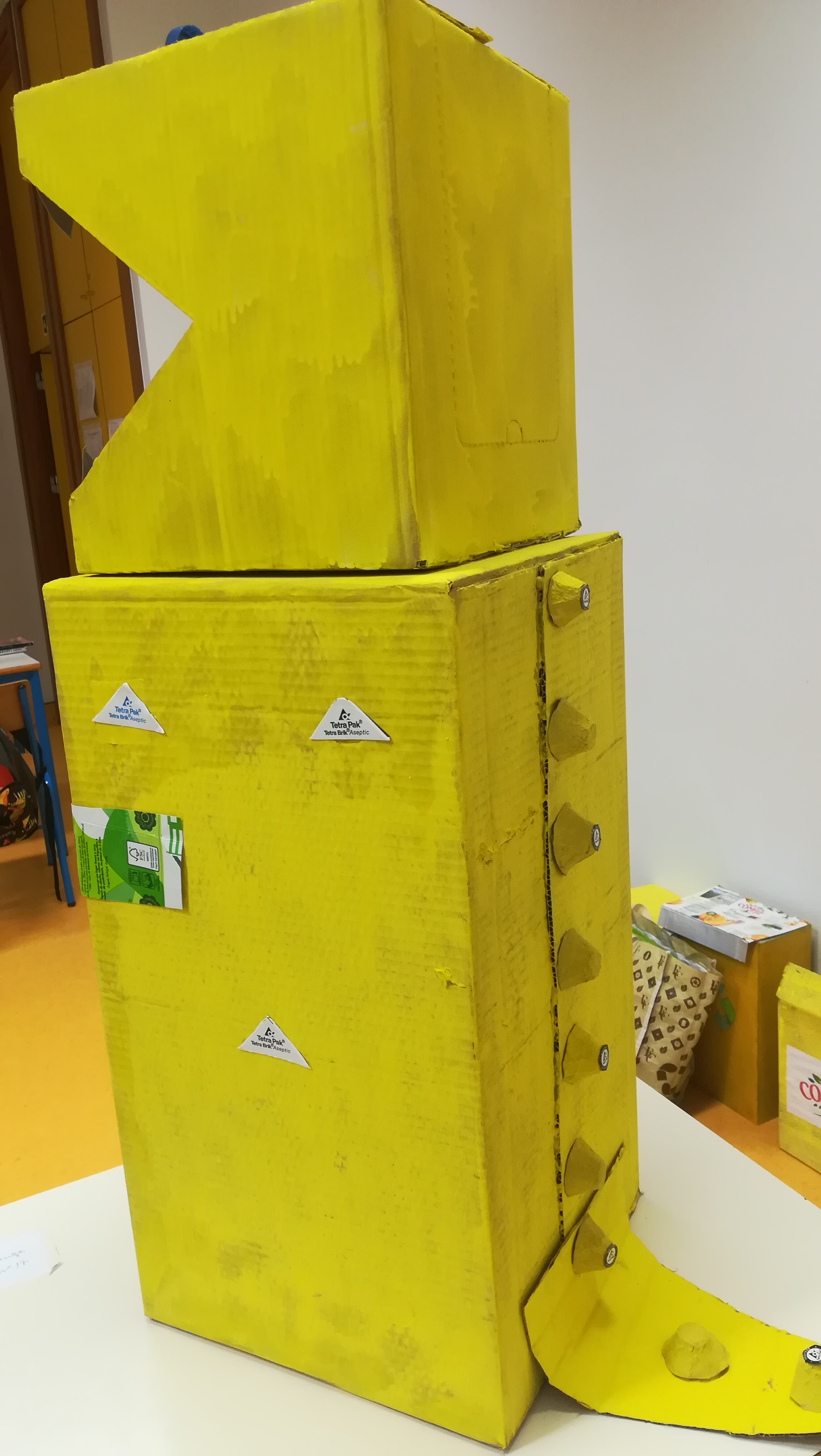 Elaborado por um aluno e representa um crocodilo que come as embalagens amarelas.
