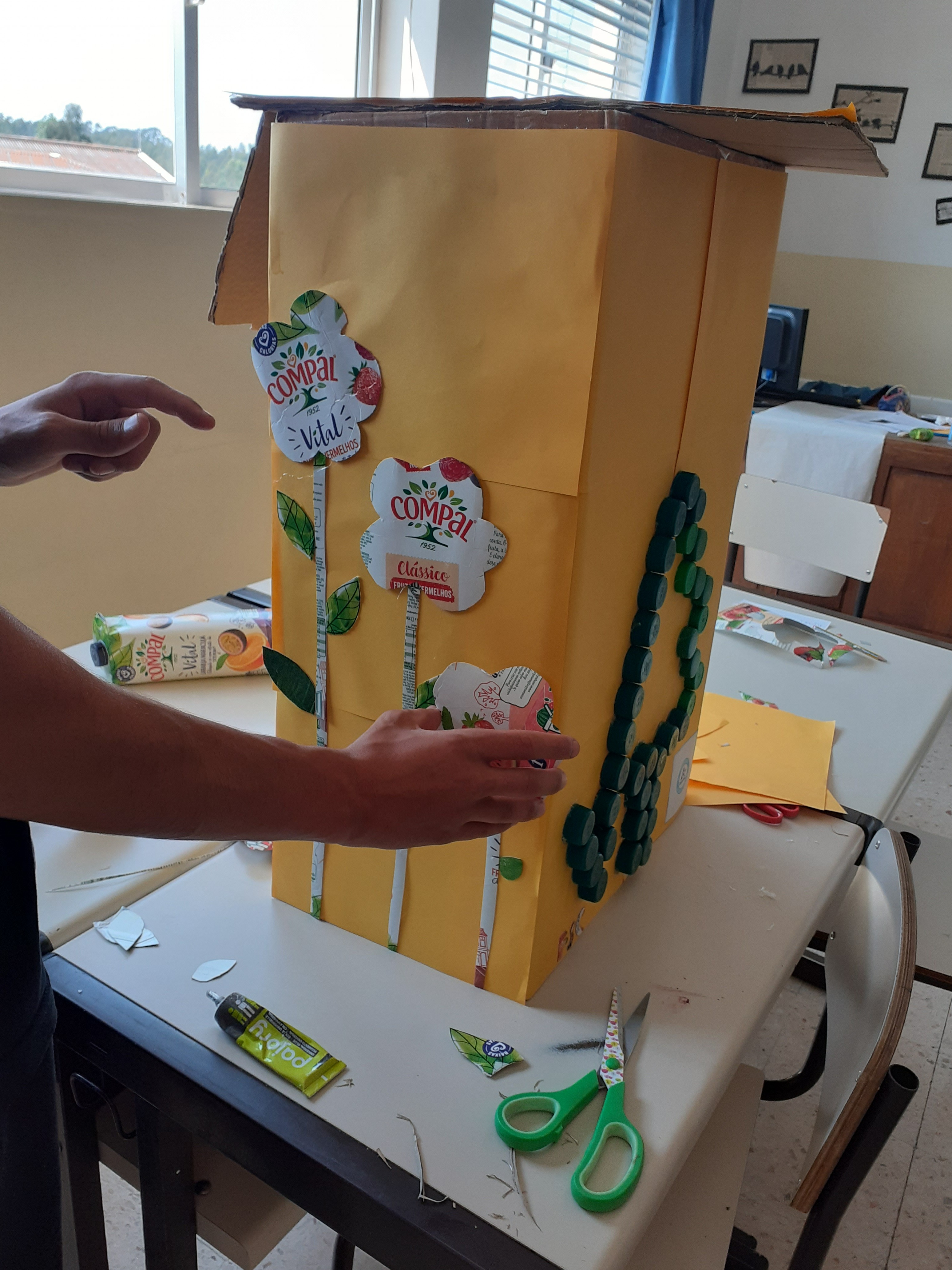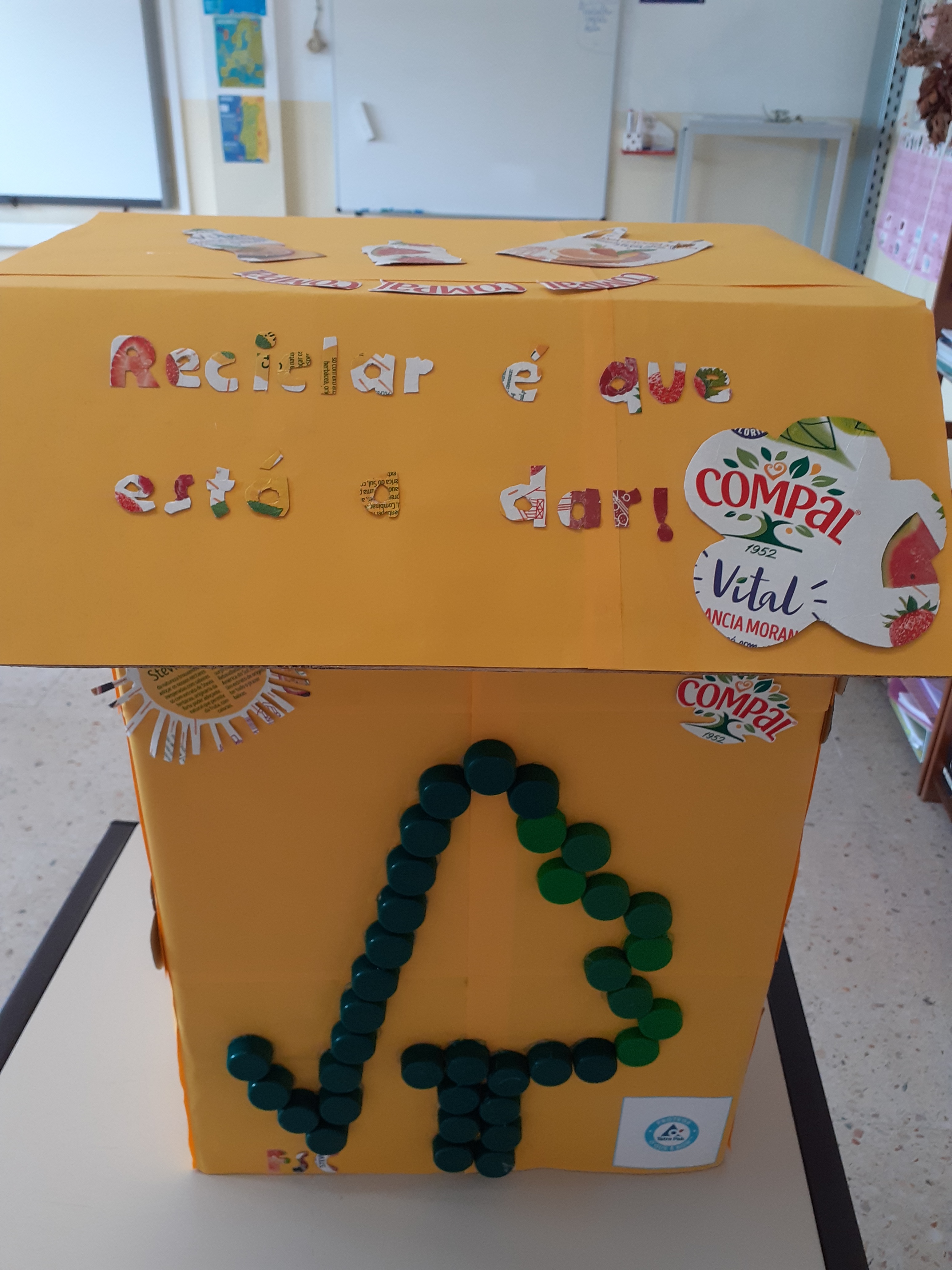 Houve inicialmente a apresentação do projeto " Constroi o teu ecoponto amarelo e recicla", sensibilização para a importância da reciclagem dos resíduos, em geral, e das embalagens e plásticos, em particular. Apelou-se à recolha de embalagens da Compal e tampinhas de plástico, fez-se uma pesquisa sobre as marcas " Compal", Tetrapack e FSC. Arranjou-se um cartão de papelão e revestiu-se com papel amarelo. Depois procedeu-se à decoração aproveitando a reutilização de materiais das embalagens de sumos Compal e rolhinhas de plástico verdes, para fazer o logotipo da FSC.