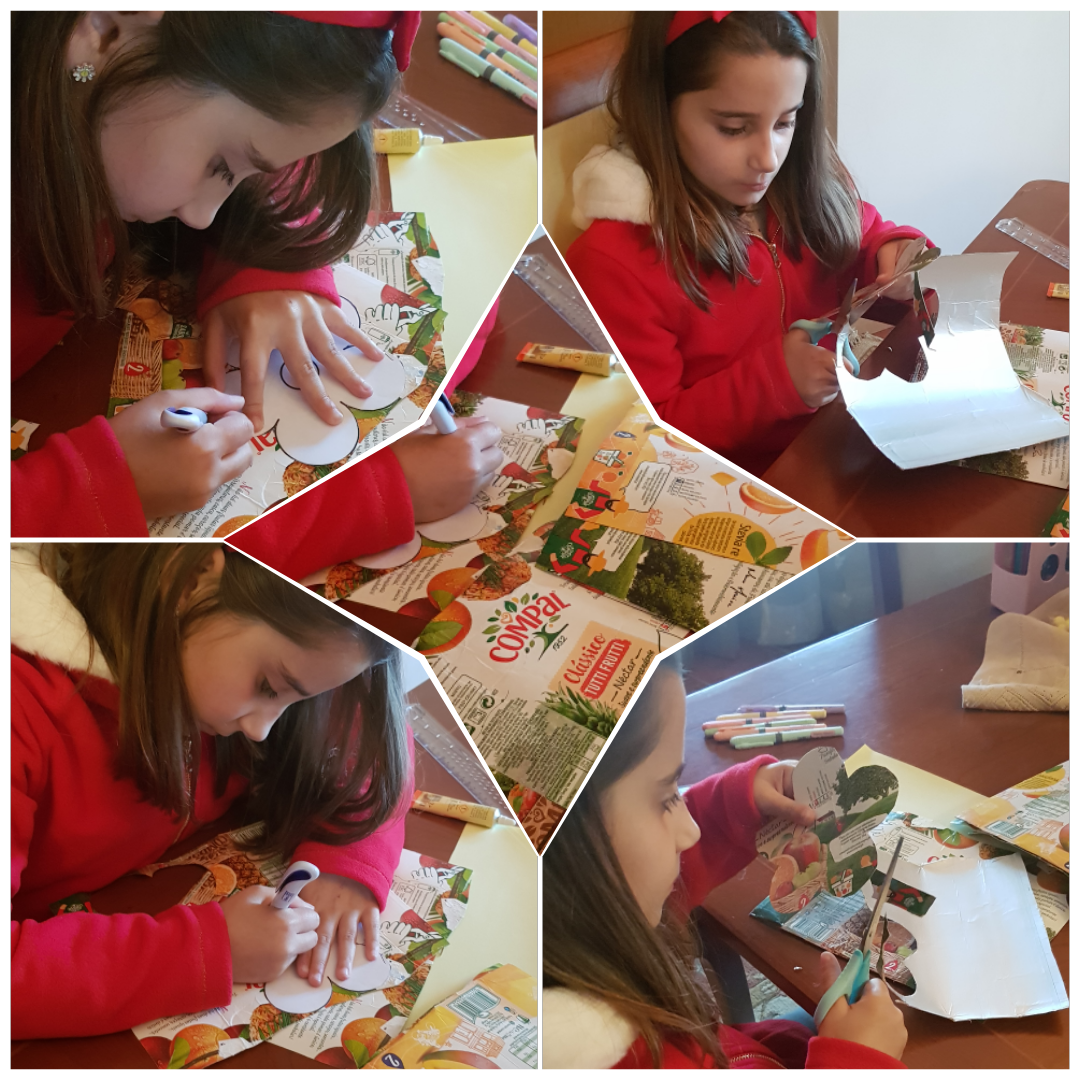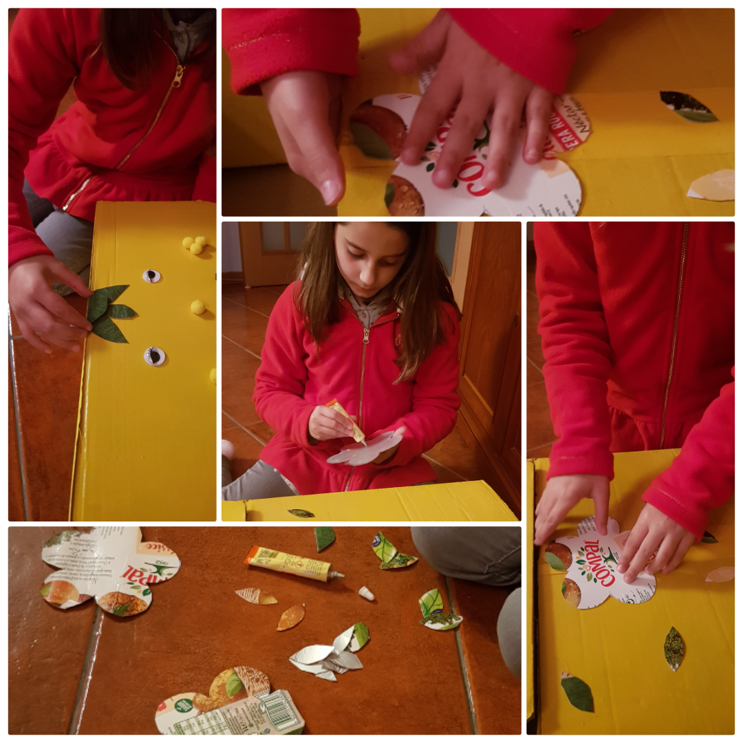 Com muita imaginação e vontade de criar um ecoponto divertido, a Beatriz deitou mãos à obra e em casa, com a ajuda da família, criou o seu ecoponto amarelo, usando embalagens TetraPak (da Compal e outras), tintas, cola...