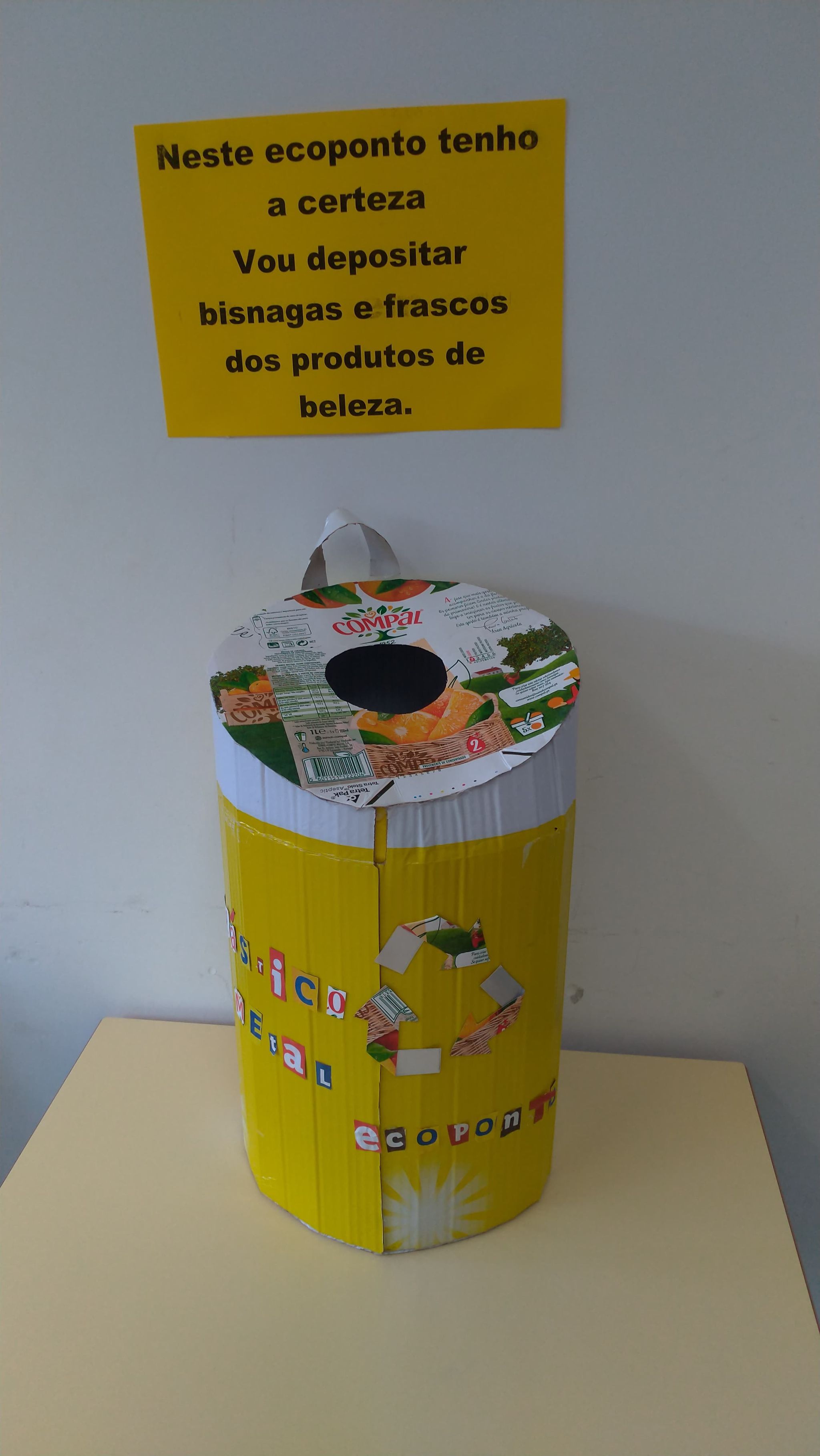 1º Ecoponto – construído com uma caixa de cartão, com altura de 70 cm. Aplicação de rodas e apoio de mãos para imitar um contentor “real”. Tem uma abertura, muito fácil de manusear. A toda a volta foram aplicados recortes de embalagens tetrapak bem como o selo FSC. (conforme fotos selecionadas – Turma do 4ºano). Este ecoponto está situado na entrada da escola, tendo em conta o seu tamanho.