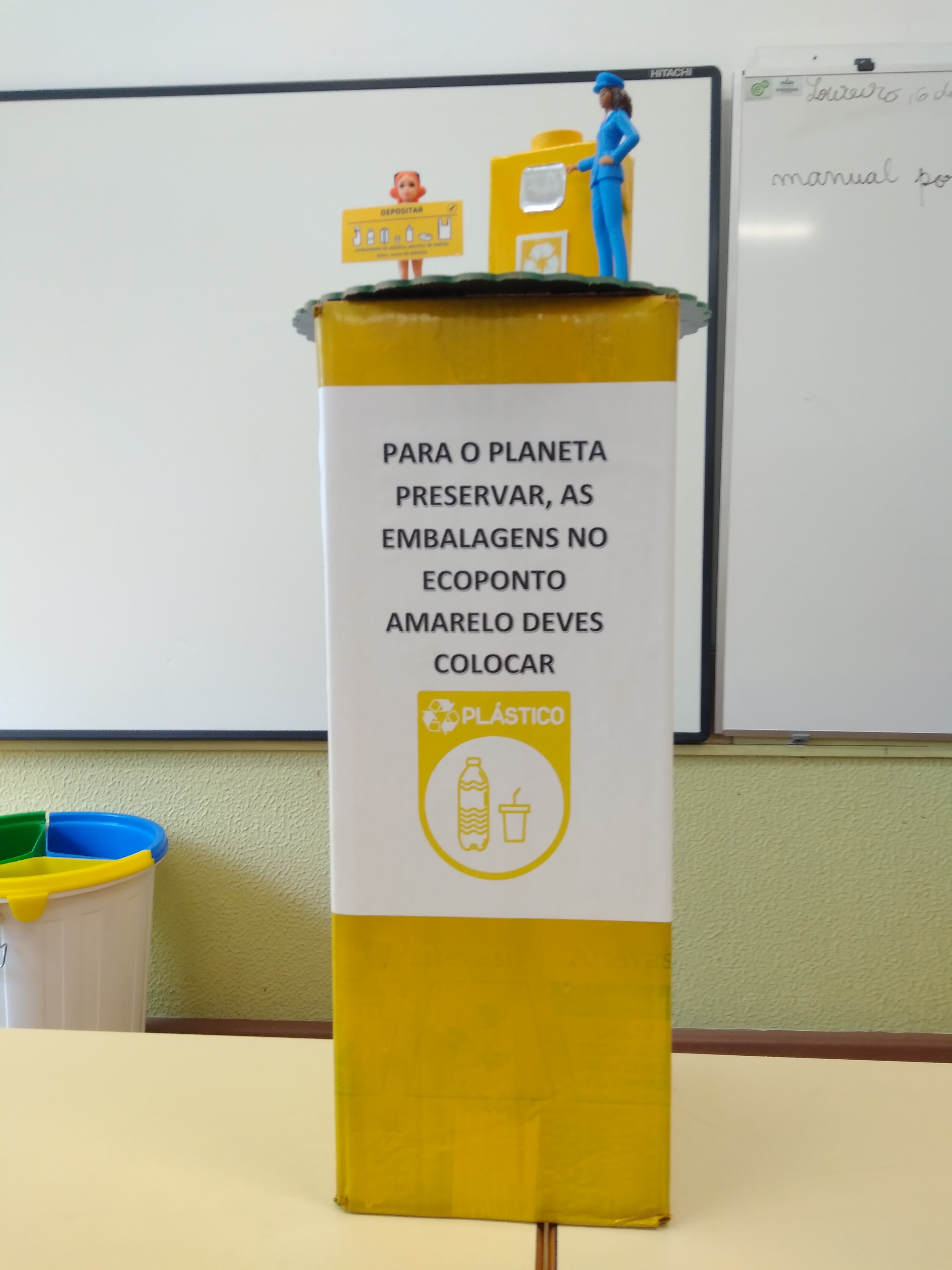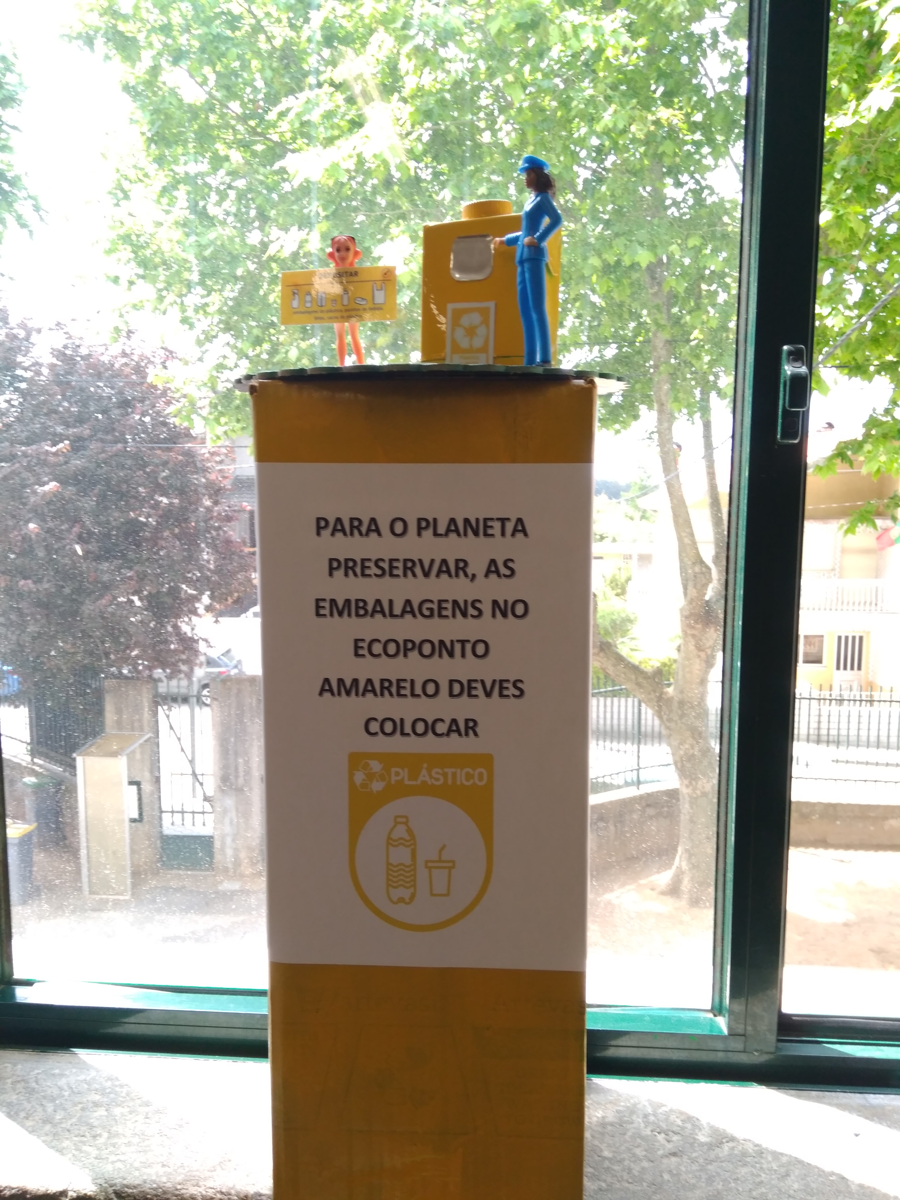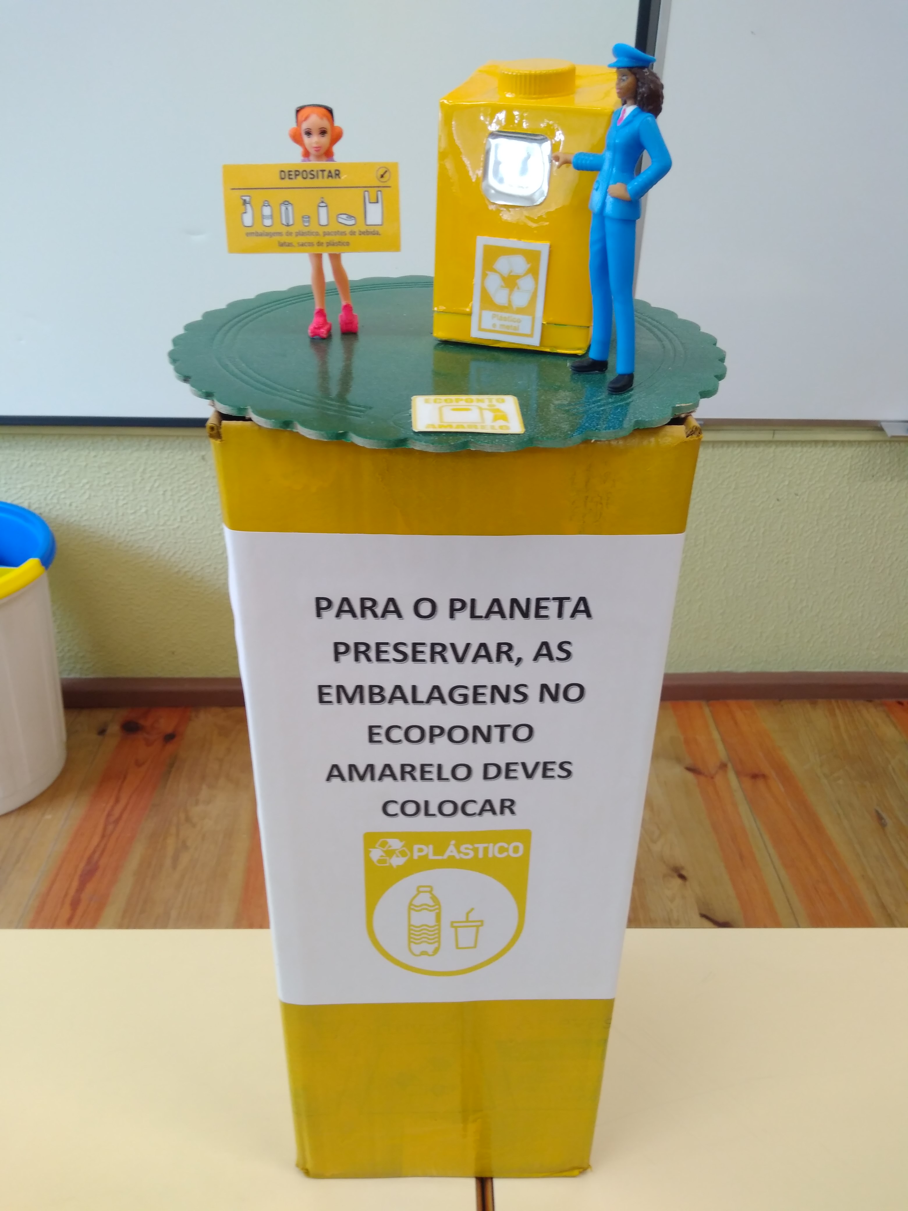 Ecoponto feito com materiais totalmente recicláveis, à exceção das tintas e bonequinhos.