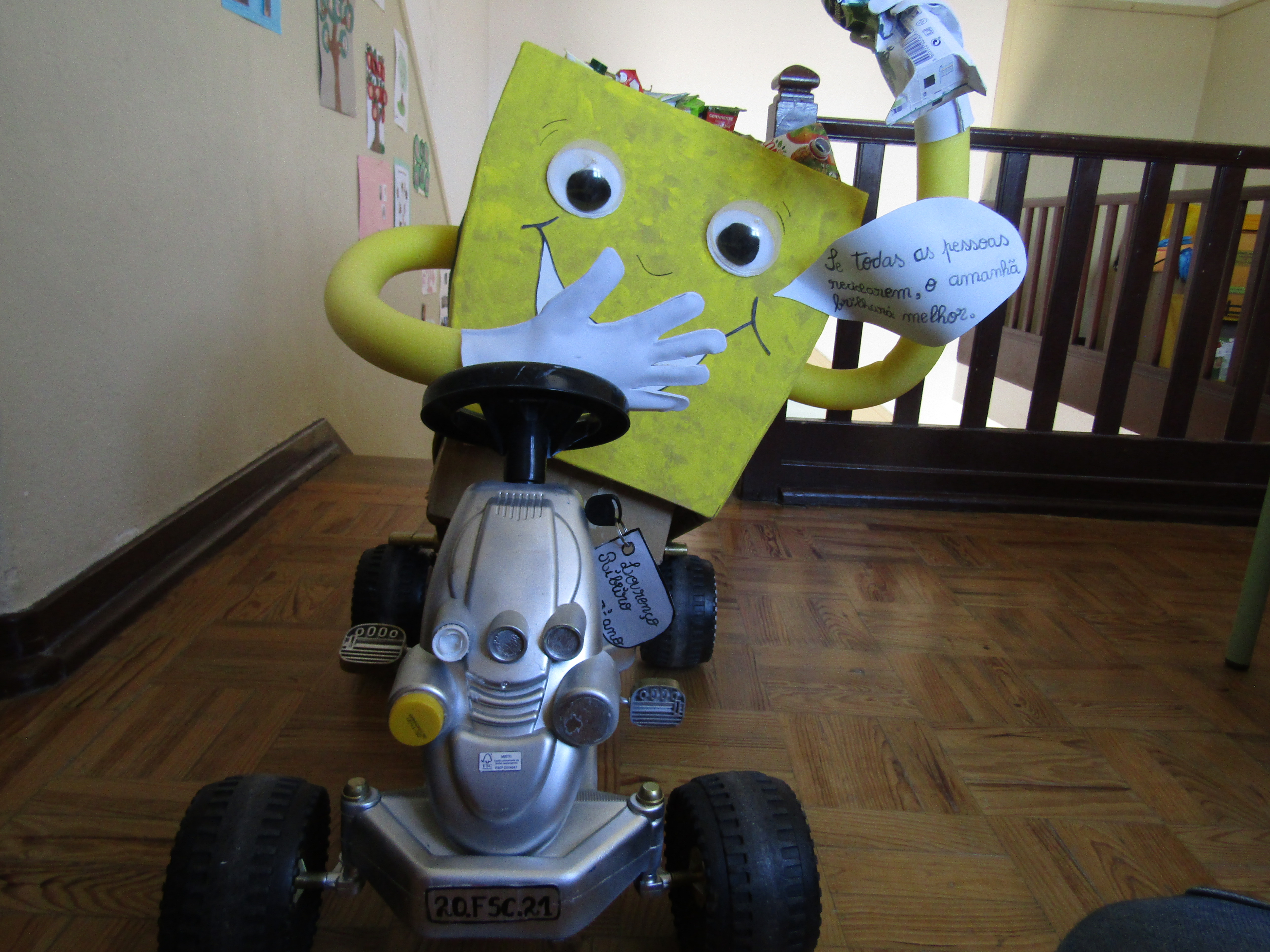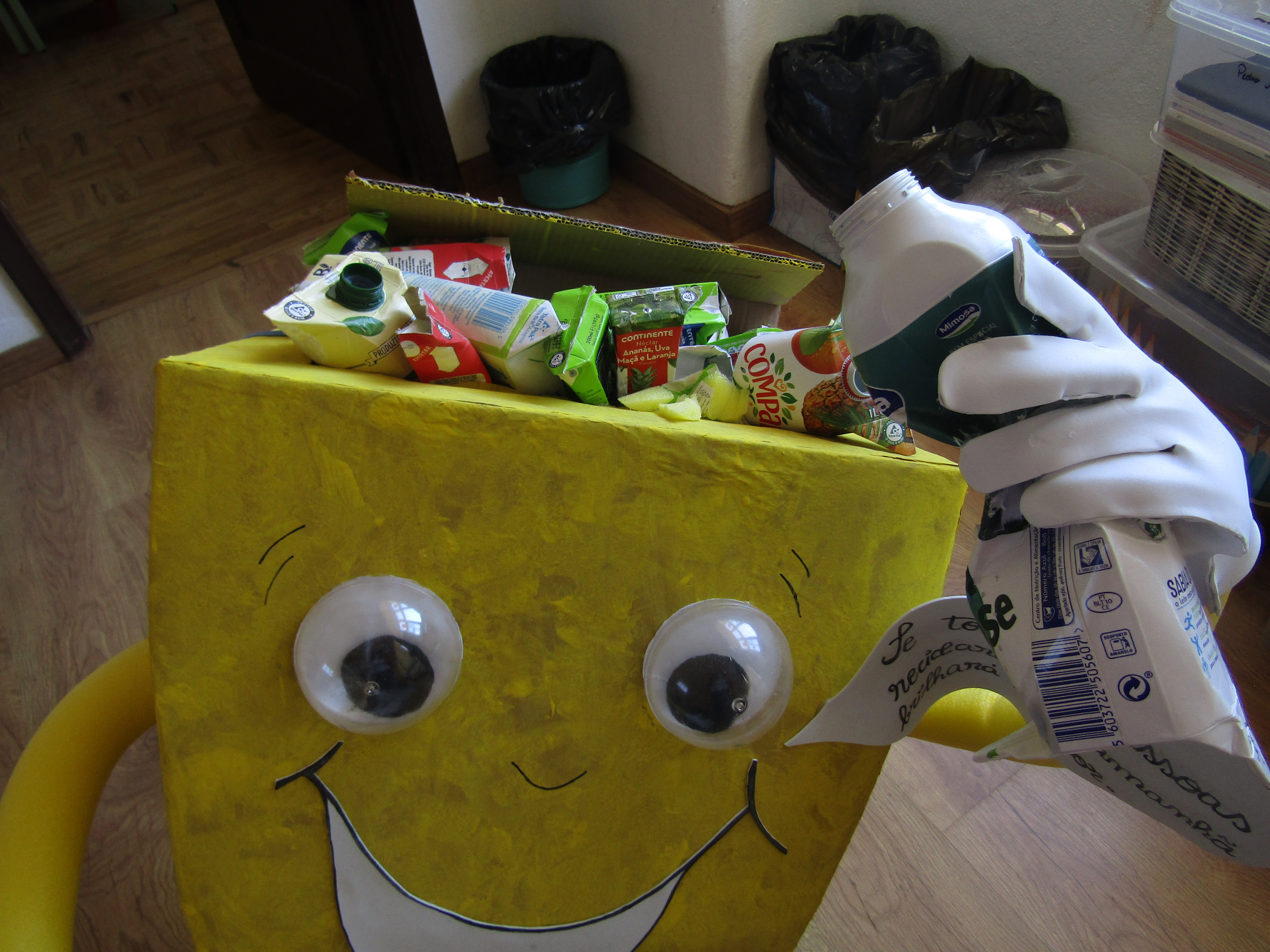 Este Ecoponto Amarelo foi construído pela turma FER4, do 3ºAno de escolaridade, da E.B.1 de Ferrel. A professora titular desta turma, durante o período de ensino à distância, propôs à turma a construção de um ecoponto amarelo, de preferência com materiais reutilizáveis, embalagens tetra pak da marca Compal. O objetivo era envolver as famílias nesta tarefa de sensibilização para a reciclagem. Quando regressámos às aulas presenciais, surgiram trabalhos muito diferentes, mas todos mostraram o quanto as famílias se empenharam nesta tarefa, o que por si só já é bastante positivo. Fez-se uma exposição na escola com os trabalhos e através de votação foi selecionado o trabalho que aqui submetemos.