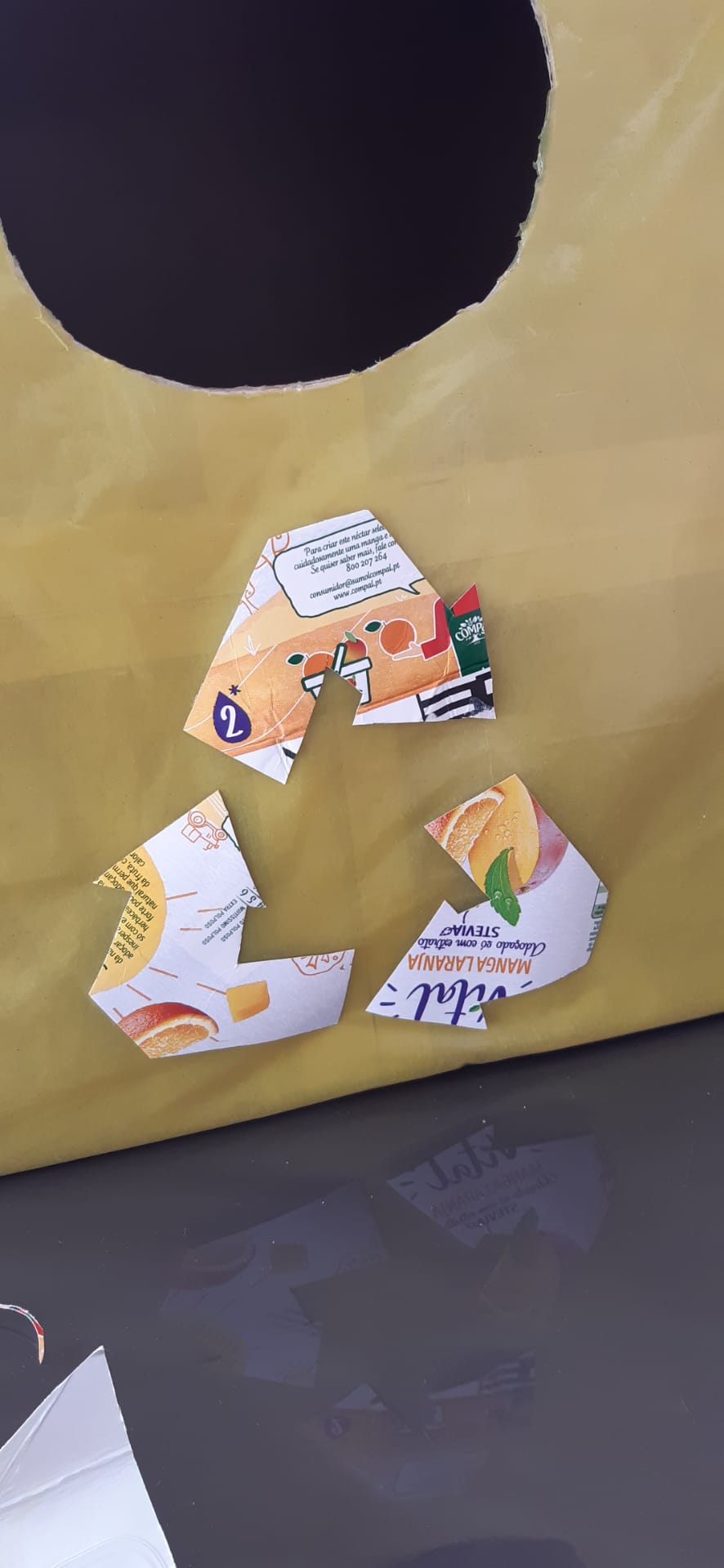 6º Recortou e colou o simbolo da reciclagem, corações, os braços e uma flor para a decoração do chapéu