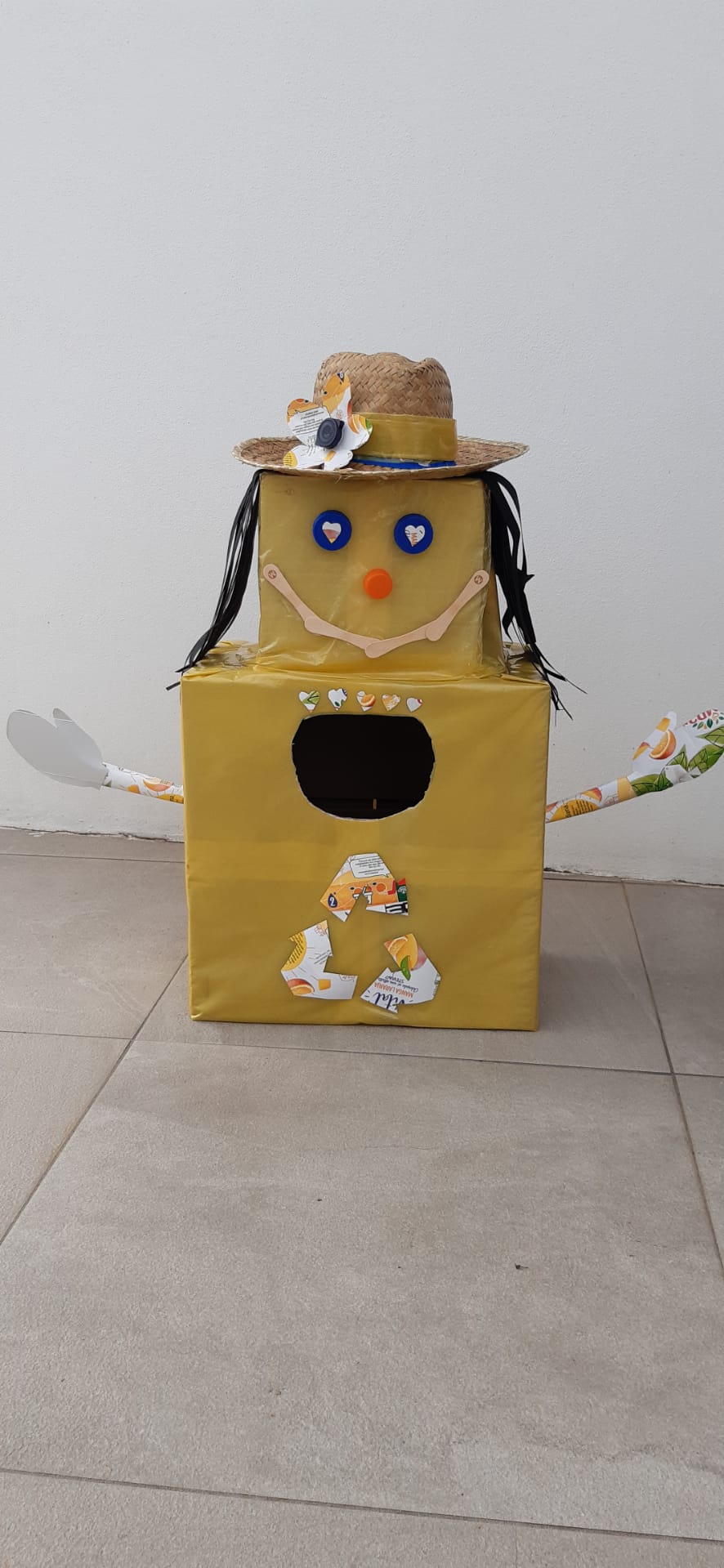 4º - Colou paus de gelado para fazer a boca e tampas de plástico para fazer nariz, olhos e colocou um chapéu velho para embelezar o trabalho