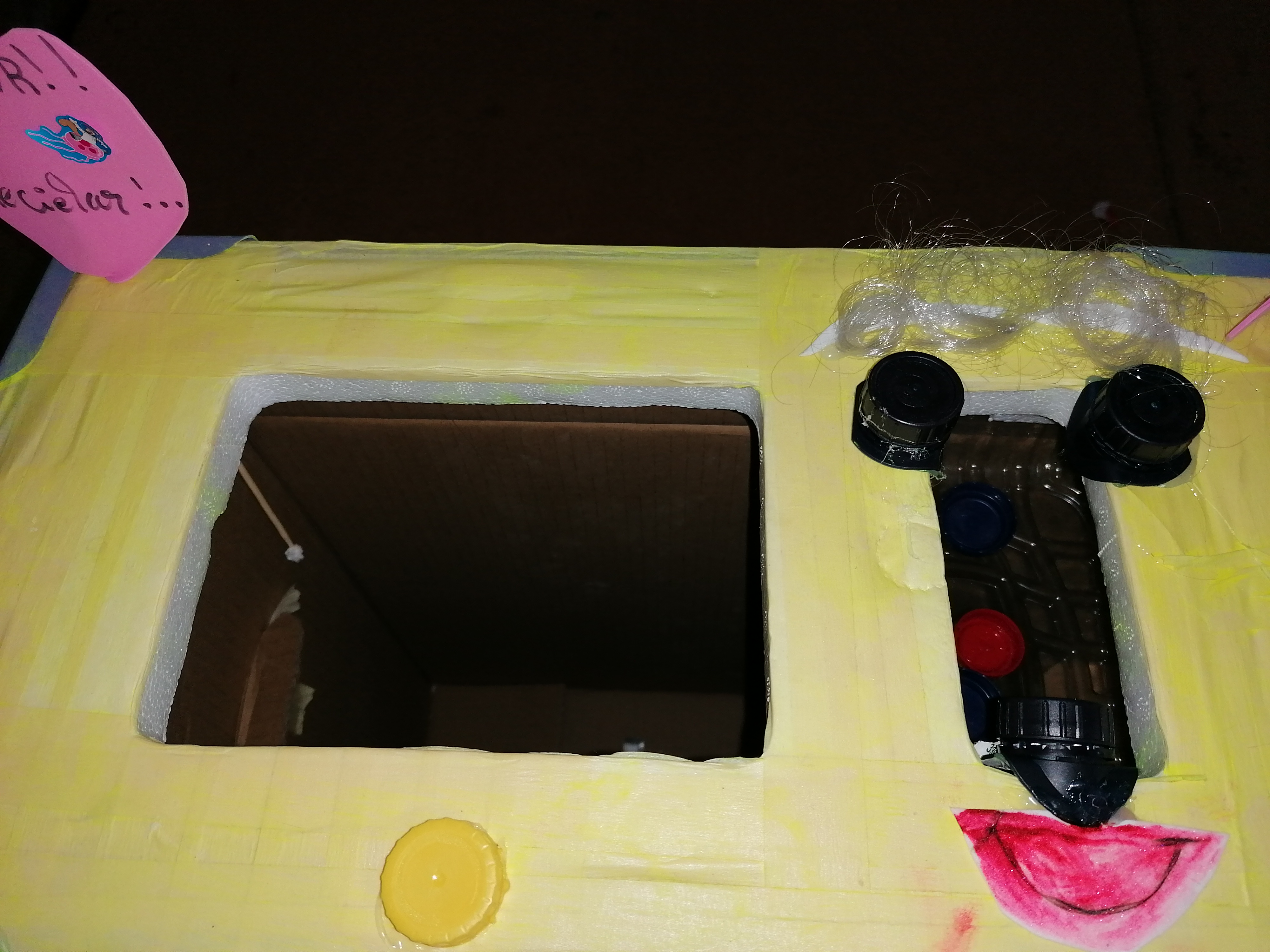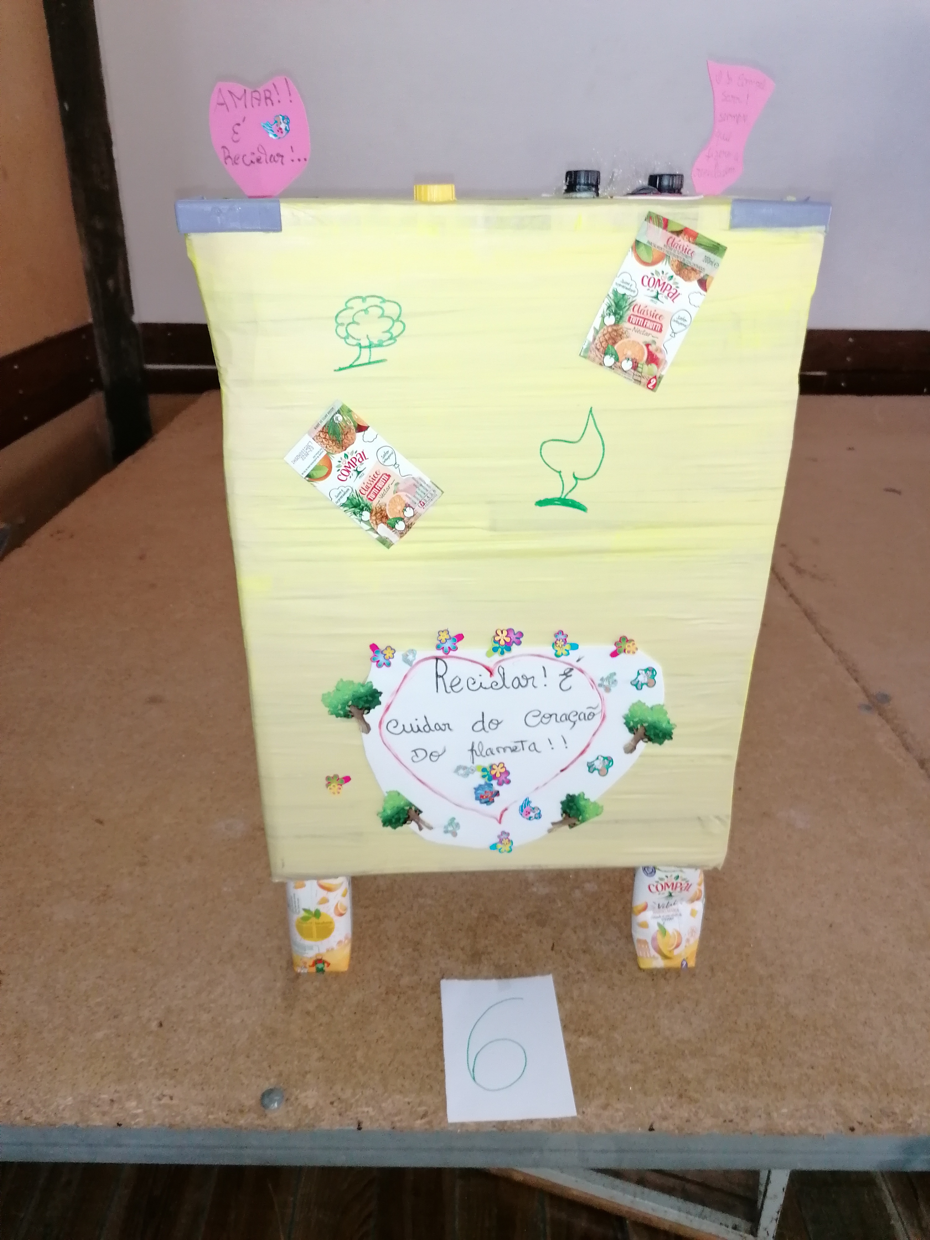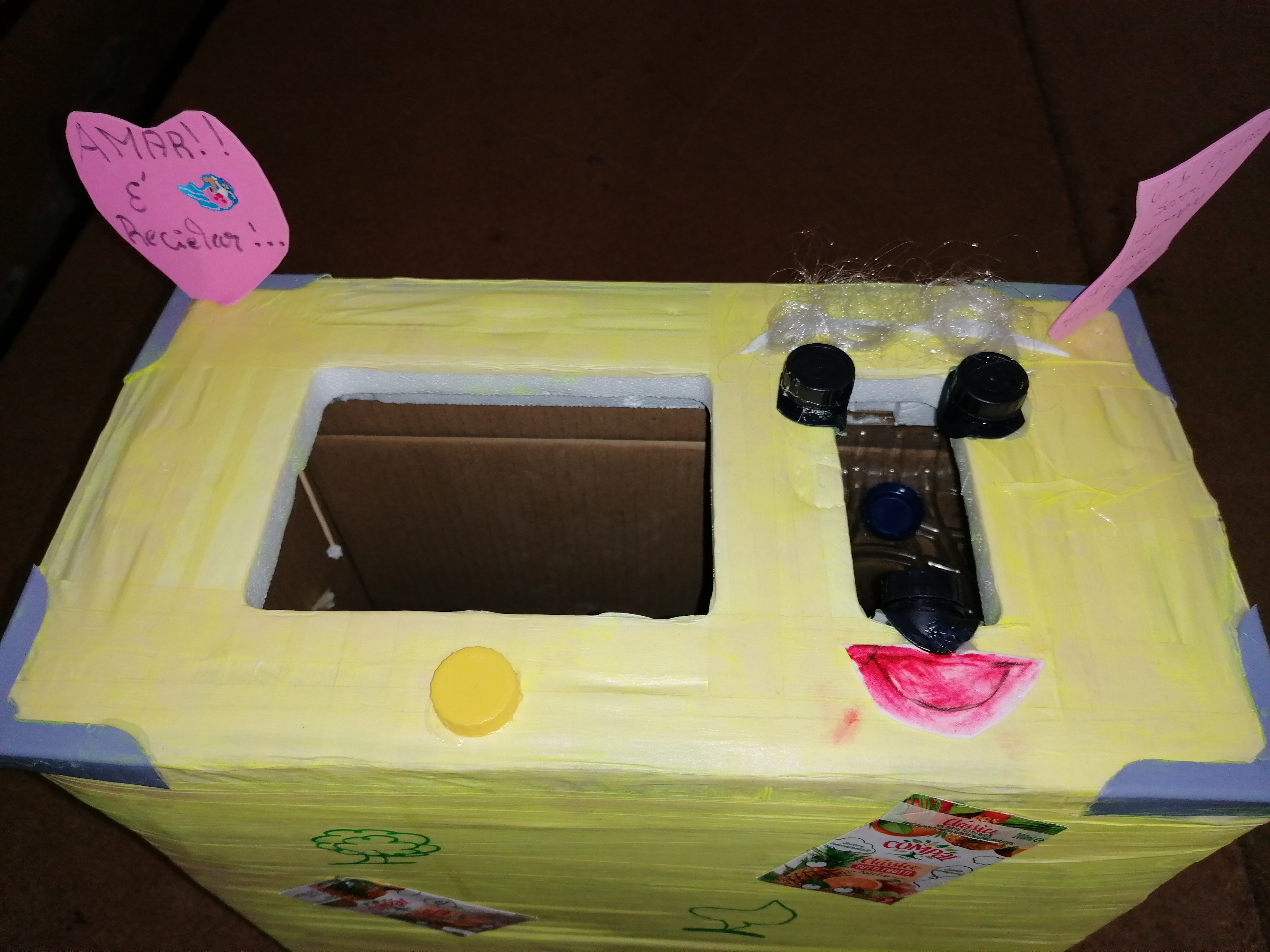 Os materiais recicláveis usados foram: caixa de cartão, embalagens de sumo da Compal, tinta e amarela, embalagens de plástico pequenas, tampas de plástico, pedaços de cartolina Eva para decorar, pedaços de plástico para reforçar os cantos e esferovite.