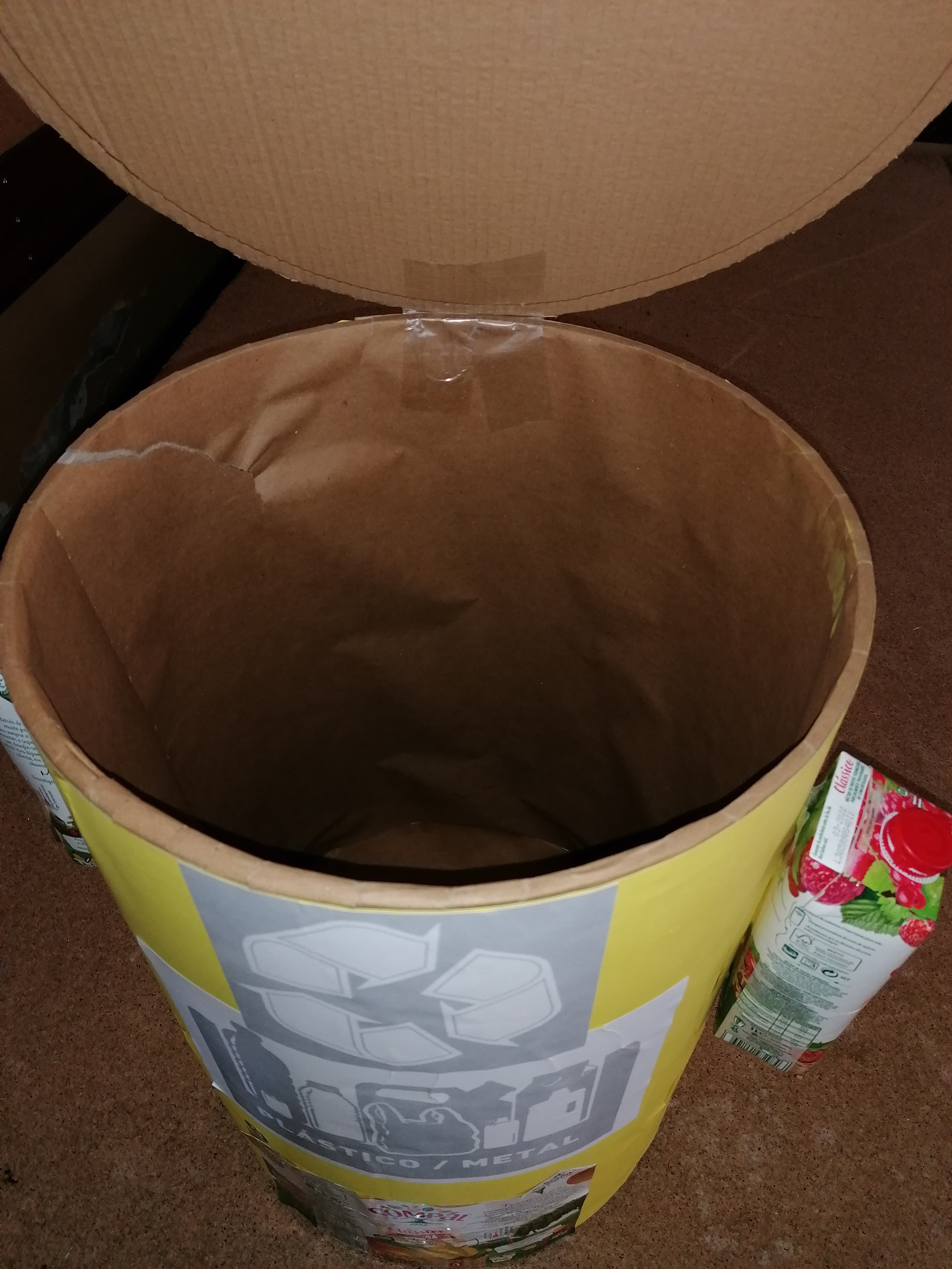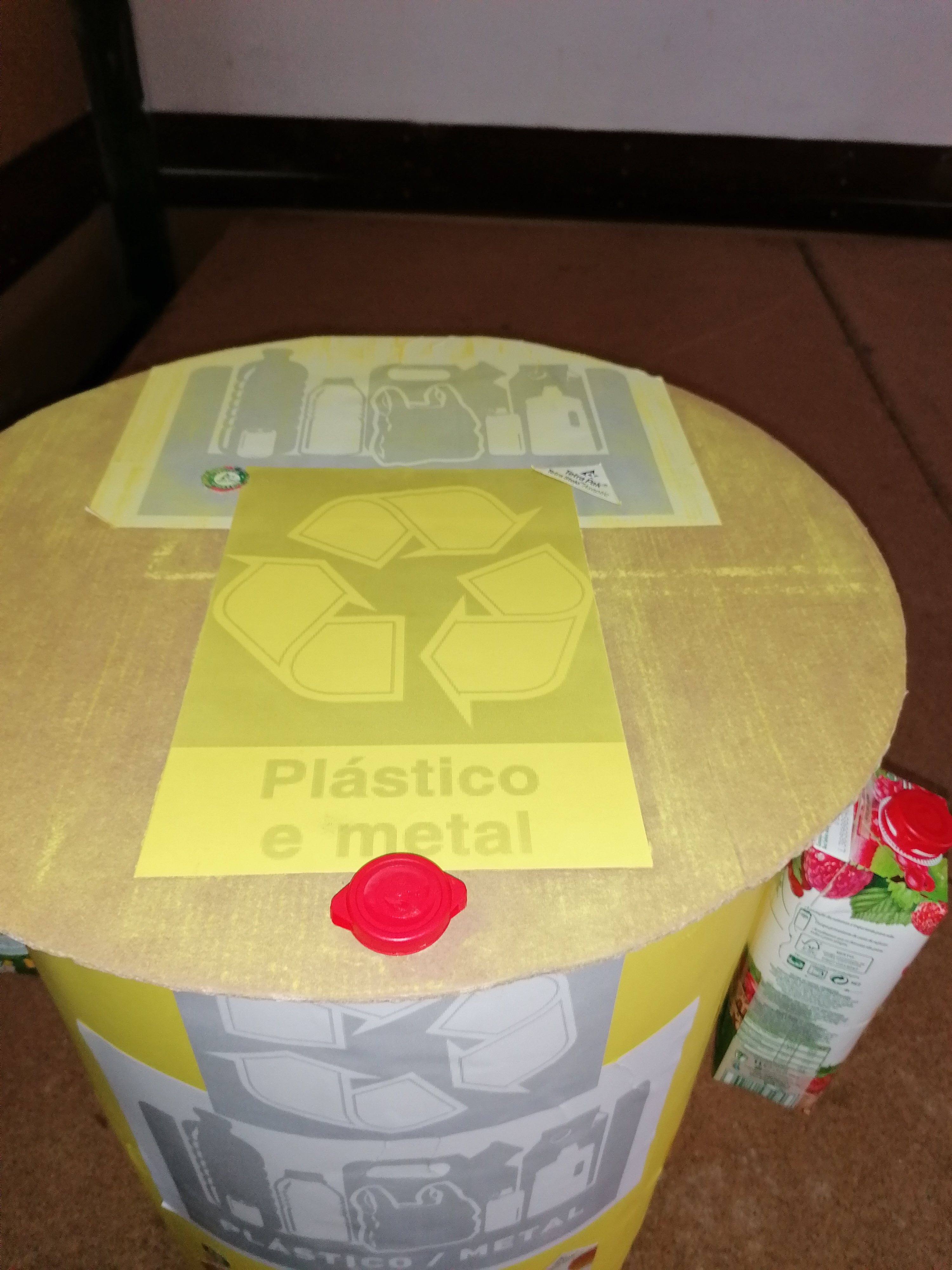 A descrição do ecoponto é a seguinte: a estrutura é feita com cartão prensado envolta forrado com cartolina preta no seu exterior, o seu interior foi forrado com o papel pardo. A tampa do ecoponto foi feita com um círculo de cartão, pintada com giz amarelo e colada uma imagem dos materiais que se devem colocar no respetivo ecoponto. Tem de lado duas pegas, feitas com as embalagens de sumo da Compal, onde se visualiza o símbolo FSC e o Tetra Pak. Colocou-se uma tampinha de uma embalagem do sumo Compal, a servir de puxador da tampa do ecoponto.