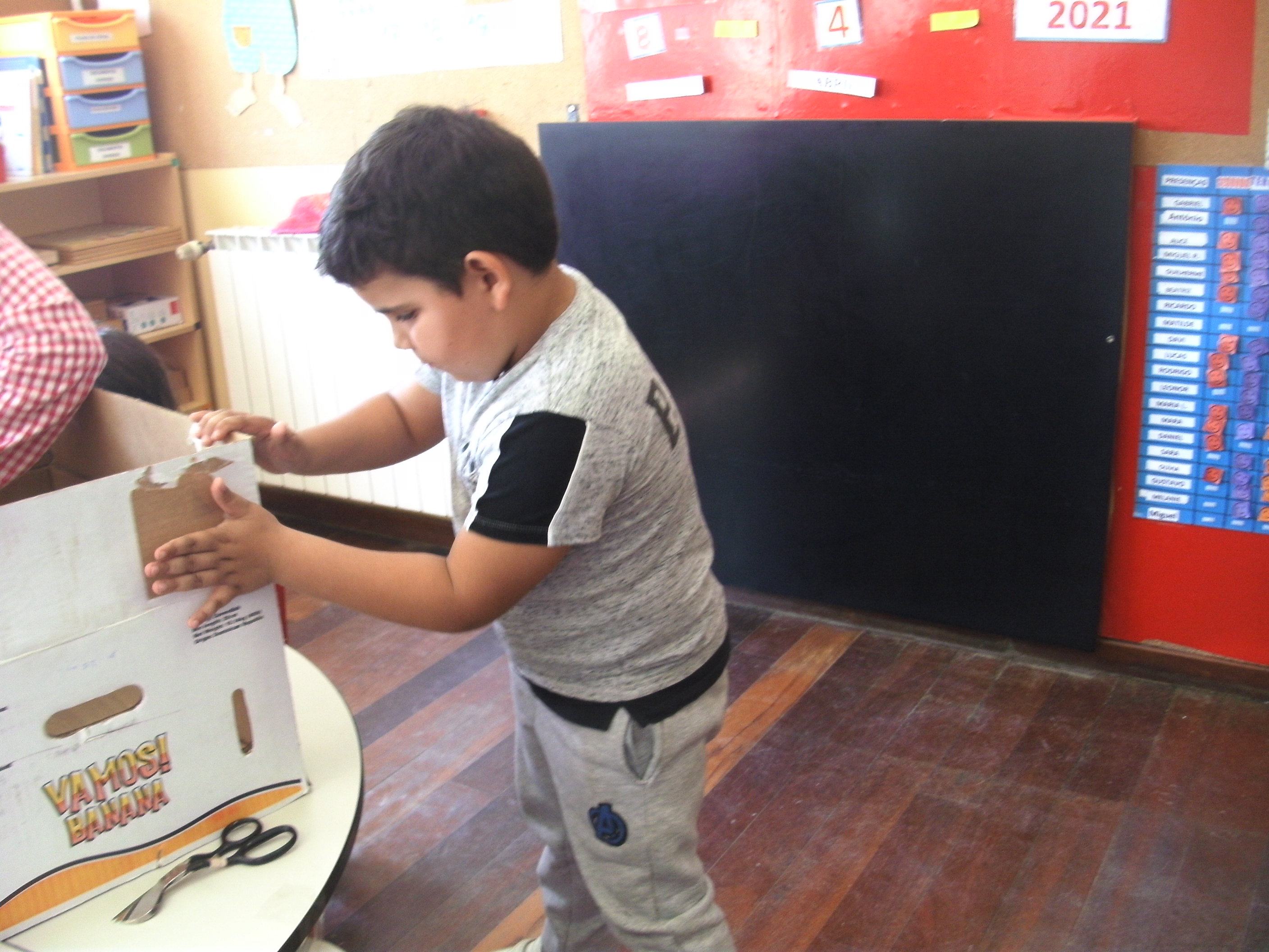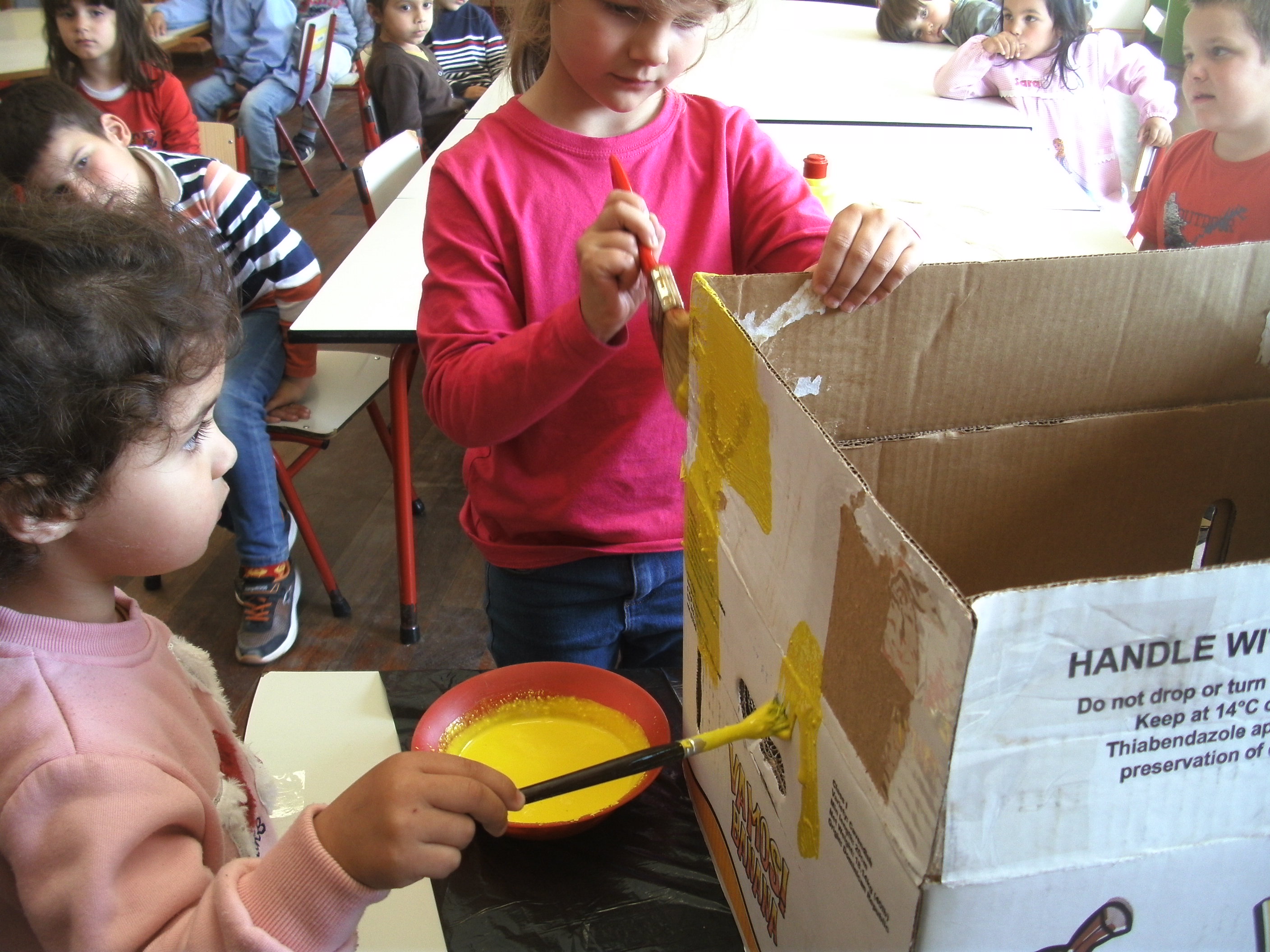 Primeiro pedimos às cozinheiras as caixas , depois pintamos de amarelo, cortamos uma parte para abrir o local para colocar o lixo , pintamos de amarelo, colamos materiais recicláveis e reutilizáveis onde sobressaem os pacotes FSC e tetrapak. A FSC é uma marca que promove as florestas e as certifica como pulmão para todos.