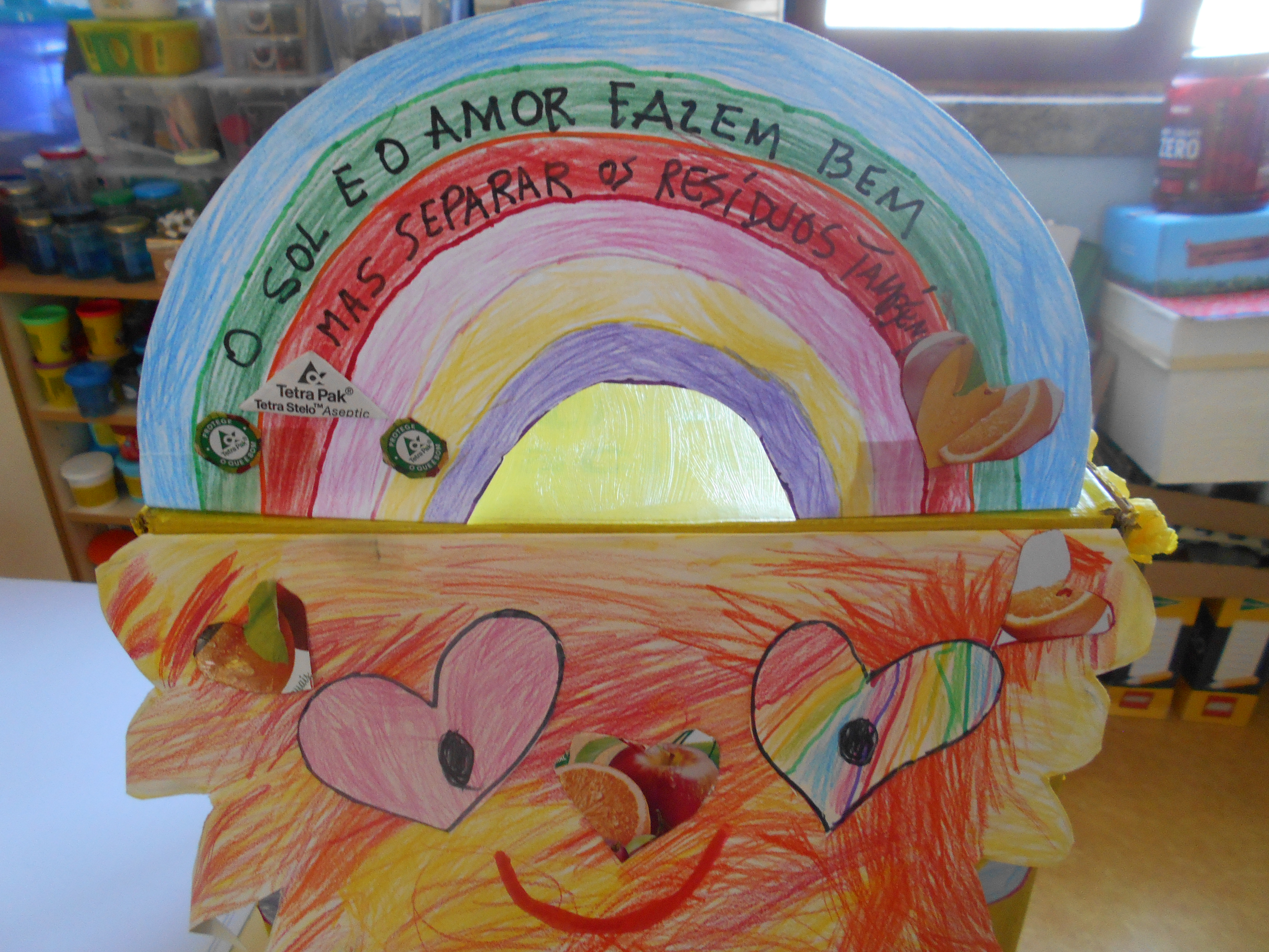 As crianças foram sensibilizadas para este projeto, apesar de já fazerem a separação dos resíduos há muito tempo. Habituadas também a Reutilizar arranjámos uma caixa vazia, pintaram e fizeram o projeto que entenderam, depois de uma conversa de grupo. Neste projeto entenderam desenhar o Sol e corações e ainda um arco-íris. Não consigo submeter os desenhos do projeto, devido à limitação de fotos. O resultado foi o que está à mostra. O Eco Ponto "Embalão" irá ficar na nossa sala, onde colocaremos os resíduos menos sujos, por razões obvias.
