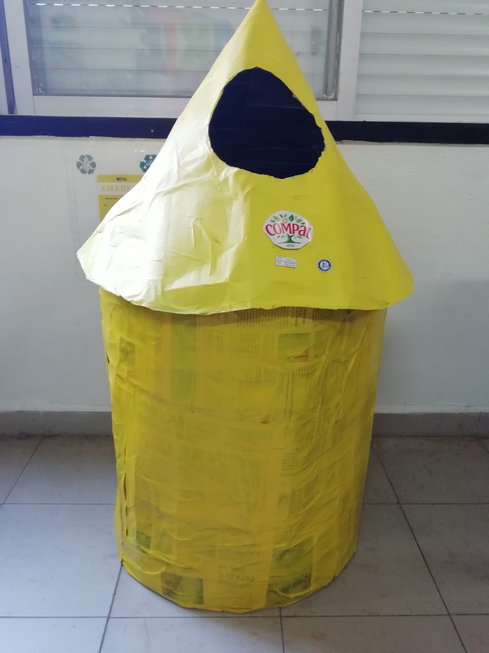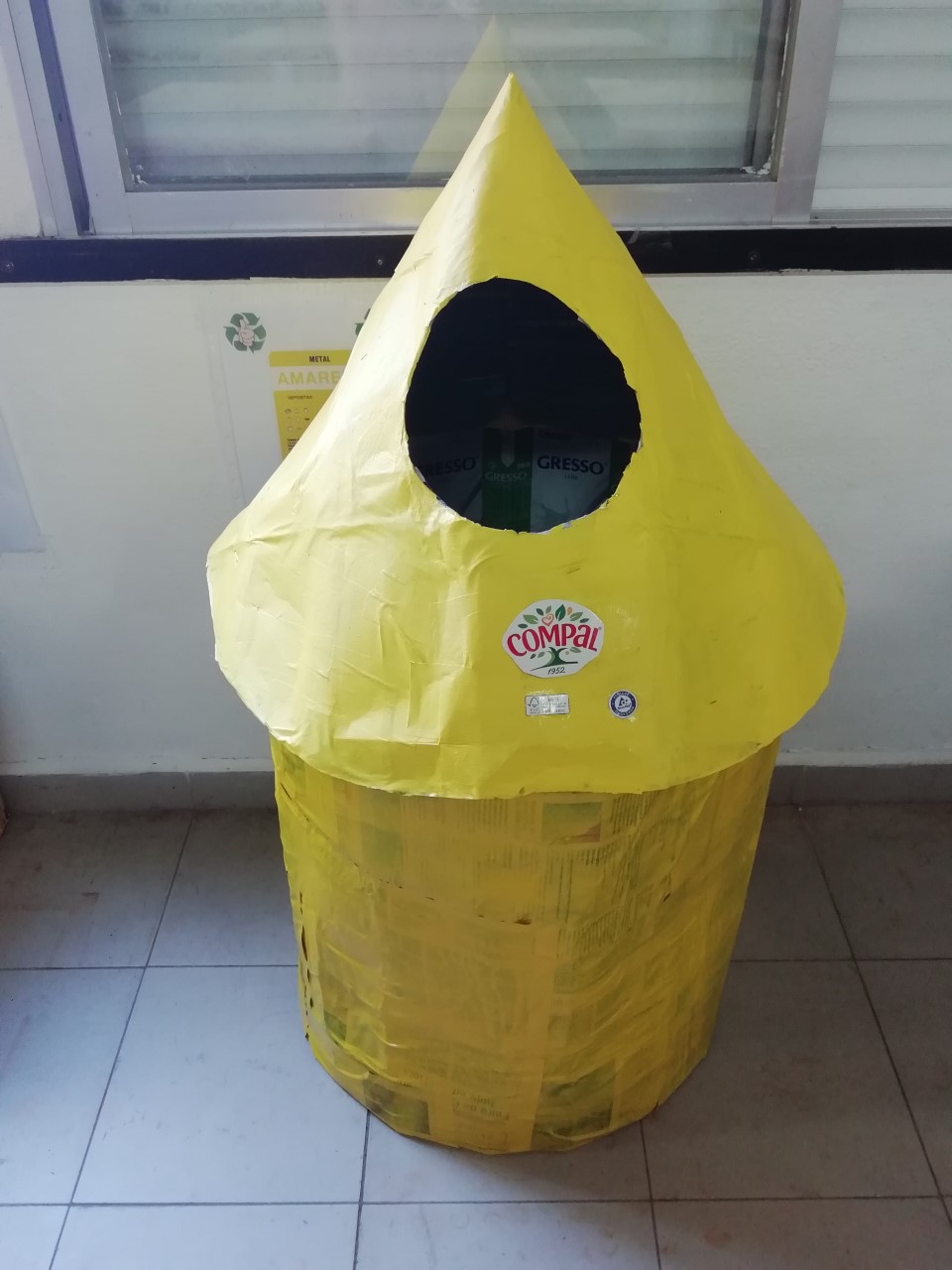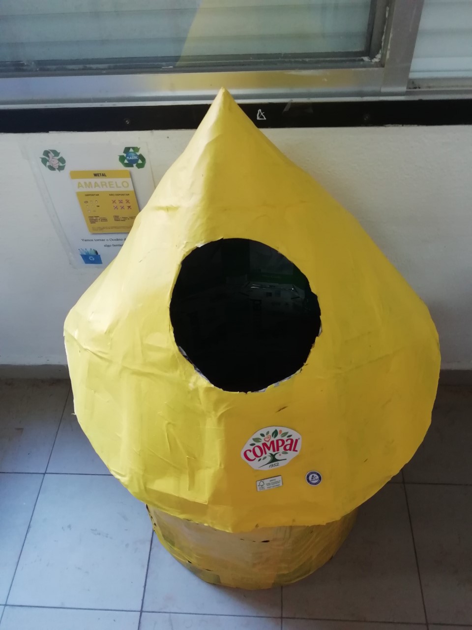 Após o desenho do projeto e da recolha de embalagens tetra park (embalagens de leite e compal) os alunos passaram para a concretização do ecoponto.