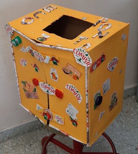 As alunas envolvidas no projeto começaram por recortar algumas partes de uma caixa de fraldas descartáveis. De seguiram pintaram a caixa de branco, com uma primeira camada, e de seguida com uma camada de cor amarela. Foi criado uma abertura retangular na parte superior para deposição dos resíduos, enquanto a abertura na parte de trás da caixa será utilizada para remoção do saco de resíduos. Entretanto foram recortadas as embalagens Tetrapak da Compal para decoração do ecoponto, sendo destacadas as partes em que é visível a palavra Compal e o símbolo FSC. Na parte superior do ecoponto, em volta da abertura retangular foram coladas as letras em papel de jornal e revistas, que formam a palavra “ecoponto”. Em volta da caixa foram colados os recortes das embalagens Tetrapak da Compal. Na abertura frontal foram coladas três tiras de velcro para permitir abrir e fechar de forma fácil, para remoção dos resíduos e substituição do saco interior. Nestas tiras foram também coladas tampas e partes das embalagens da Compal.