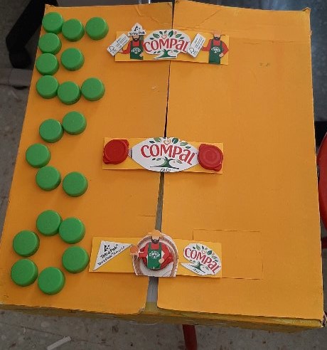 Neste trabalho foram utilizados os seguintes materiais: caixa de cartão de fraldas descartáveis, restos de cartolina, embalagens Tetrapak da Compal, incluindo algumas tampas de plástico, tintas, cola quente e tira de velcro.