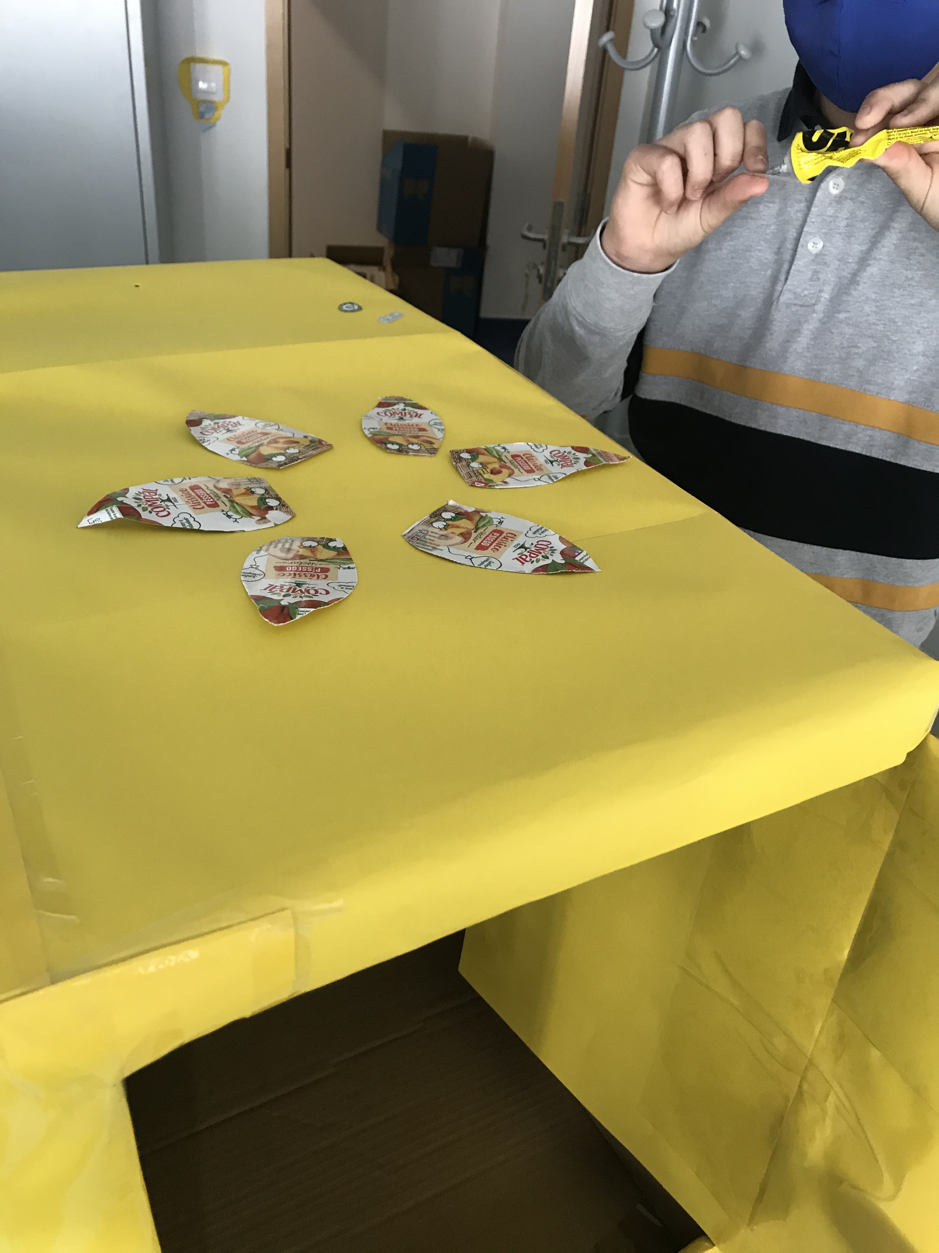 Em primeiro lugar os alunos, com a ajuda das professoras coordenadoras do Projeto Eco-Escolas, selecionaram uma caixa de papelão com dimensões apropriadas para o efeito. A caixa foi adaptada e forrada com papel amarelo. Em seguida, os alunos recortaram os símbolos da Tetra Pak da marca Compal, o símbolo FSC e partes das embalagens com os frutos e a palavra “Compal”.