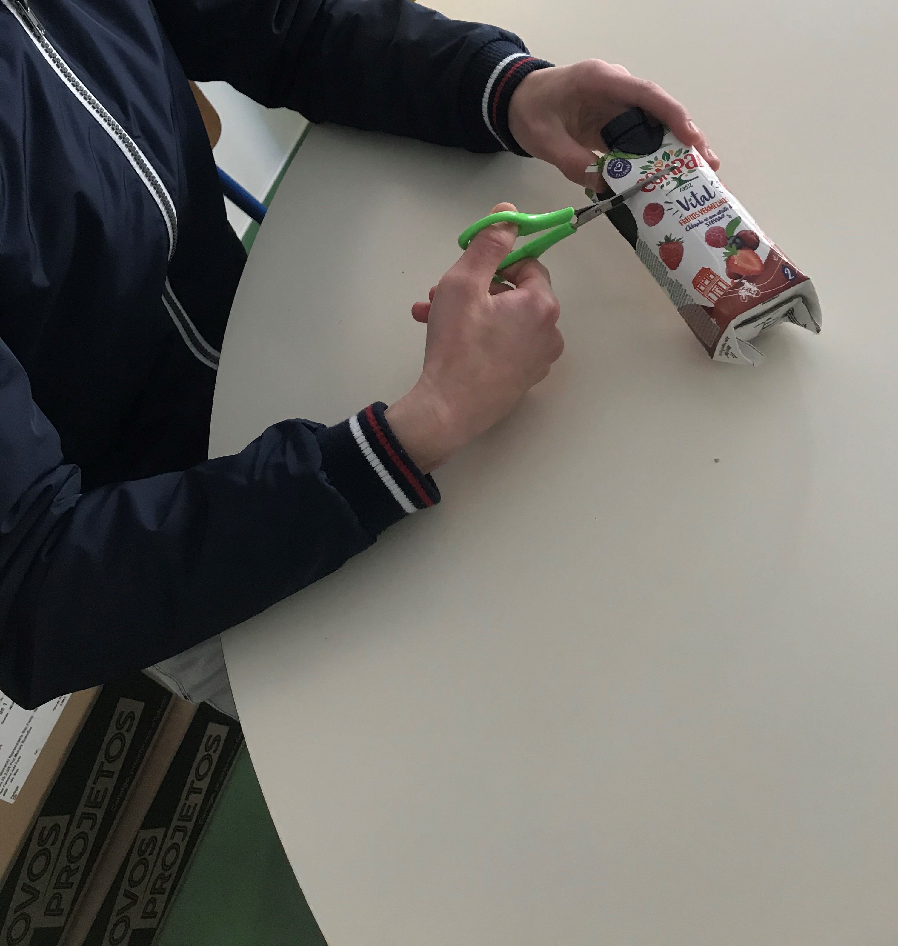 Mais tarde, os alunos deram aso à sua criatividade e puseram mãos à obra, decorando a caixa. Faz parte da decoração a identificação do Ecoponto com as letras da palavra “EMBALAGENS”, o símbolo da reciclagem e algumas embalagens em 3D. Todas as decorações foram coladas com cola líquida. No final, o Ecoponto foi forrado com plástico autocolante para proteger e ter uma maior durabilidade.