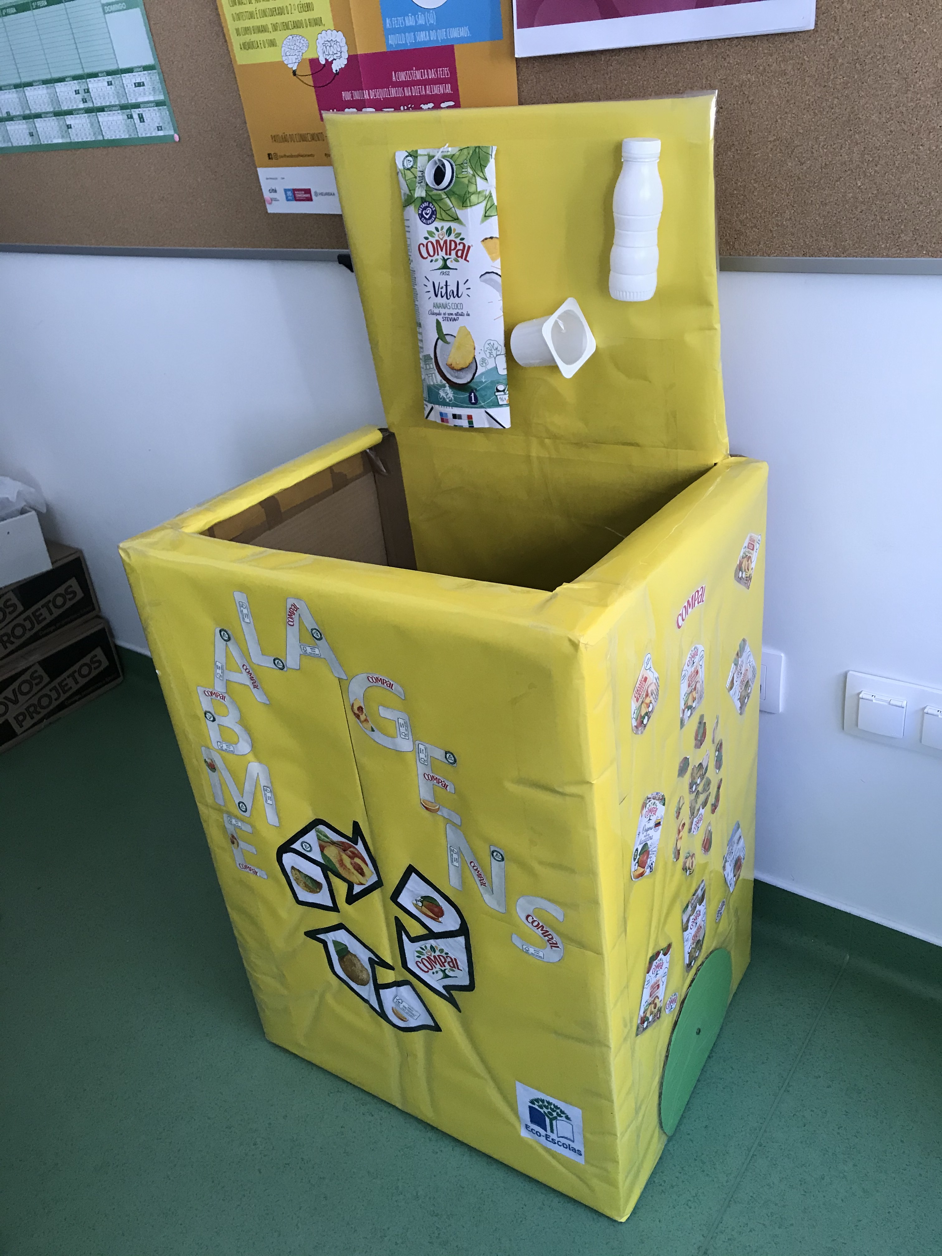Os alunos do 7º ano, com idades compreendidas entre os 12 e os 14 anos, com o objetivo de sensibilizar toda a comunidade educativa, para a importância da reciclagem e proteção do ambiente, recolheram embalagens da Compal. As embalagens foram devidamente preparadas para fazer o recorte e, assim, poderem decorar o Ecoponto amarelo.