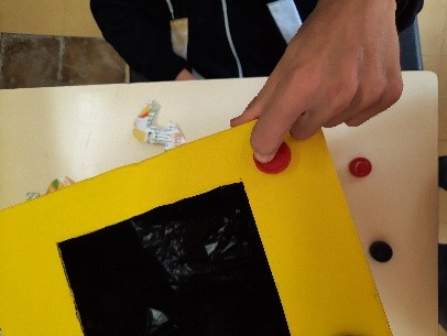 Processo de construção: Iniciou-se com o recorte das tampas de duas caixas de papelão com o auxílio dos professores. Prosseguiu-se com a pintura das mesmas pelos alunos, tendo sido necessário aplicar várias camadas de tinta amarela, de modo a obter uma maior cobertura; recorte de várias embalagens; colagem das mesmas e de tampas; colocação em espaço comum na escola, especificamente nos corredores.