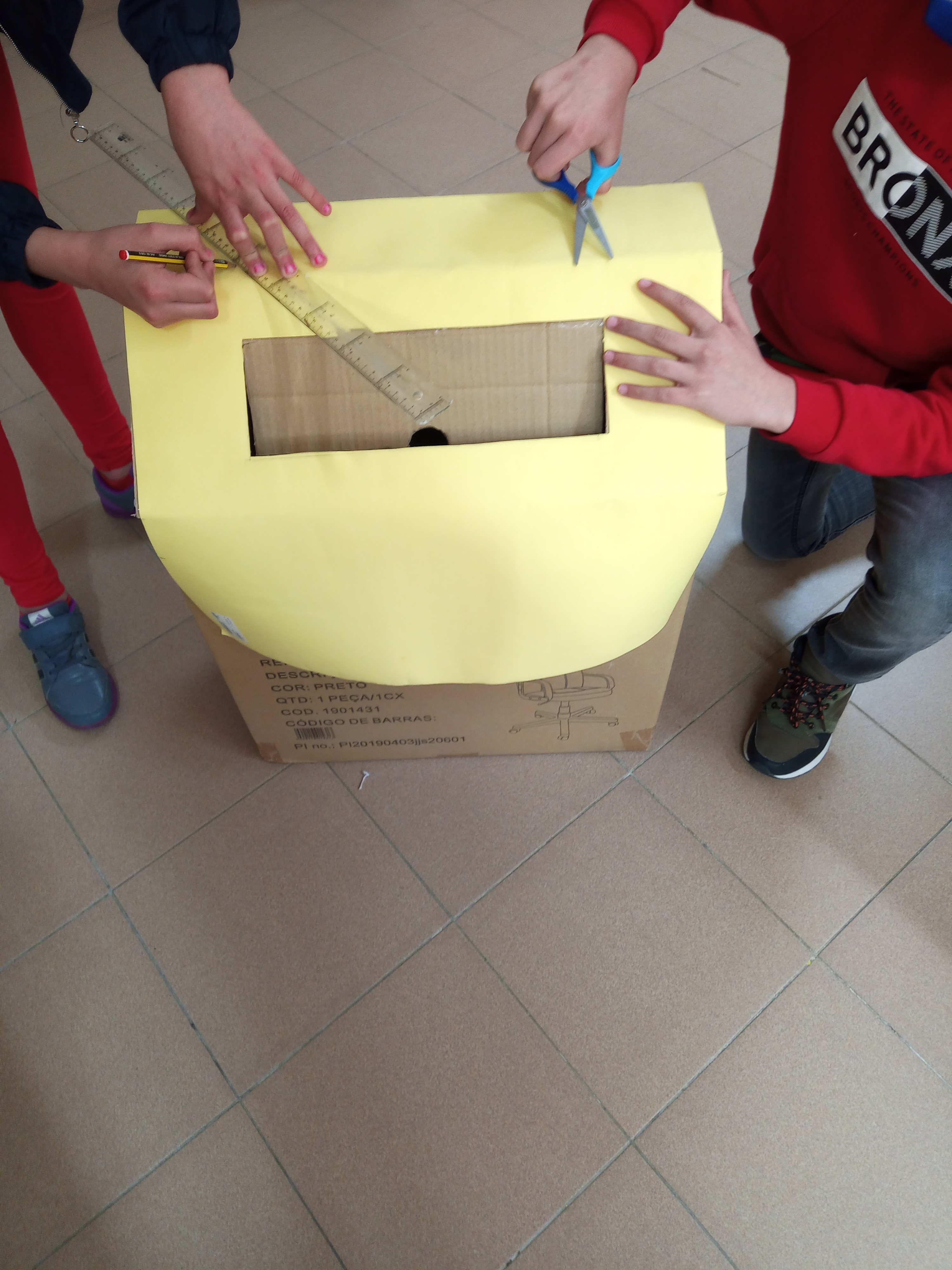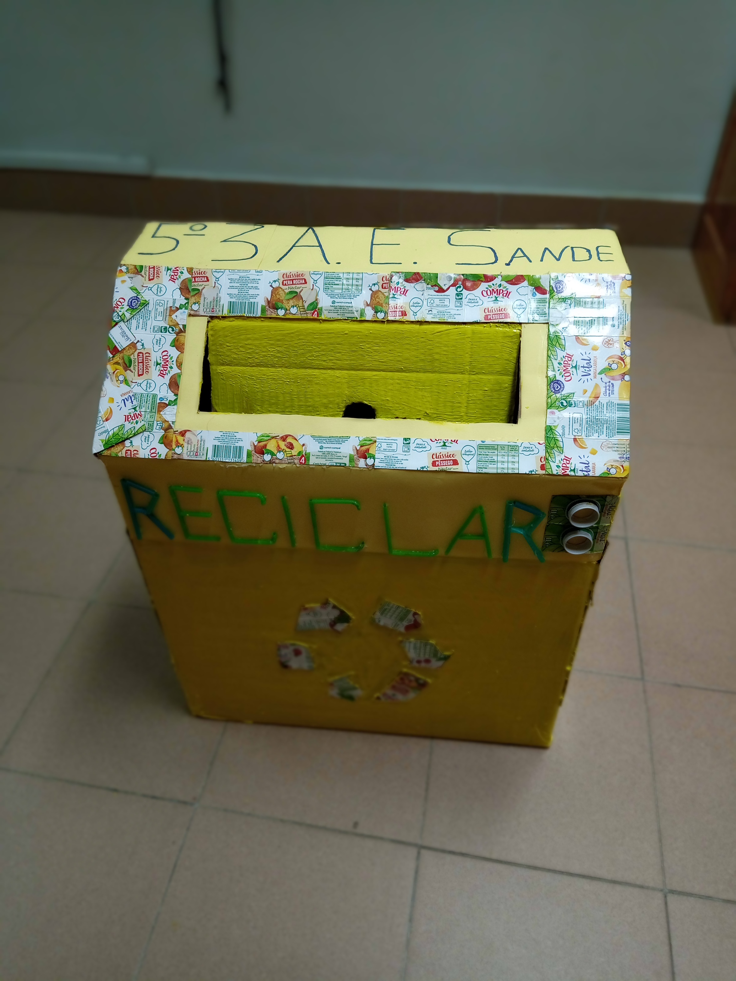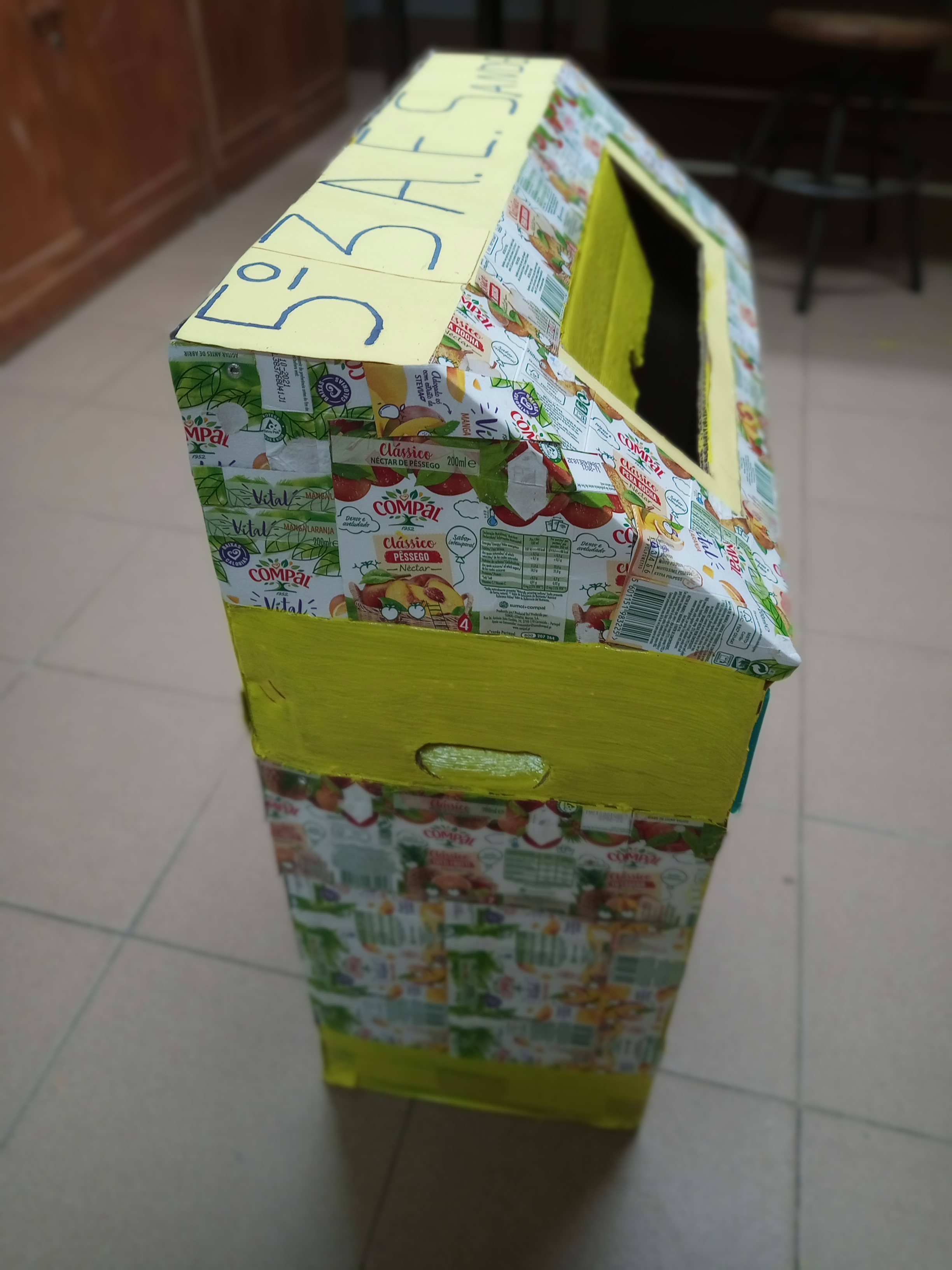 Os alunos da turma 5.º 3, com a coordenação do professor de Educação Tecnológica e da Diretora de Turma, construíram um Eco Ponto Amarelo. Utilizaram uma embalagem de cartão e elaboraram o projeto, fizeram os acabamentos com guache amarelo, e colagem de embalagens TetraPak da Marca Compal.