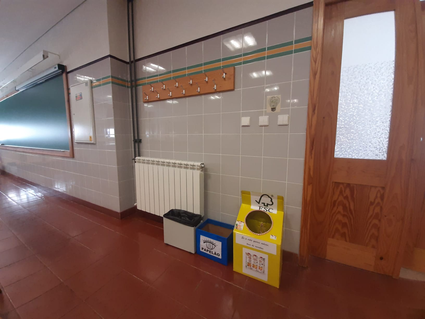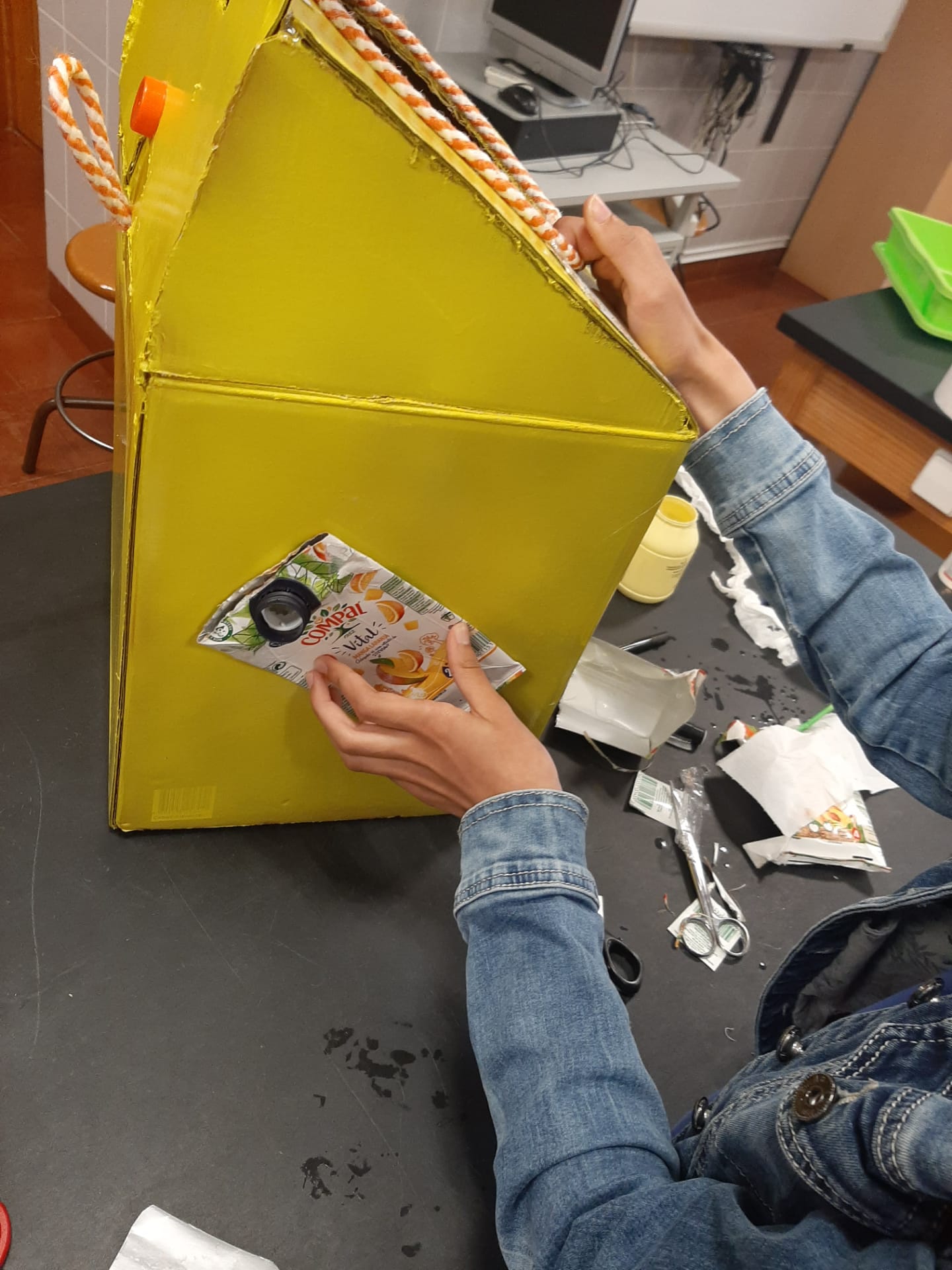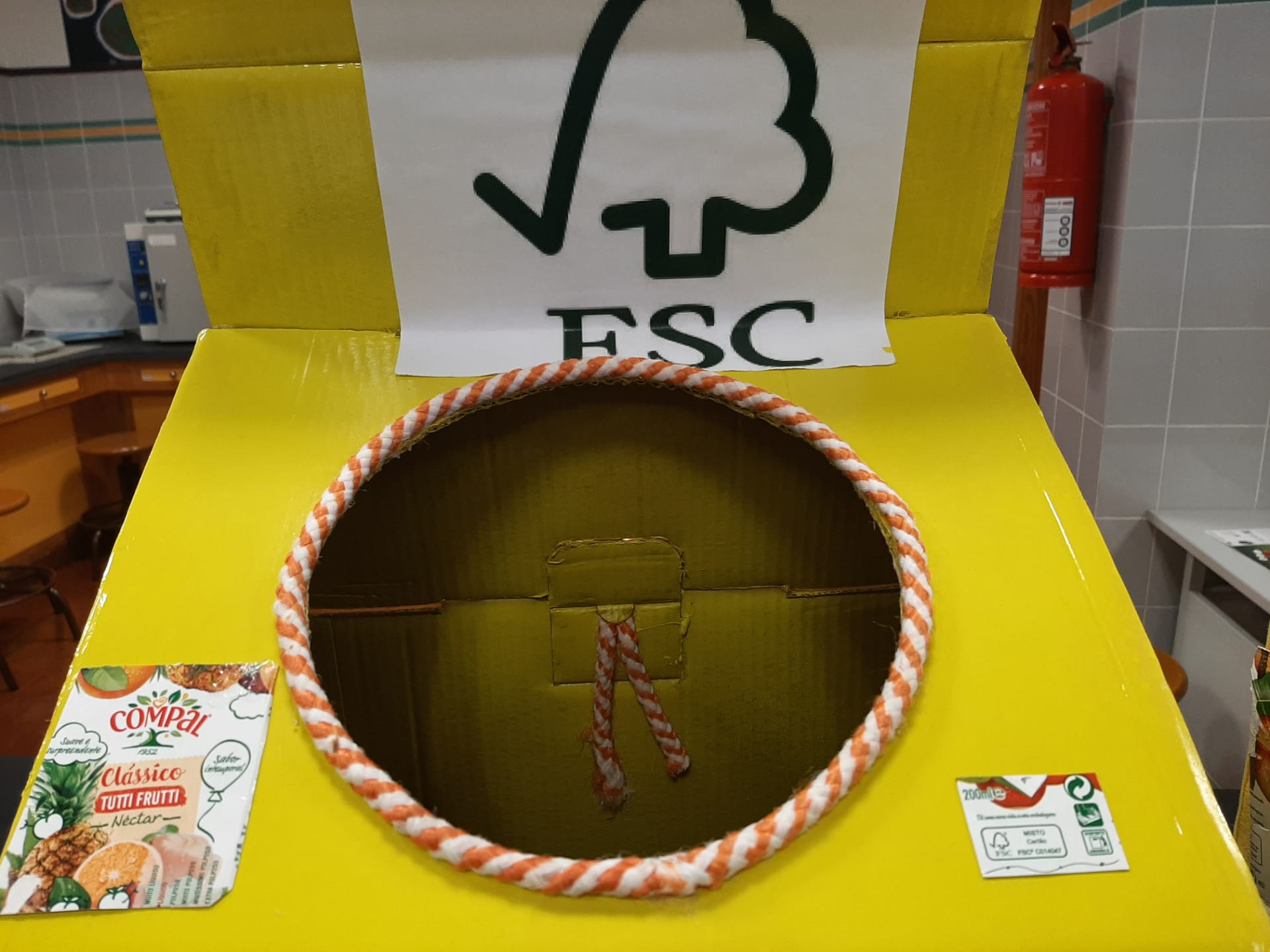 Depois da tinta estar seca, abri um buraco redondo para poderem ser enfiadas as embalagens e outro buraco atrás, com tampa que abre e fecha , para retirar o saco depois de cheio.