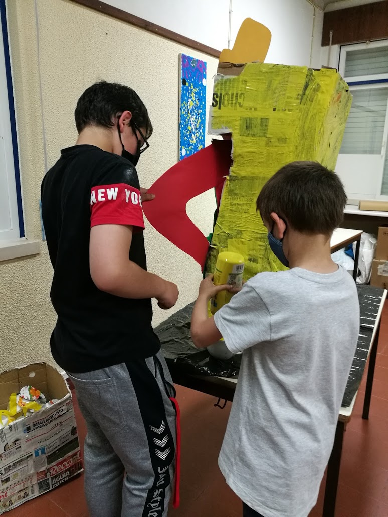Recorreram à reutilização de tabela de basquetebol, caixas de cartão para construir o Ecopontos, embalagens de Compal, jornal, tinta, restos de cartolina, …