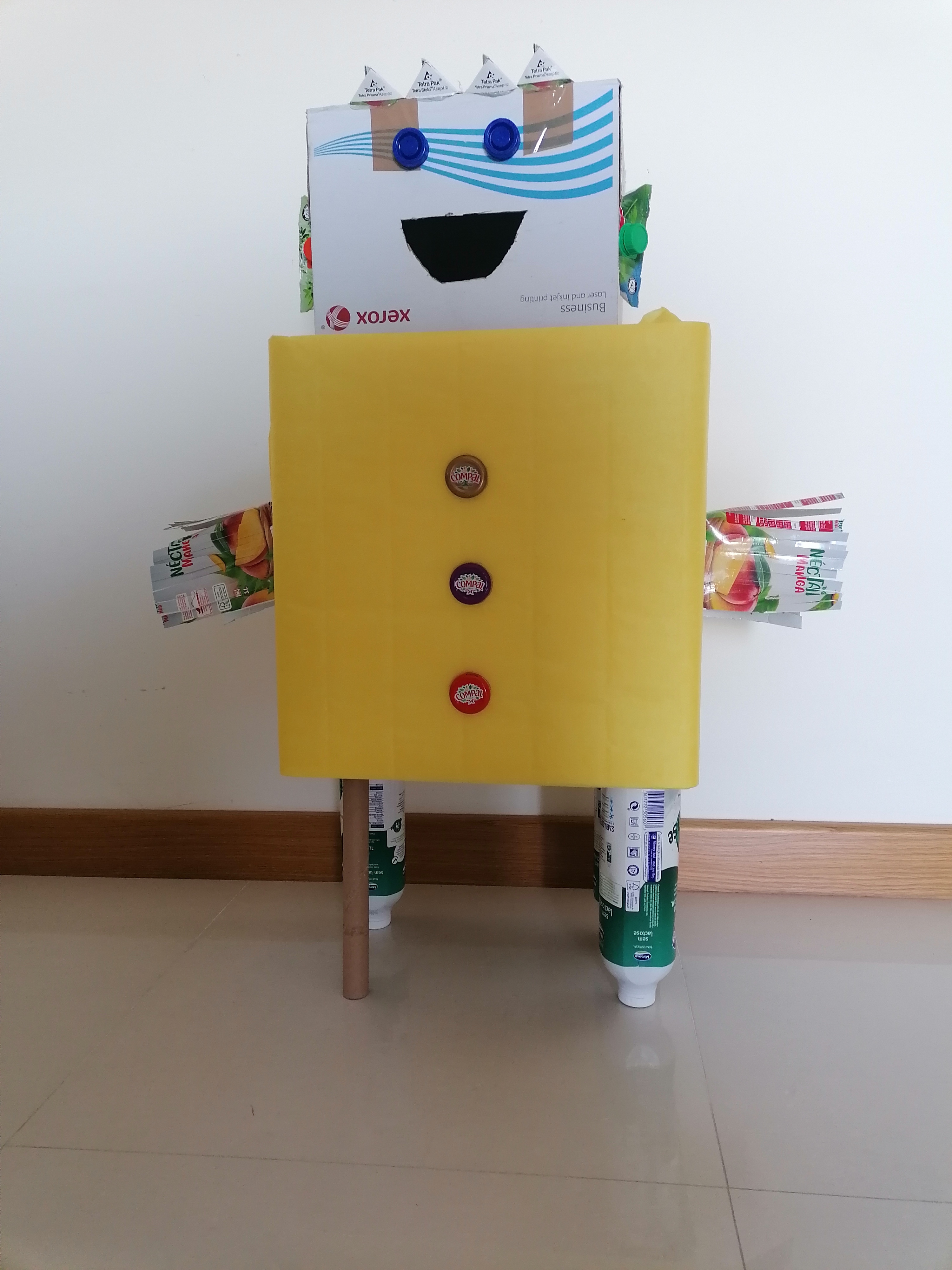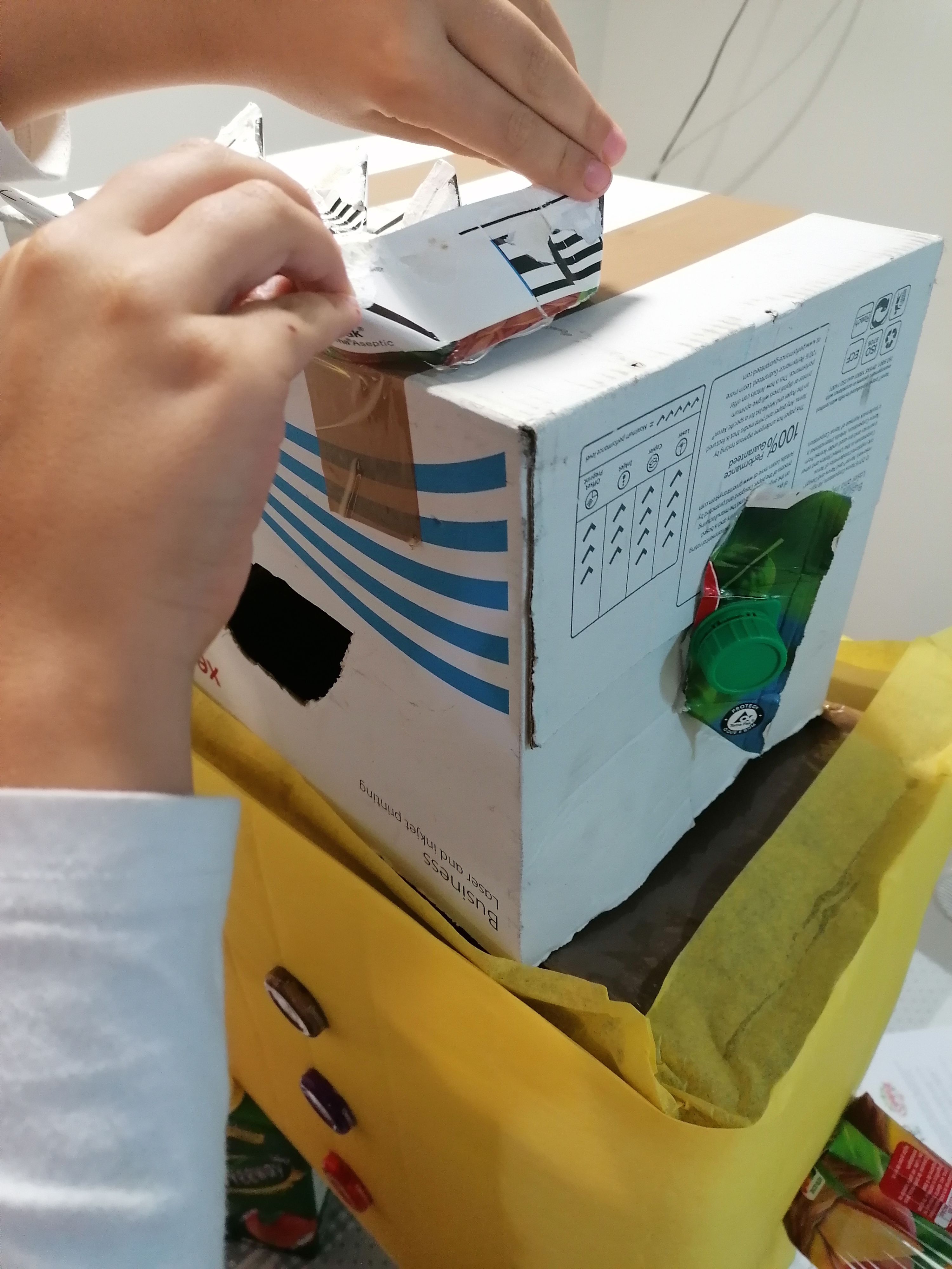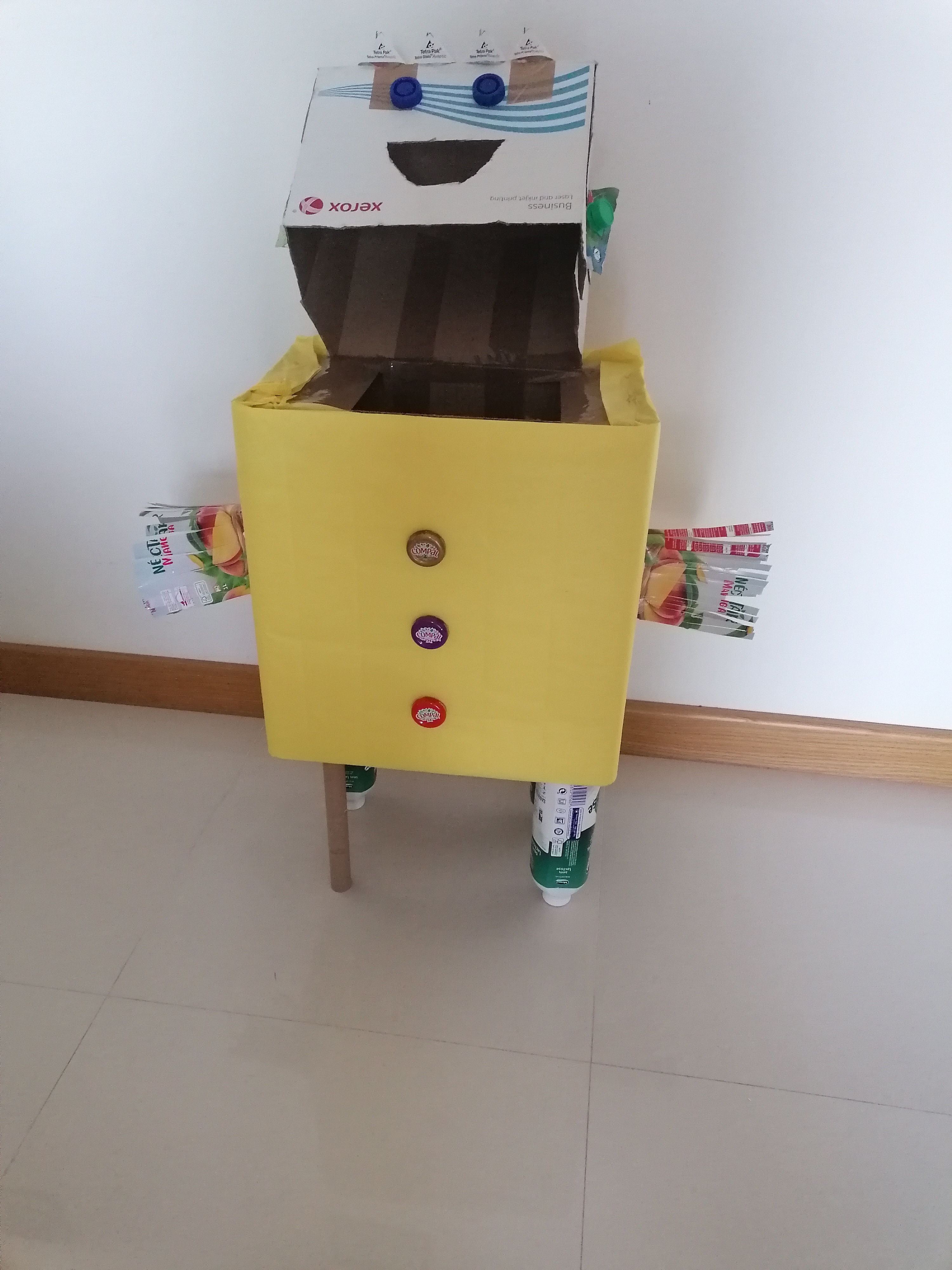O desafio foi lançado a alguns alunos do 6ºAno que, individualmente realizaram o seu ecoponto amarelo. Para a construção deste ecoponto o aluno usou embalagens de leite, de sumo e caixas vazia para a estrutura do corpo. Aproveitou as tampas de lata da Compal para os botões e usou tampinhas de iogurtes para os olhos.