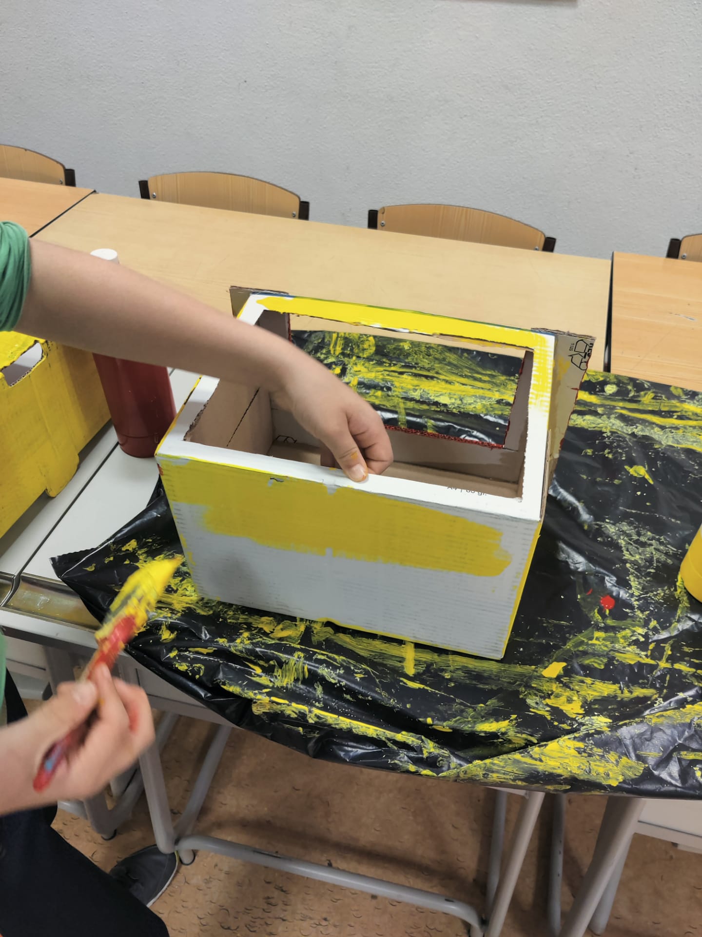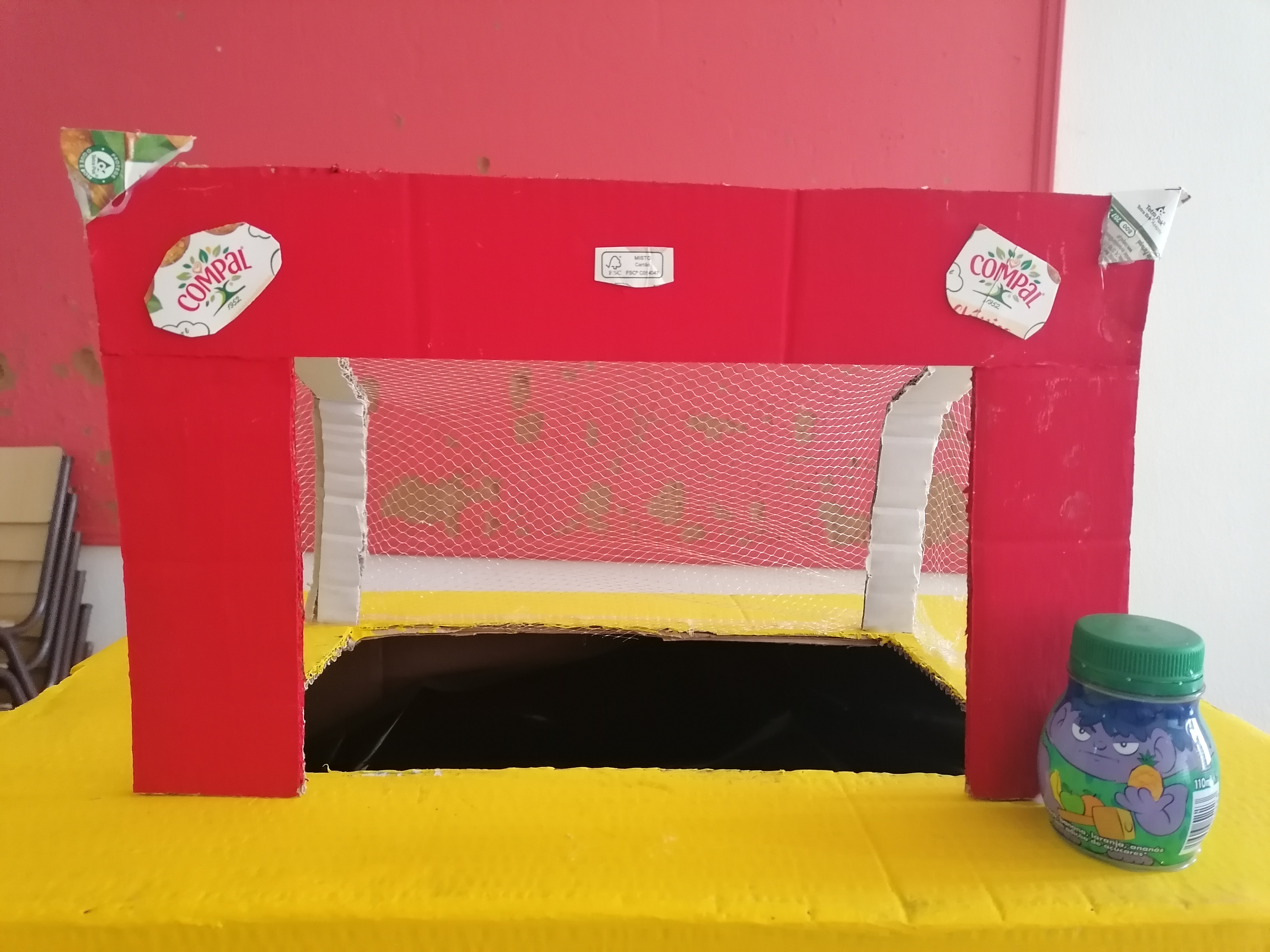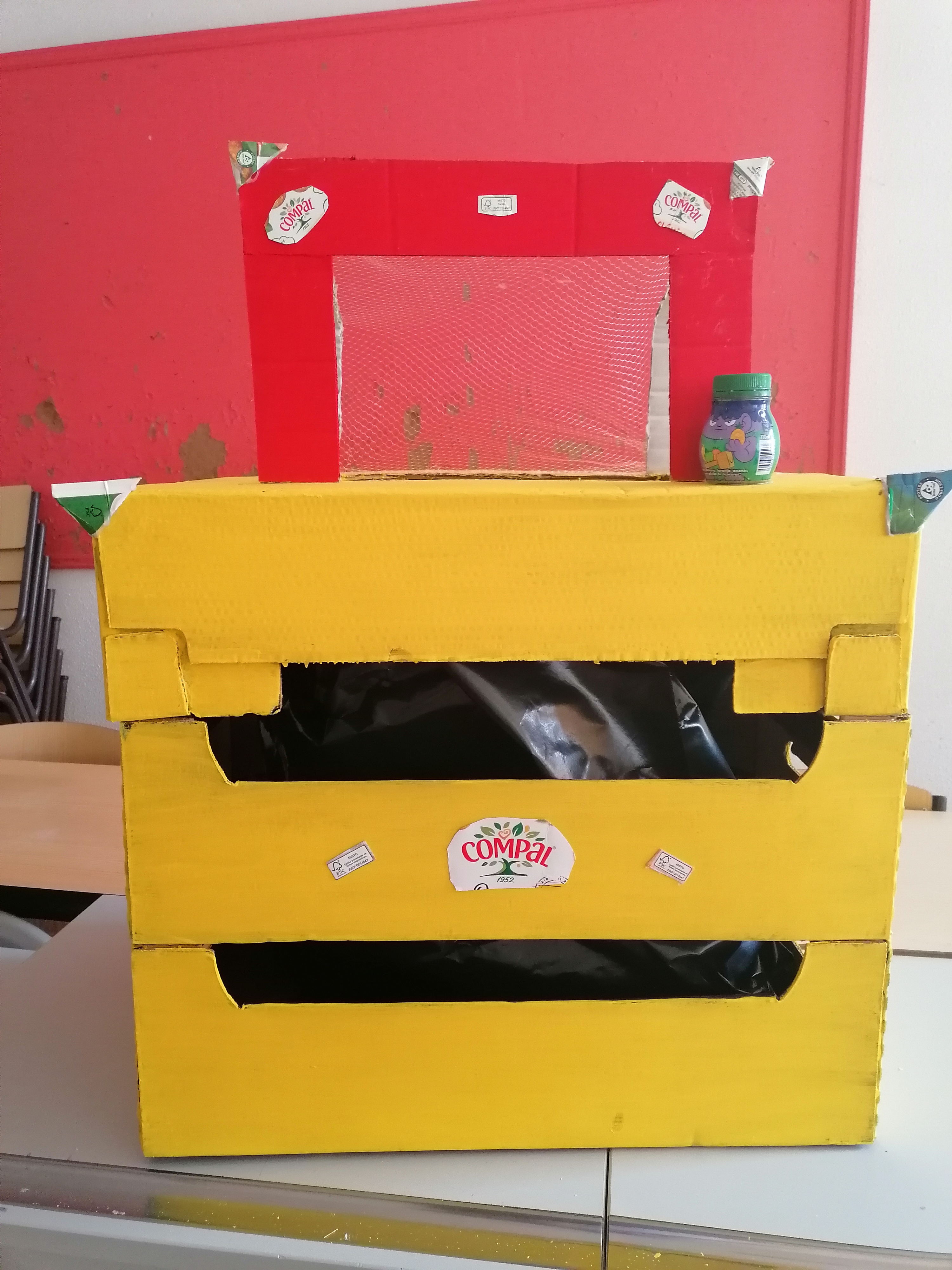 Para a elaboração deste Ecoponto o aluno optou por utilizar caixas de fruta vazias. inicialmente tinha usado uma caixa para fazer a baliza, mas depois utilizou rede dos brinquedos para elaborar esta, sendo que optou por decorar o ecoponto com os símbolos solicitados.