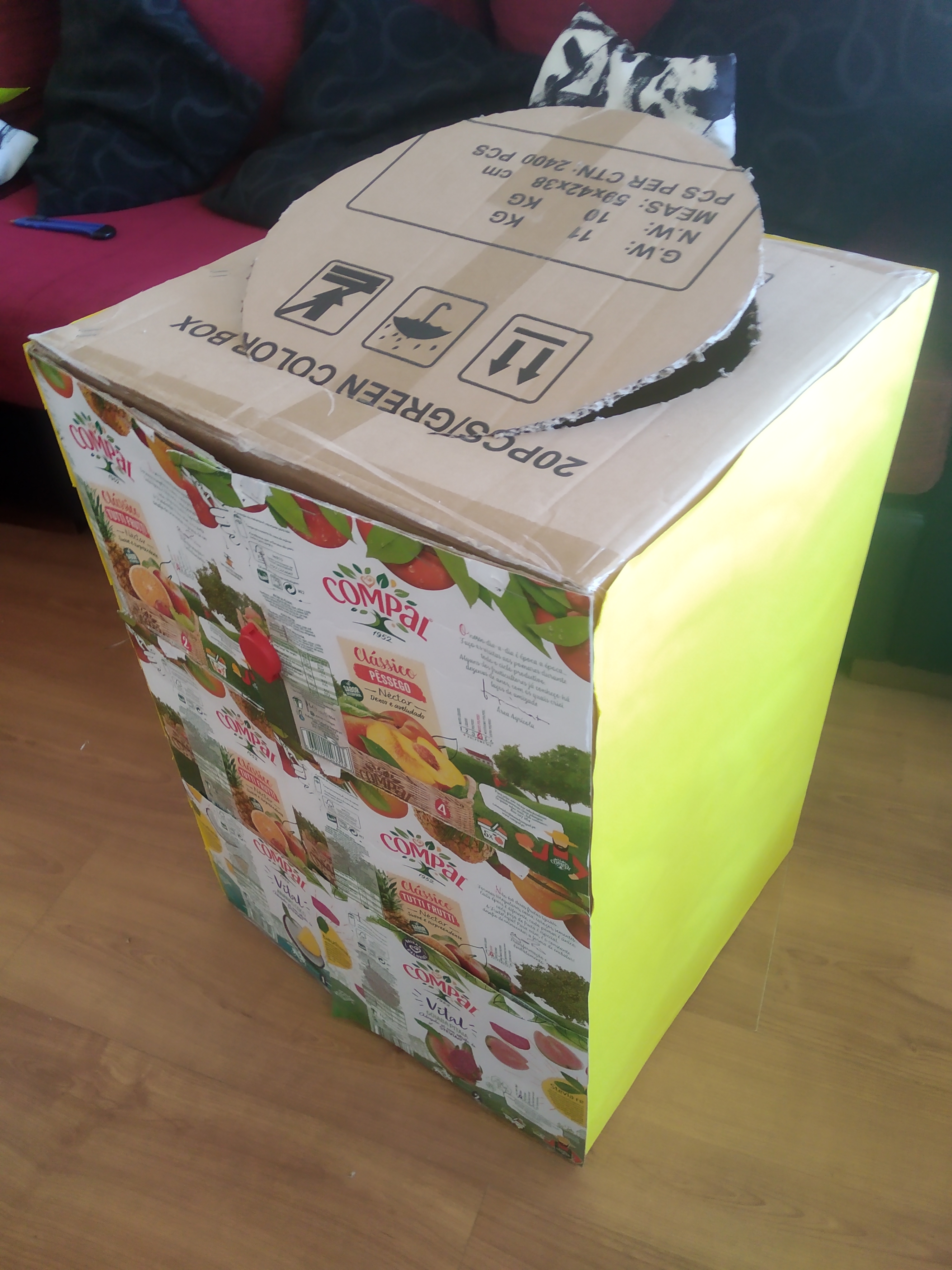 Inicialmente, foram feitas pesquisas na internet para se obterem ideias para a construção do ecoponto. Depois foi imaginado e discutido o produto final e passou-se imediatamente à construção. Reutilizando uma caixa de cartão, fez uma abertura circular na parte de cima e revestiu-se a caixa com papel EVA amarelo em 3 das faces laterais, sendo a quarta face revestida com as embalagens Tetra Pak da Compal. Esta última face foi cortada a meio, verticalmente, de maneira a poder abrir, e usou-se uma rolha das garrafas para poder fechar.