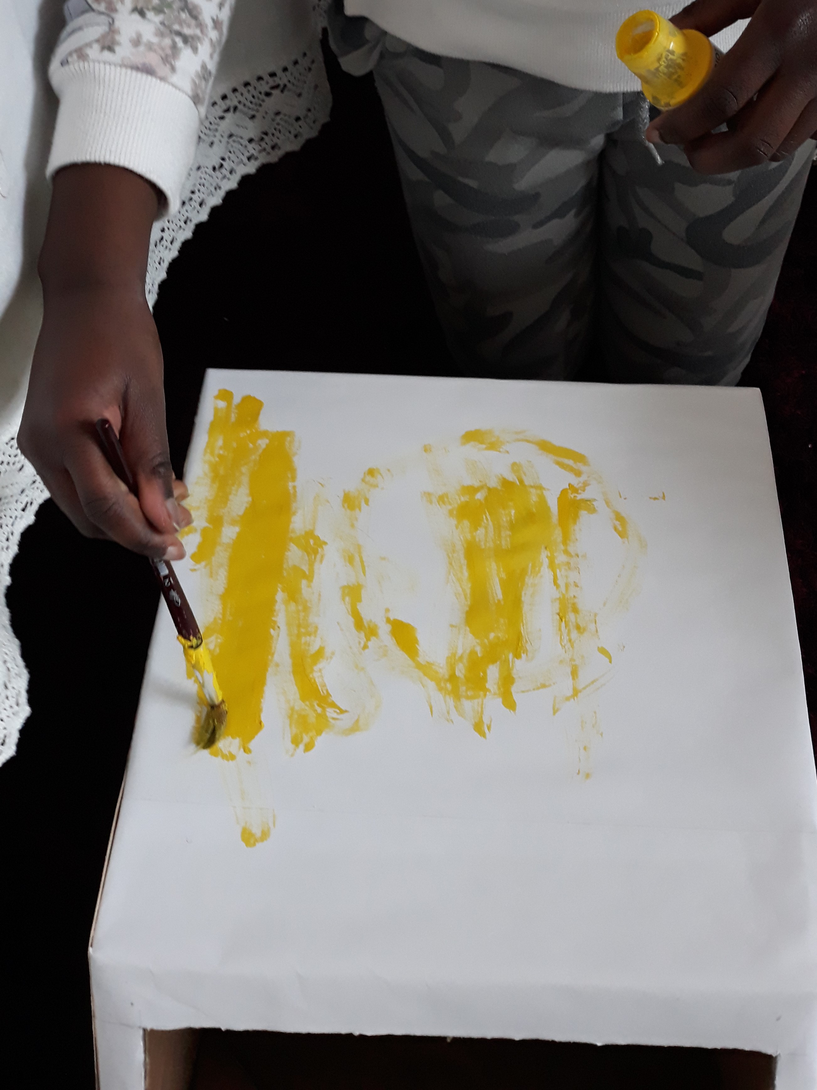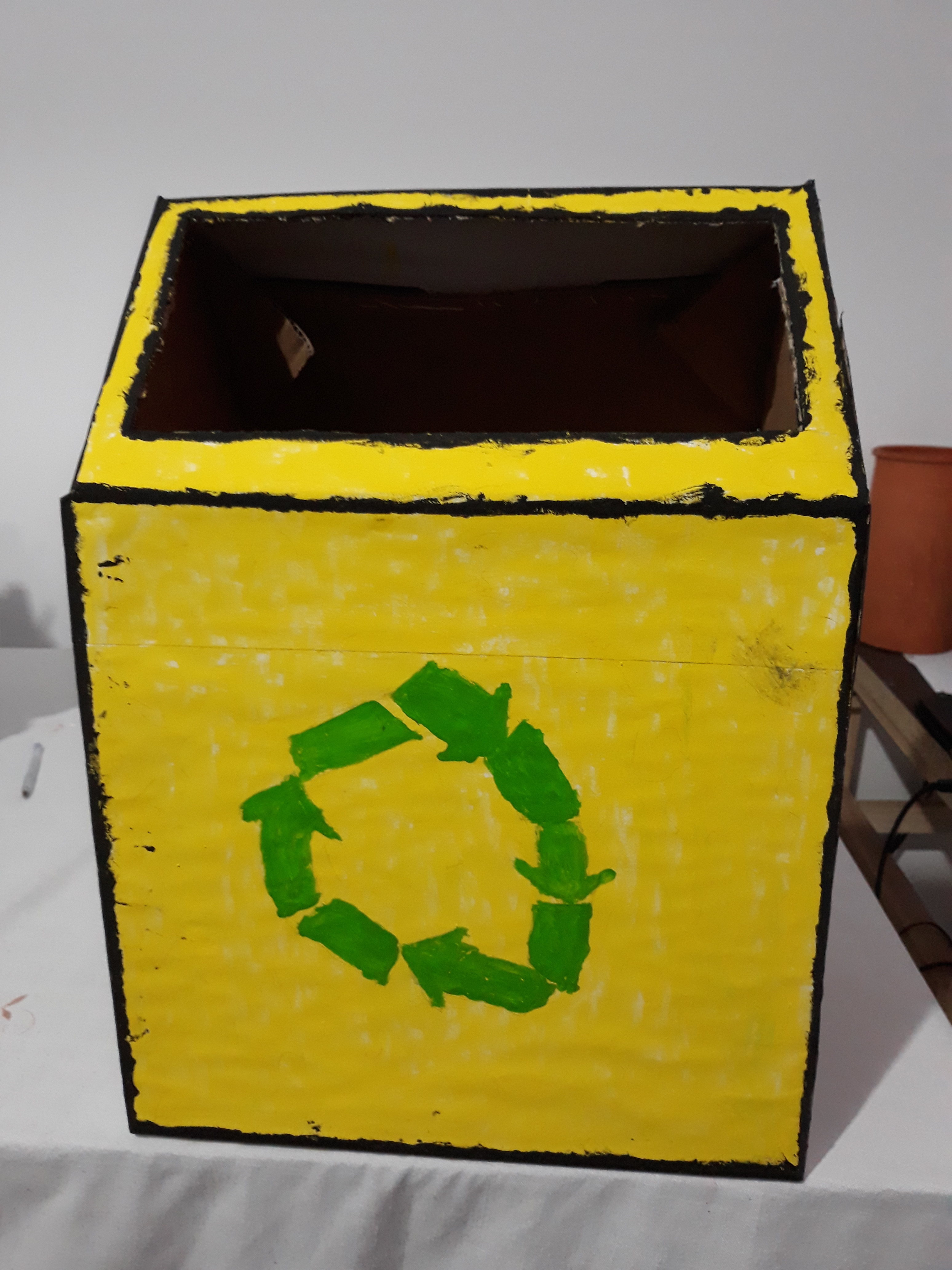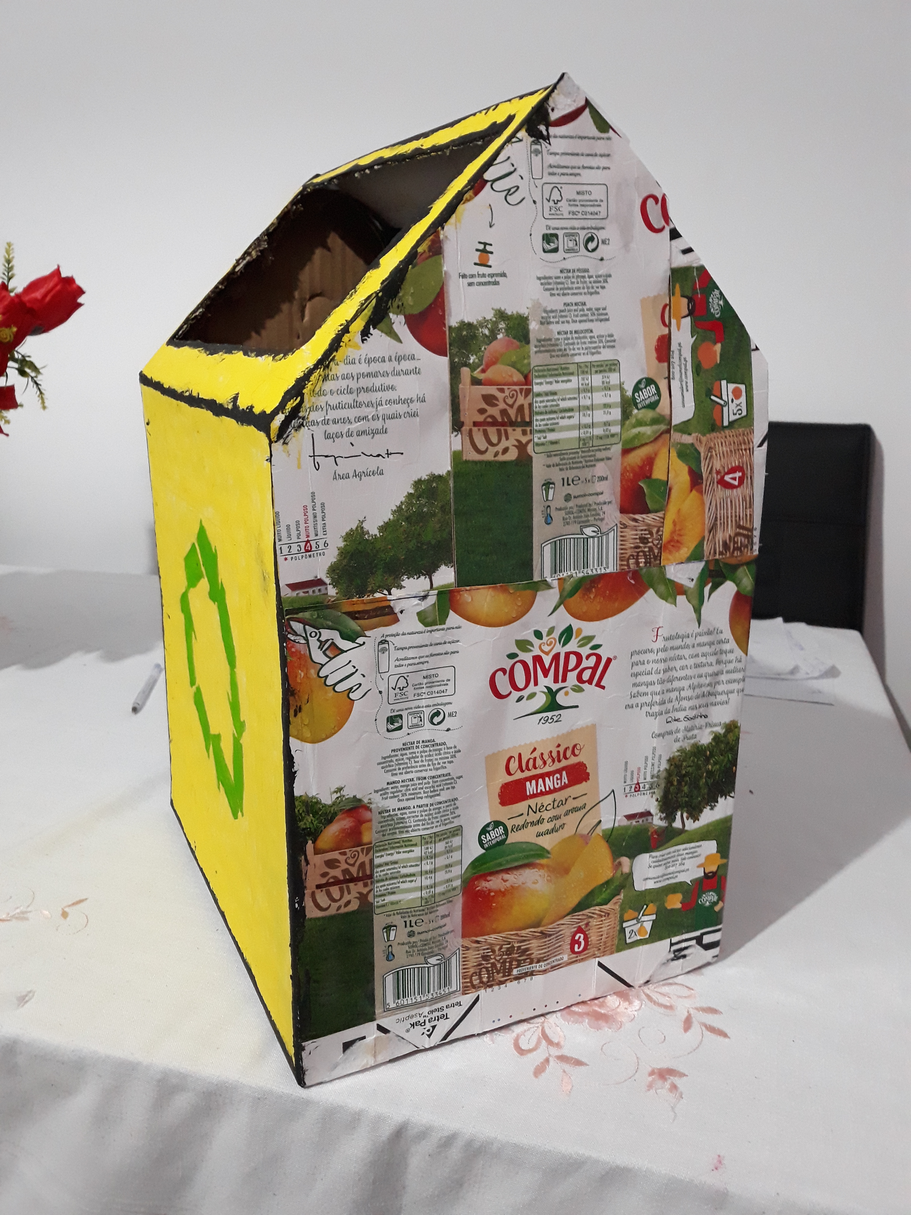 Na parte frontal forrar com papel branco e pintar com tinta amarela. Abrir uma abertura no topo da caixa e desenhar o símbolo da reciclagem na frente do ecoponto.