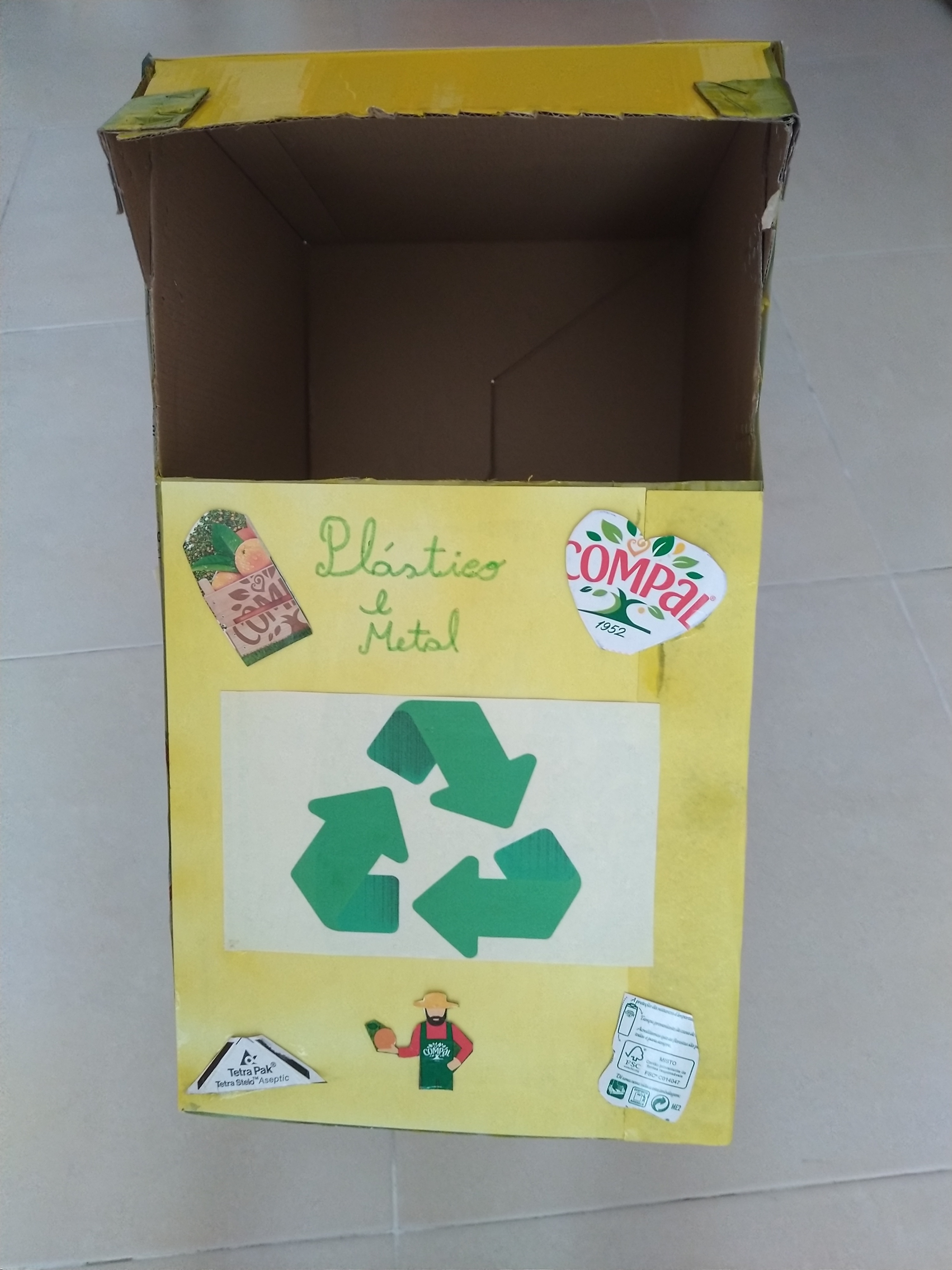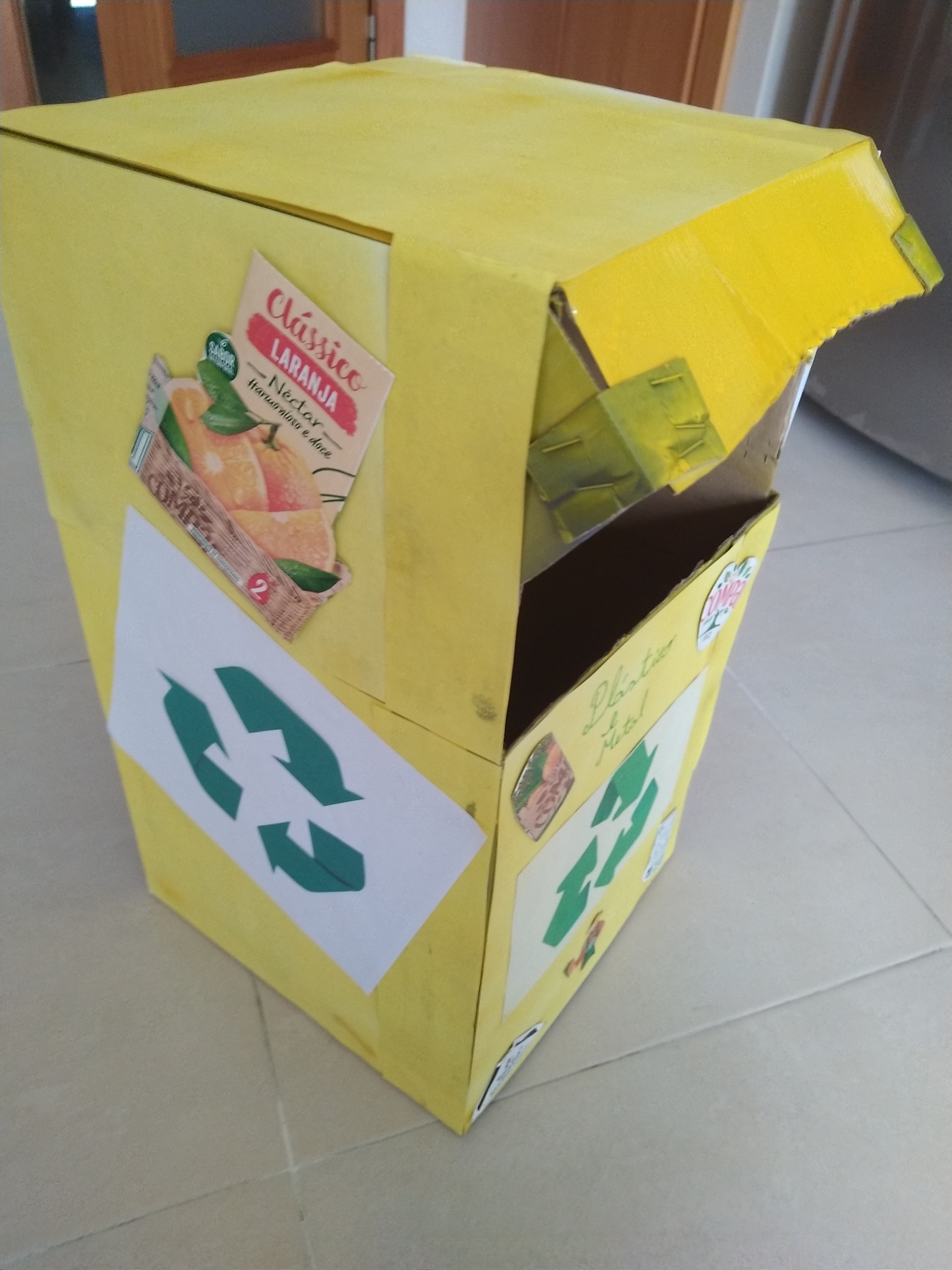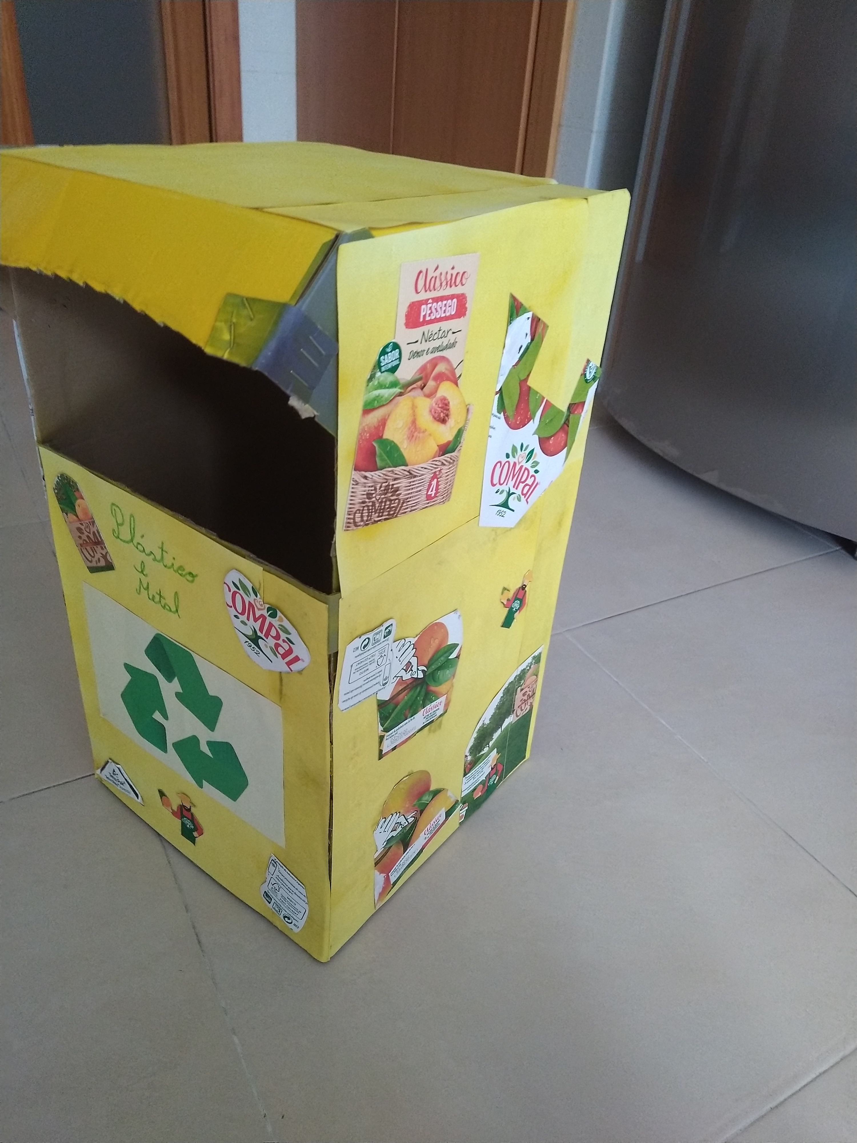 Juntar duas caixas de cartão e deixar uma abertura. Forrar com papel amarelo o ecoponto. Desmanchar umas embalagens da Compal e forrar com partes delas as partes laterais e a parte frontal.