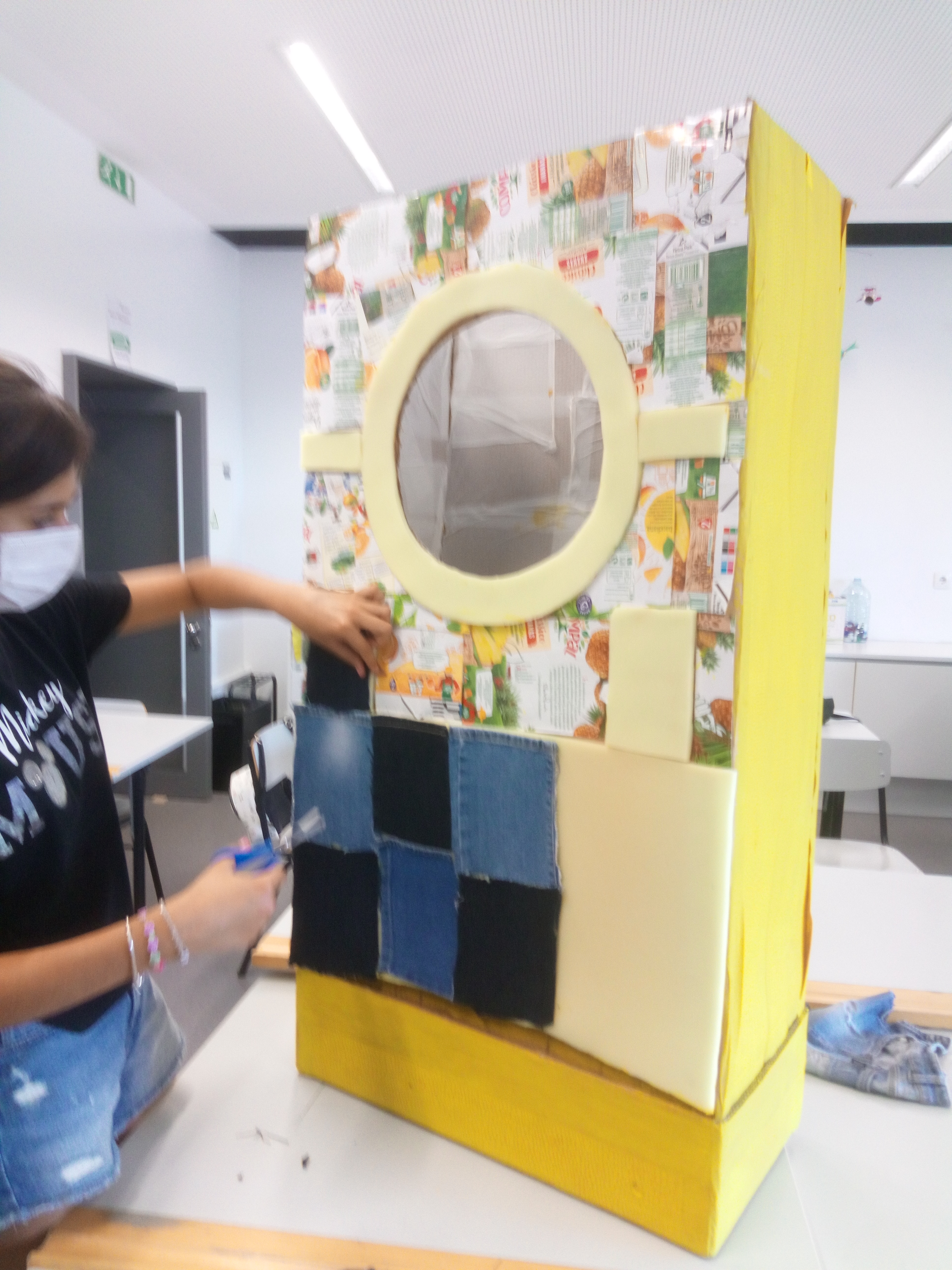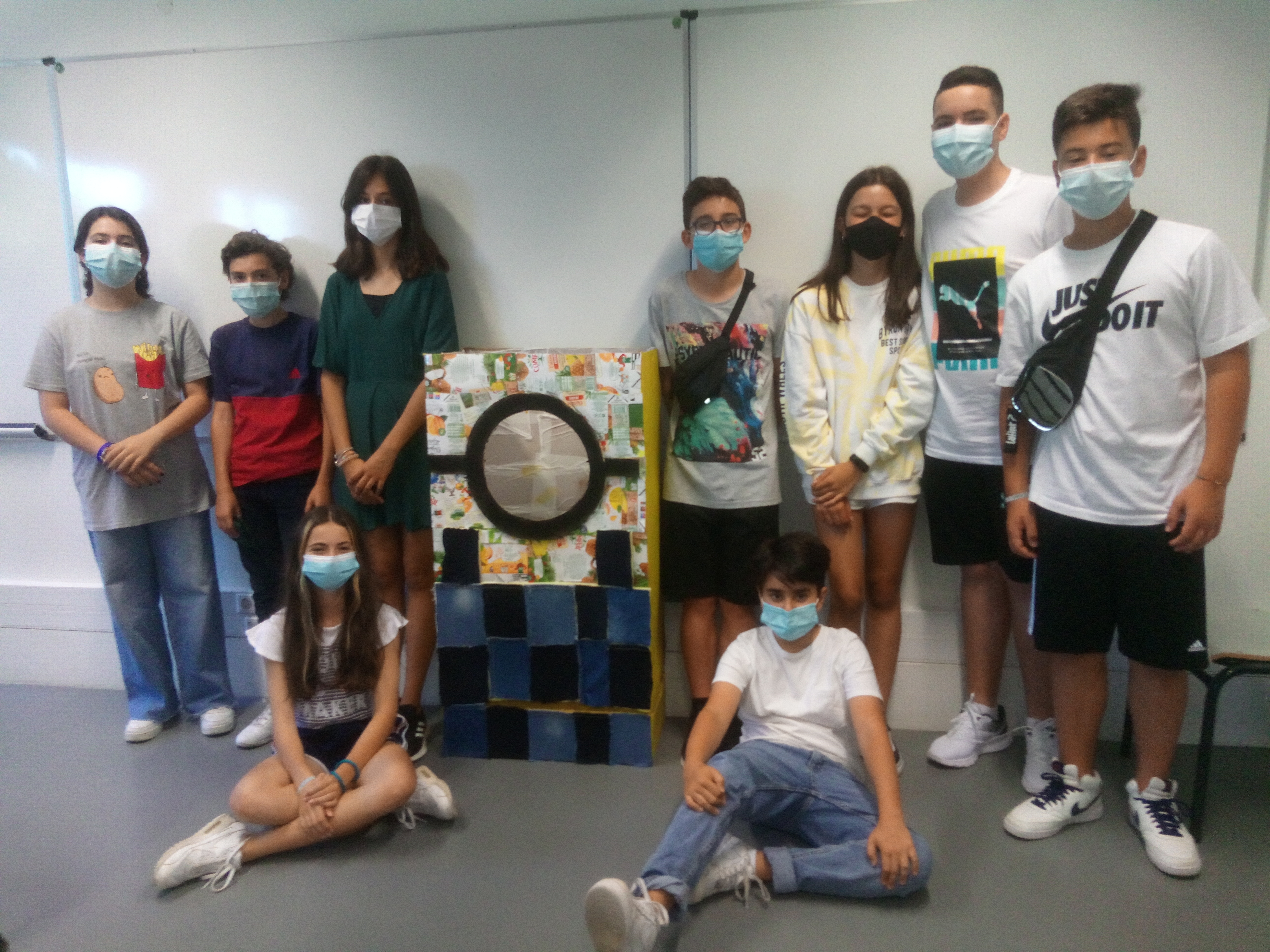 A turma do 7ºB desenvolveu o Desafio numa atividade interdisciplinar de Educação Visual e Educação Tecnológica. Divididos em grupos fizeram um estudo inicial da forma e funcionalidade. Desenharam e planificaram o contentor. Posteriormente construíram o contentor e decoraram-no. Este grupo optou por decorar parte do ecoponto com restos de ganga de calças usadas, além desse material usaram foram caixas de cartão, embalagens Tetra Pack de Compal, tesouras e cola.