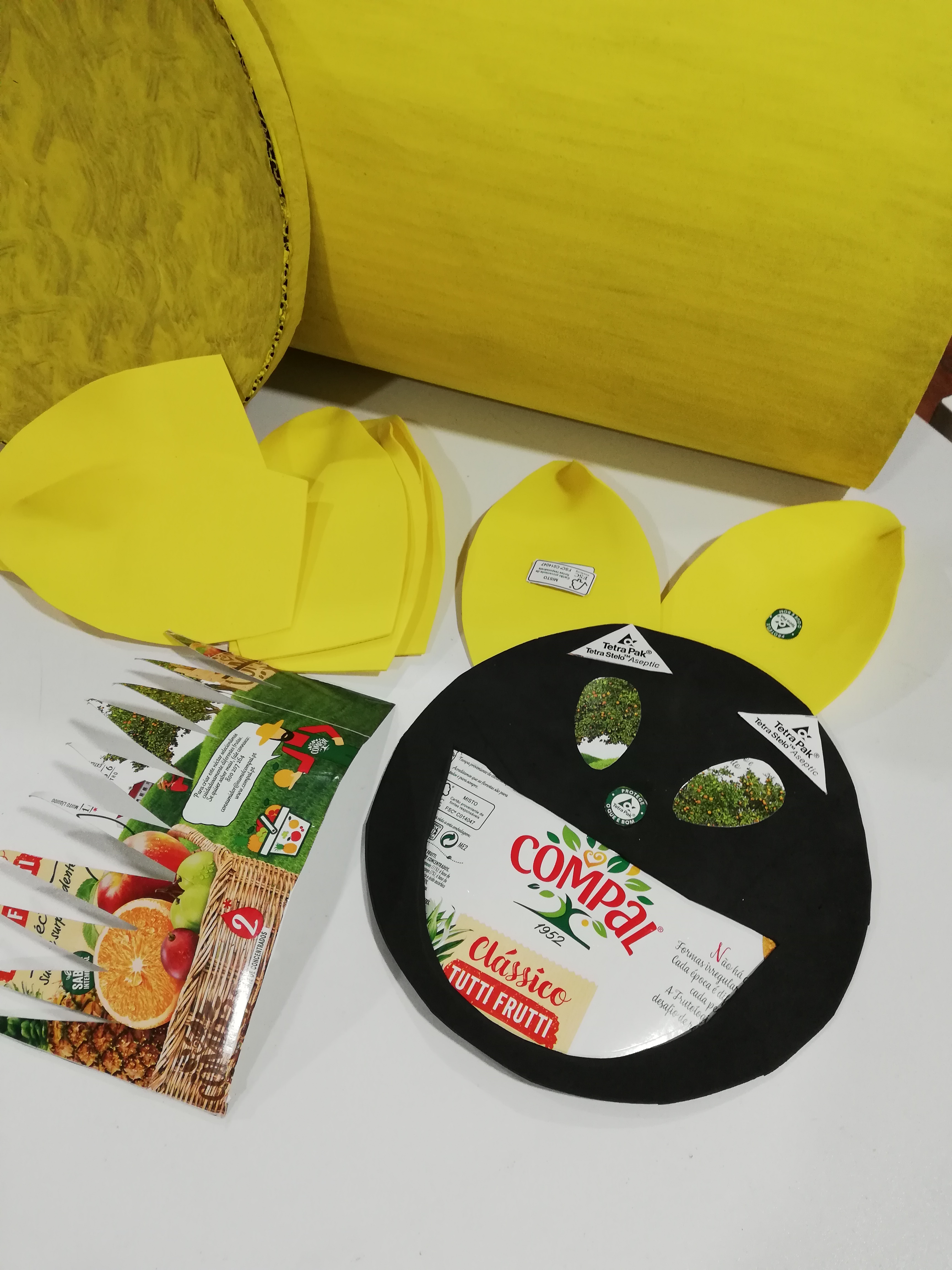 Materiais: Caixa de cartão, embalagens Tetra Pack da Compal, cartão e tinta amarela.