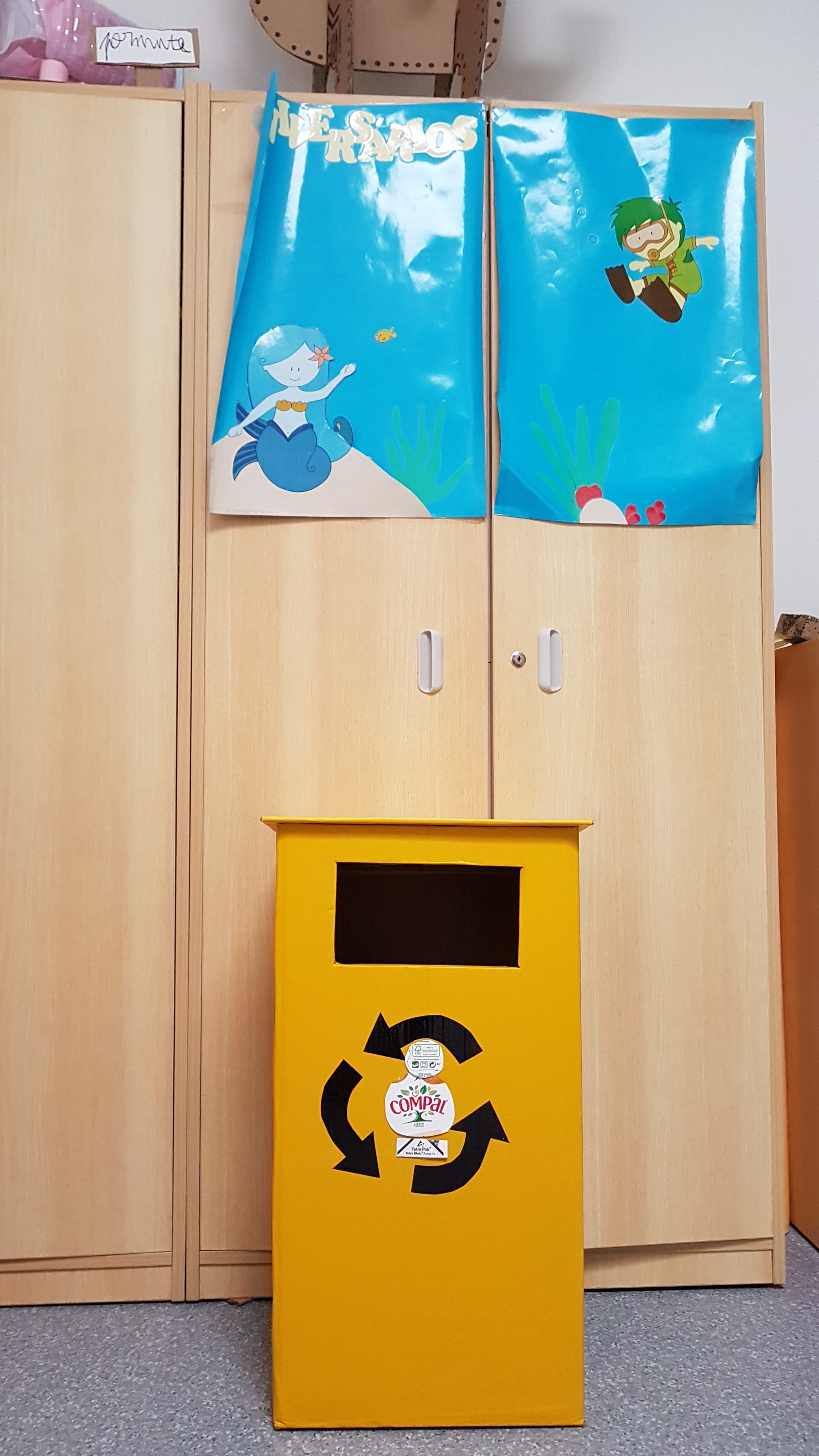 Aproveitámos uma caixa de cartão velha e cortámos a parte superior de que não precisávamos. Abrimos uma janela na caixa para servir de entrada para as embalagens. Tivemos que ter um cuidado muito especial porque utilizámos um x-ato que é um objeto muito perigoso. Da parte cortada que era desperdício aproveitámos um bocado para servir de tampa para o ecoponto. Medimos bem para ter a certeza de que tapava a caixa e percebemos que tínhamos de criar uma estrutura para a tampa ficar presa. Decorámos a tampa e a caixa com vinil amarelo para ficar na cor dos ecopontos dos plásticos. Utilizámos uma espátula de feltro para conseguir que o vinil ficasse sem bolhas e direito. Dos restantes desperdícios aproveitámos alguns bocados de cartão e com cola quente fizemos a estrutura que permite a tampa encaixar e manter-se suficientemente sólida para não se estragar rapidamente com o manuseamento. Também no manuseamento da cola quente tivemos que ter muito cuidado para não nos queimarmos.