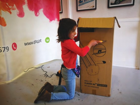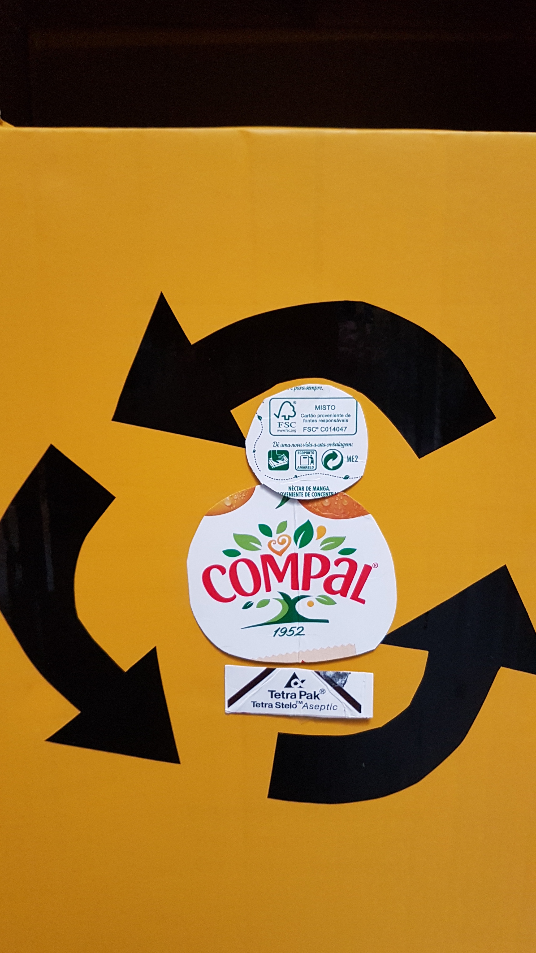 Desenhámos as setas que formam o símbolo da reciclagem em espelho de forma que quando virássemos ficasse na posição pretendida. Para as setas usámos vinil preto. Numa embalagem de compal e com uma tesoura recortámos com cuidado os símbolos desta marca, da Tetrapak e FSC para ficar direitinho. Por fim ensaiamos a colocação dos símbolos na caixa e quando encontrámos a posição ideal colámos.