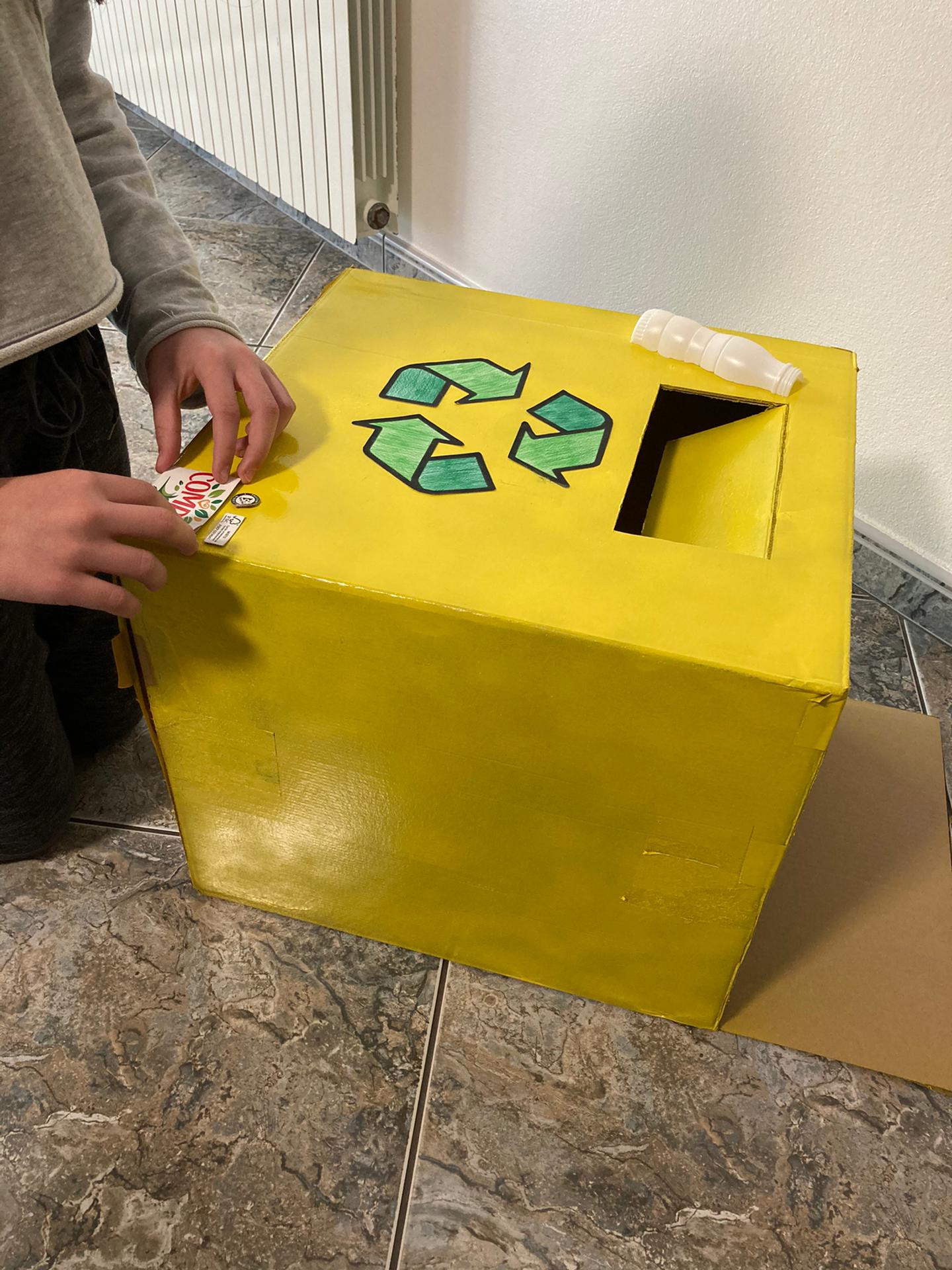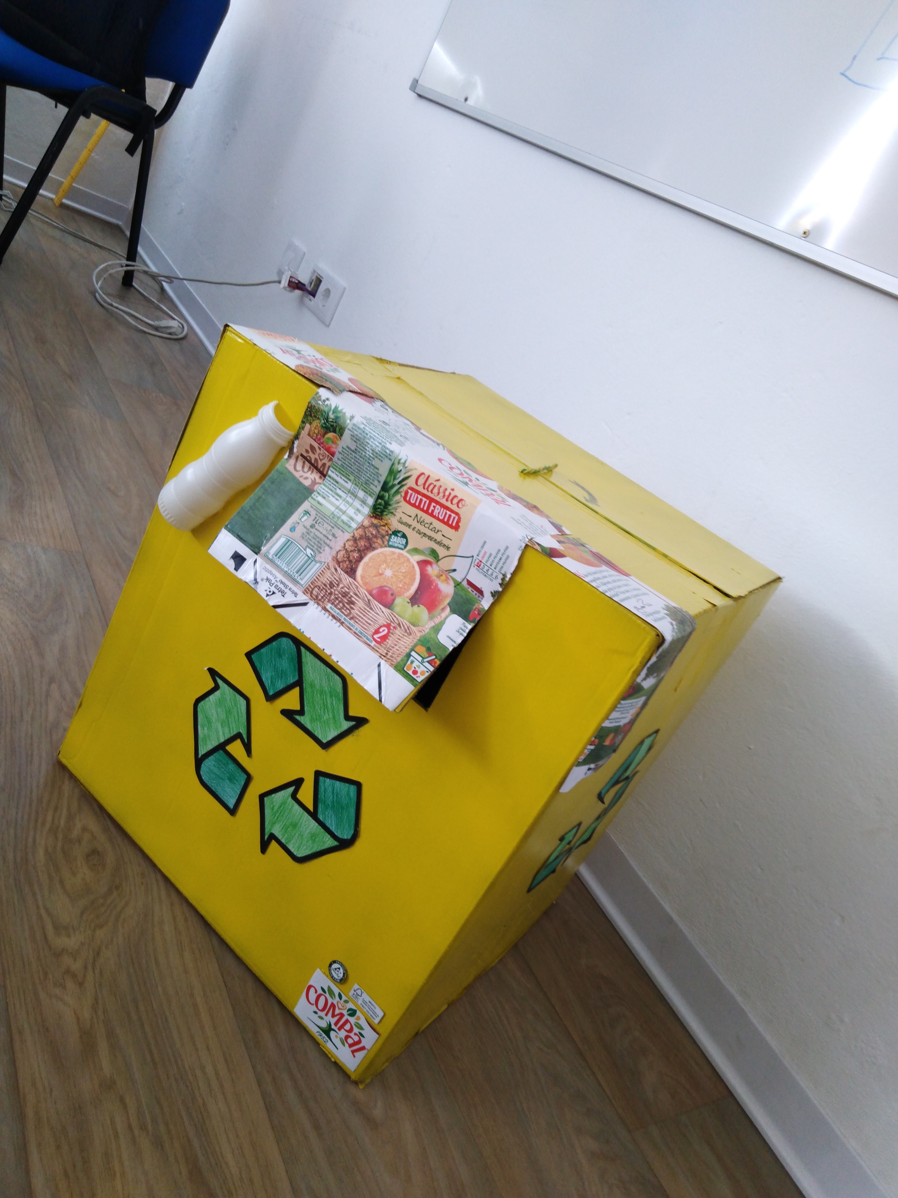 Este ecoponto foi construído a partir de um caixote de cartão através das técnicas de recorte, colagem e pintura. Para além da abertura destinada à entrada das embalagens, existe uma outra na parte superior com fecho de arame para retirada das mesmas.