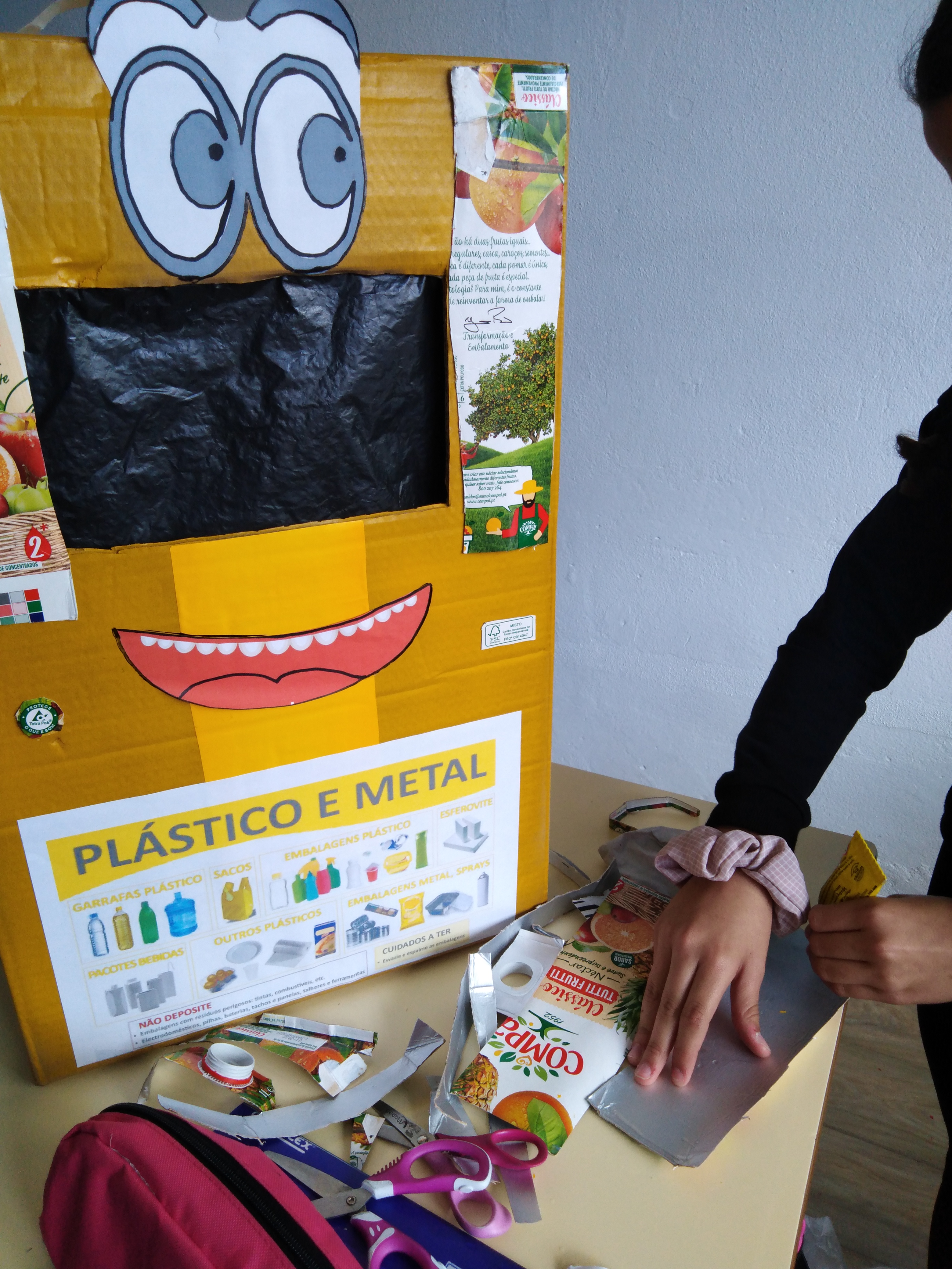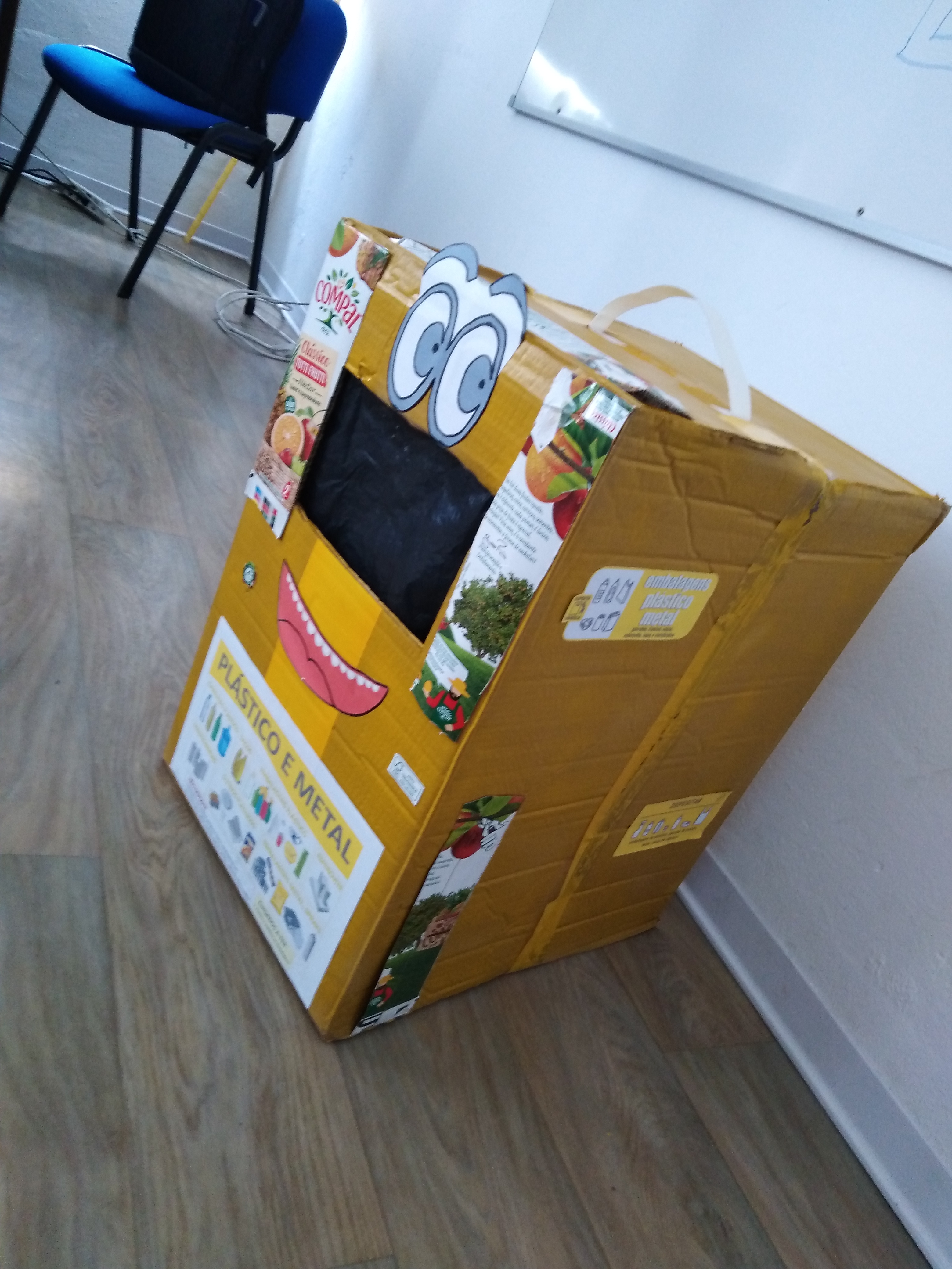Este ecoponto foi construído a partir de um caixote de cartão através das técnicas de recorte, colagem e pintura. Para além da abertura destinada à entrada das embalagens, existe uma pega na parte superior para transportar o ecoponto.