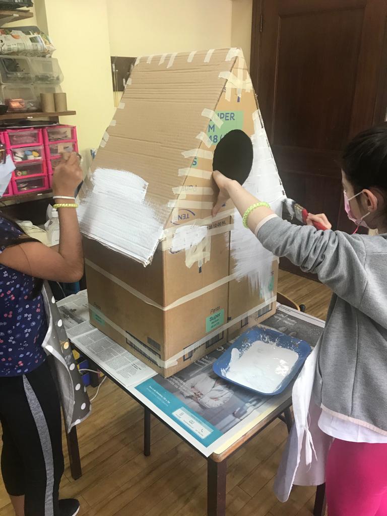 Foi apresentado o projeto à turma do 2º B, no clube “Eco Escolas”. Depois de chegar ao consenso a turma decidiu construir a partir de caixas de cartão uma casa típica de Santana (ilha da Madeira). Pintaram de amarelo a estrutura com tinta acrílica, recortaram as embalagens tetrapak da compal como consta nas imagens em anexo.