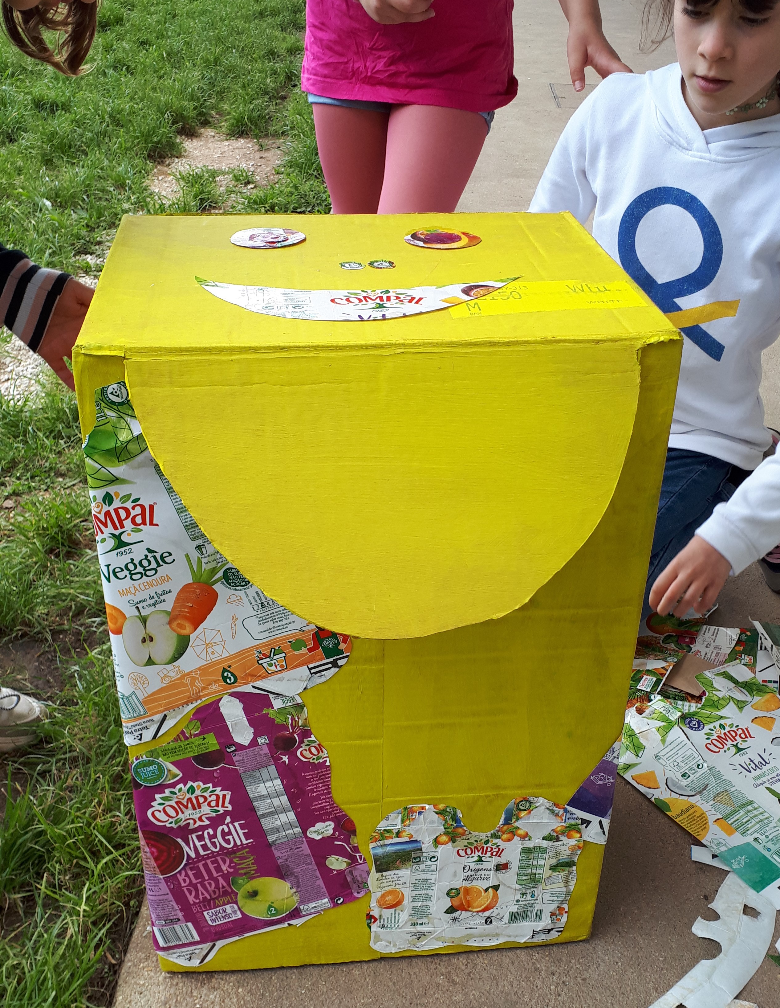 Cada uma das três turmas da escola construiu o seu Ecoponto Amarelo. O trabalho iniciou-se por um diálogo, onde os alunos deram as suas ideias e opiniões para a elaboração do projeto. Já tínhamos construído o Papelão agora era a vez do Amarelão. Cada sala começou por elaborar o seu projeto e escolher os materiais. Utilizaram-se caixotes de cartão, embalagens Tetra Pak da marca Compal, colas e tintas amarelas. Os alunos concretizaram o projeto de cada sala dando largas à sua criatividade. Cada sala desenvolveu um tema diferente: