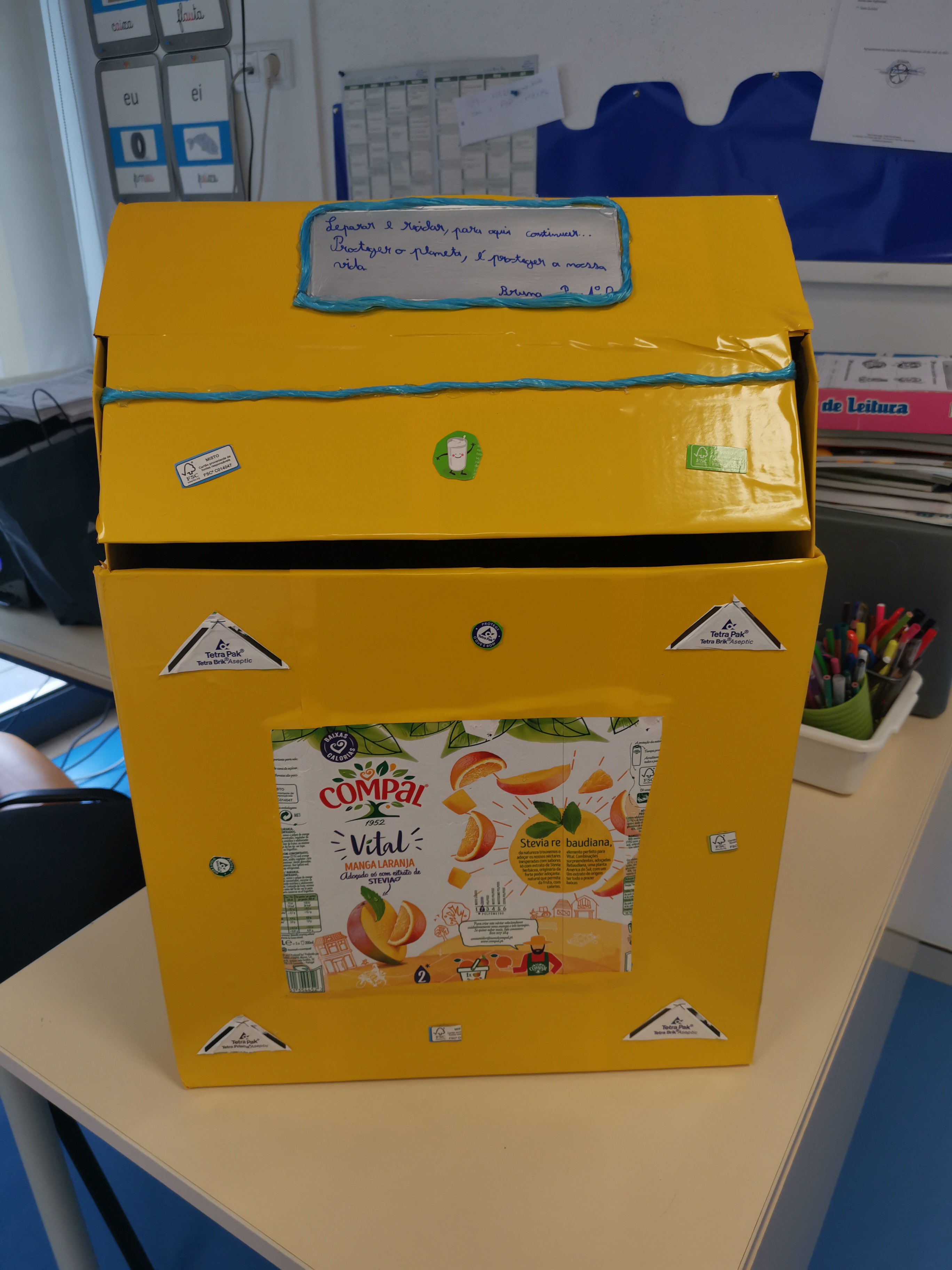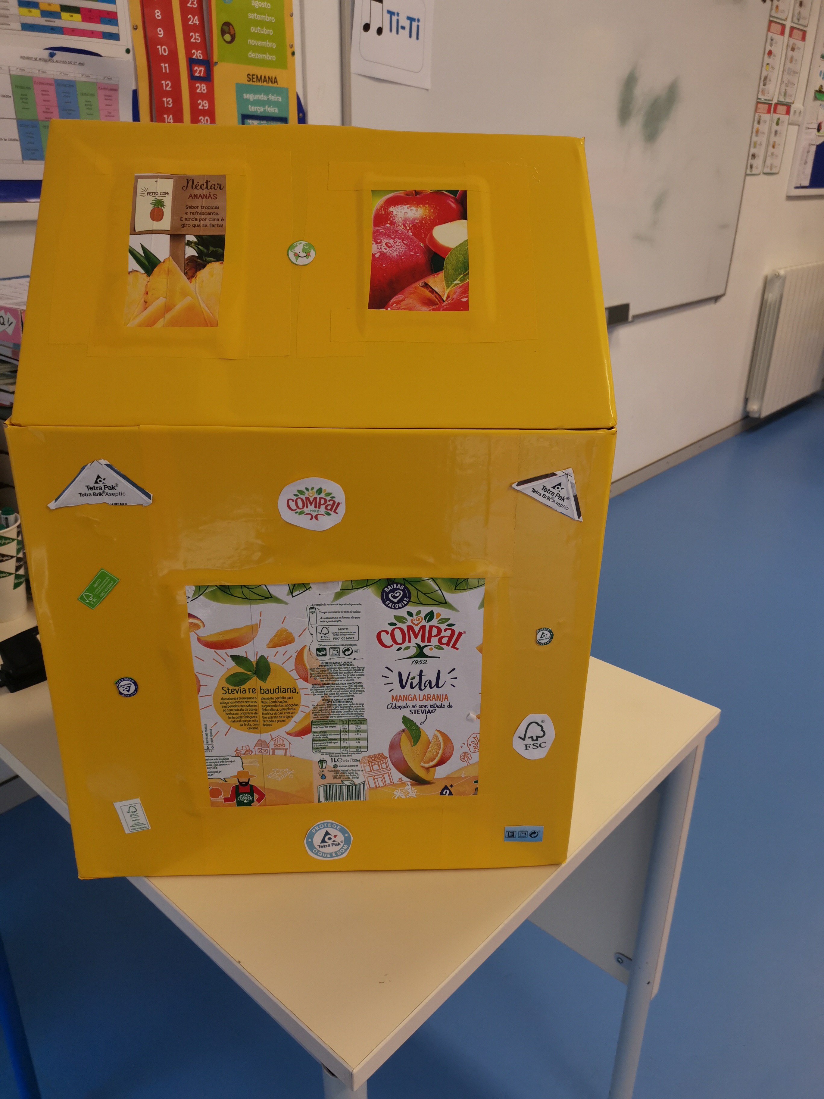 A primeira fase do projeto foi a recolha das embalagens, com o envolvimento da família. Depois foi a fase da construção, usando as embalagens, cartão, cola e tintas.