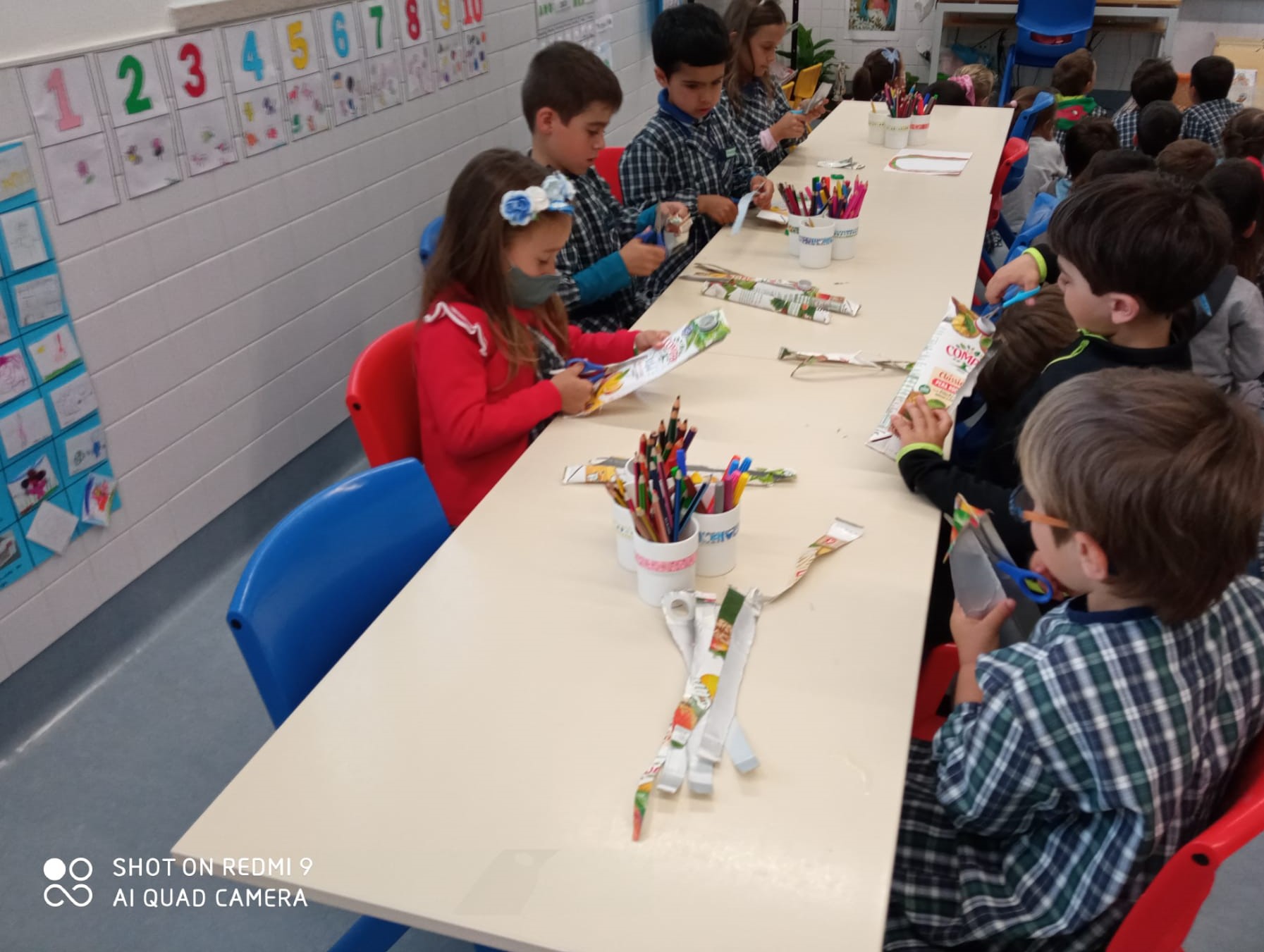 4. Processo de construção do ecoponto, em pequenos grupos: recorte das embalagens e dos desperdícios de papel, escrita e decoração da frase pensada pelas crianças, “montagem” do ecoponto com as tiras de papel e embalagem;