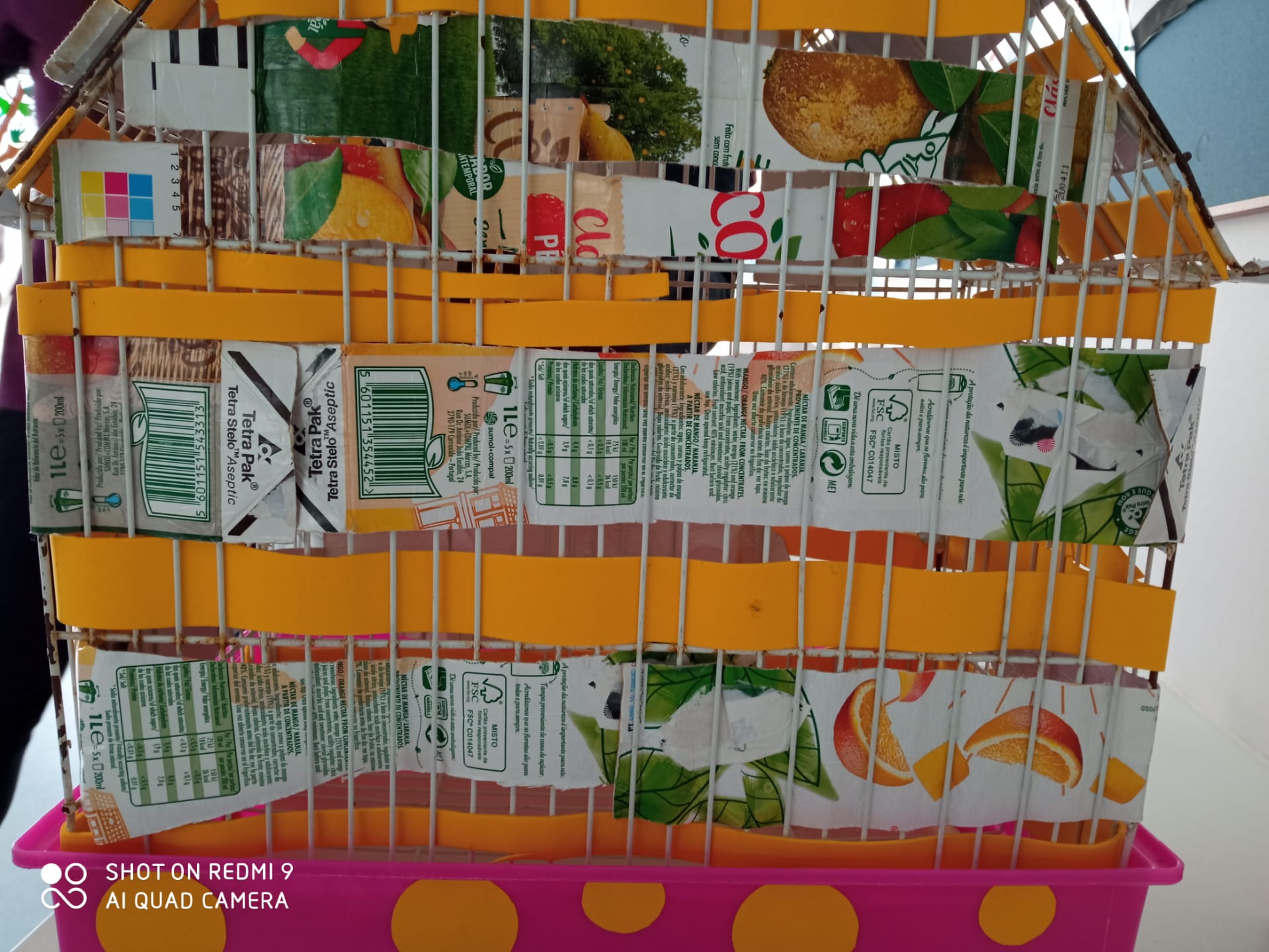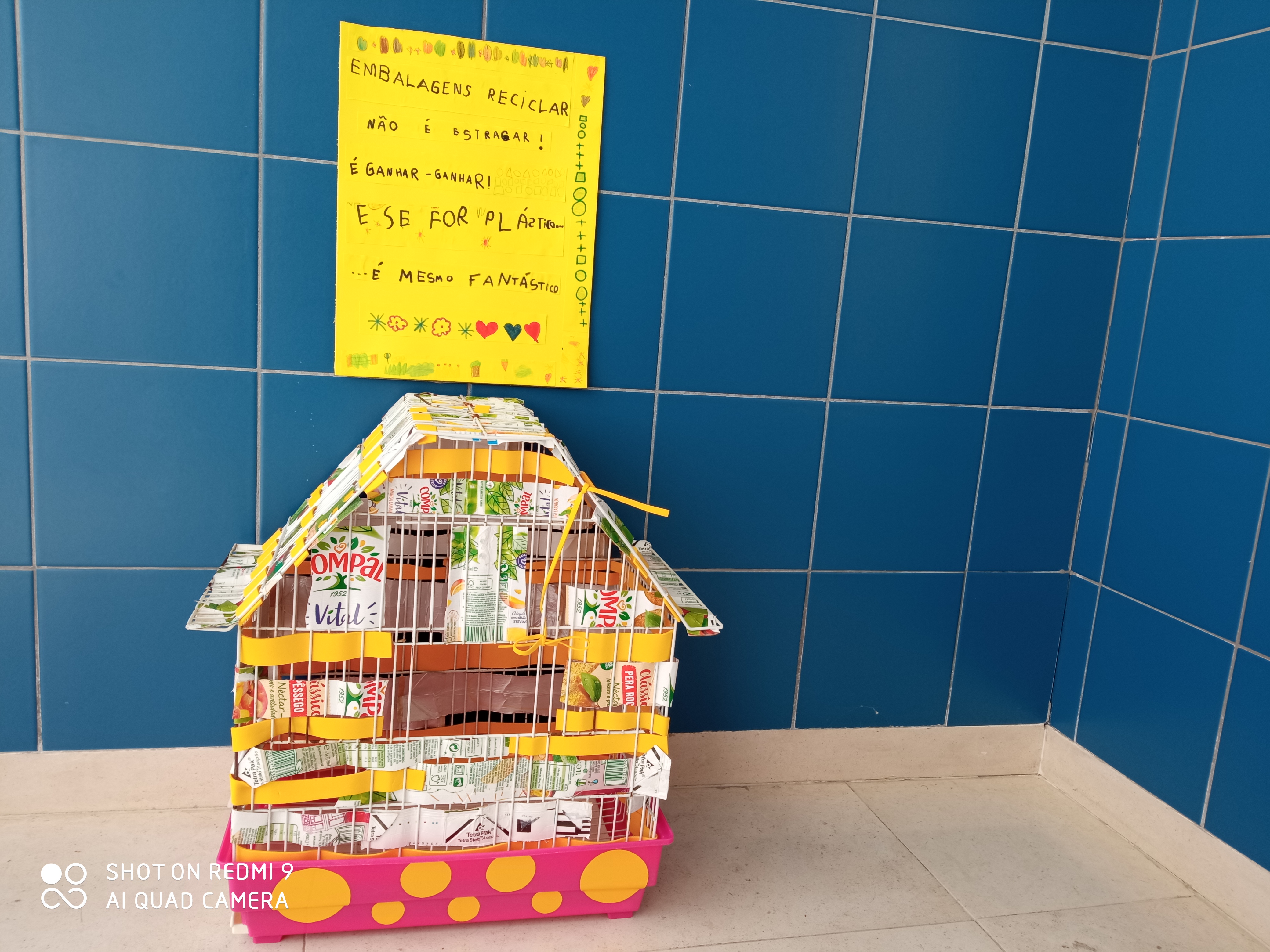 Materiais utilizados: Gaiola velha (retirada do lixo), embalagens Tetra Pak de Compal, desperdícios de papel EVA, tesouras, cola e canetas de feltro.