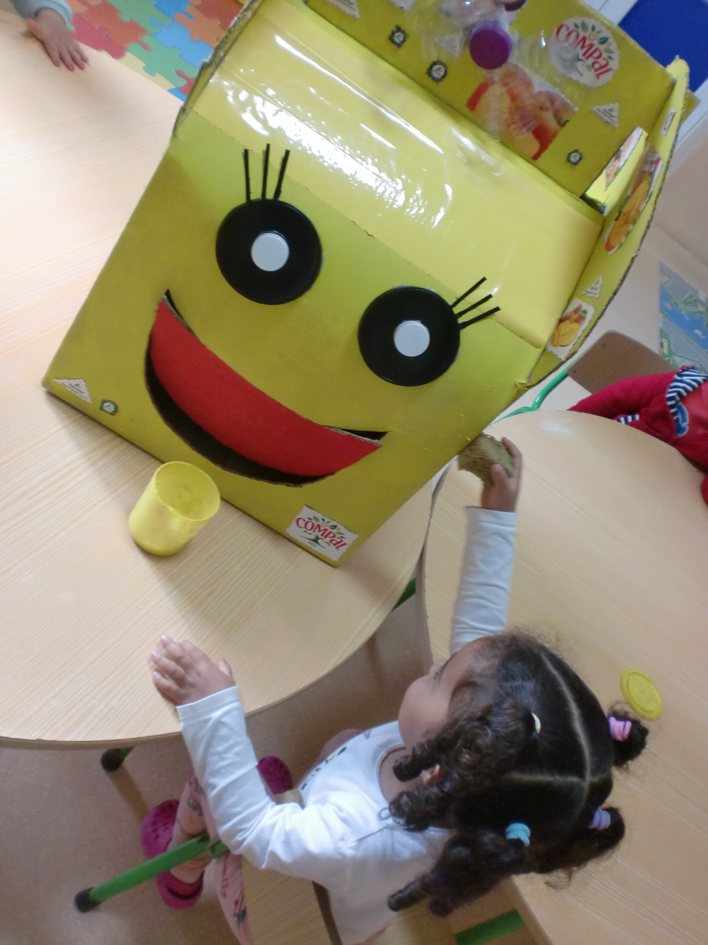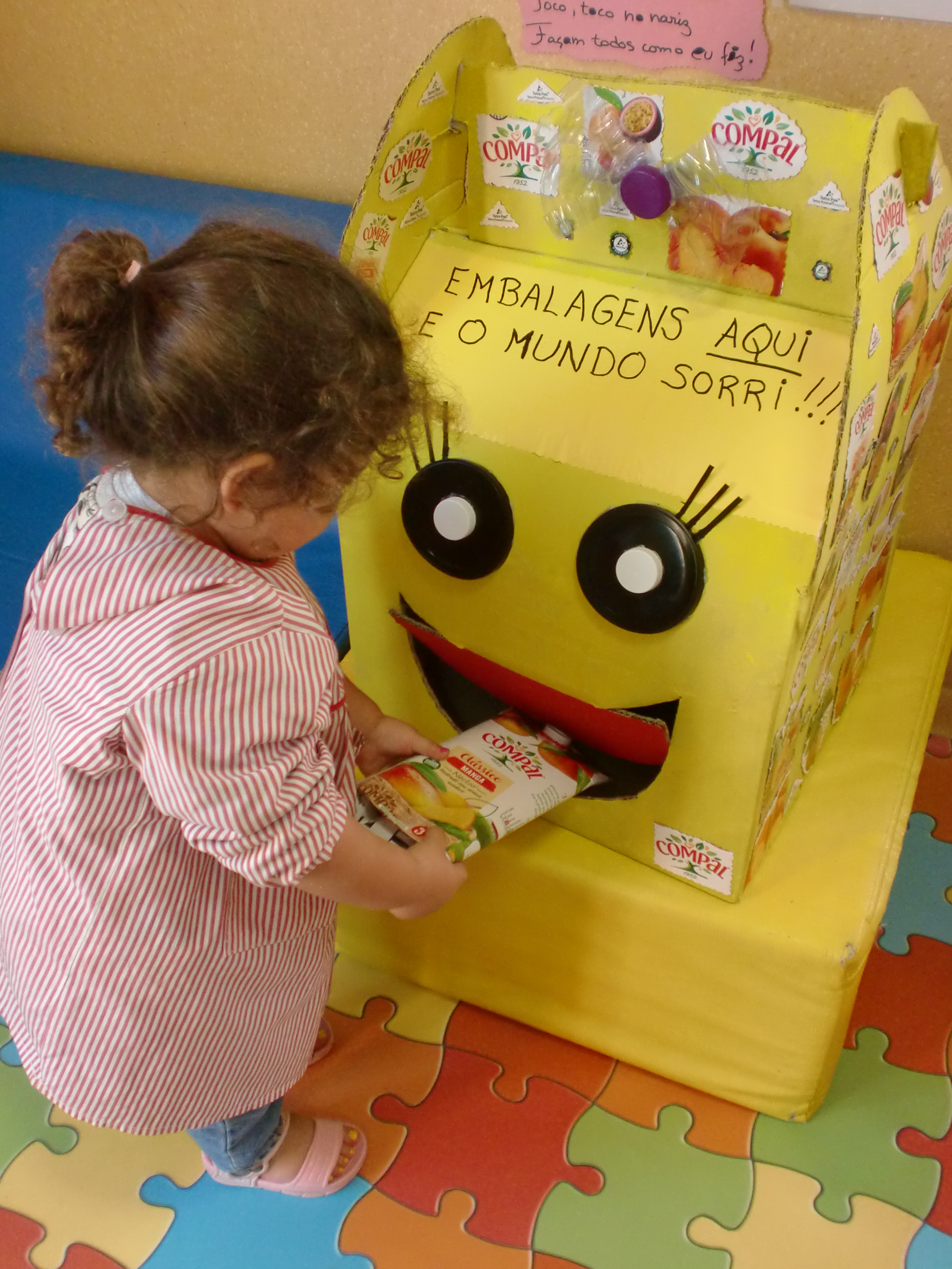 Com a colaboração dos pais e familiares das crianças do Infantário bem como equipa docente e não docente e ainda a colaboração do Centro Social, foi realizada a recolha de embalagens da Compal e símbolo Tetrapak. Foi reaproveitada uma caixa de cartão grande (que originalmente continha fraldas) para a construção do ecoponto. A caixa foi pintada de amarela por crianças e colaboradoras, foram recortados e colados alguns frutos das embalagens da Compal, e uma vez que o ecoponto se destina a crianças mais pequenas na parte da frente do ecoponto foram coladas umas tampas de plástico para formar os olhos, um laço elaborado com garrafa de plástico e a abertura para colocar as embalagens foi feita em formato de boca sorridente, de modo a ser mais atrativa às crianças.