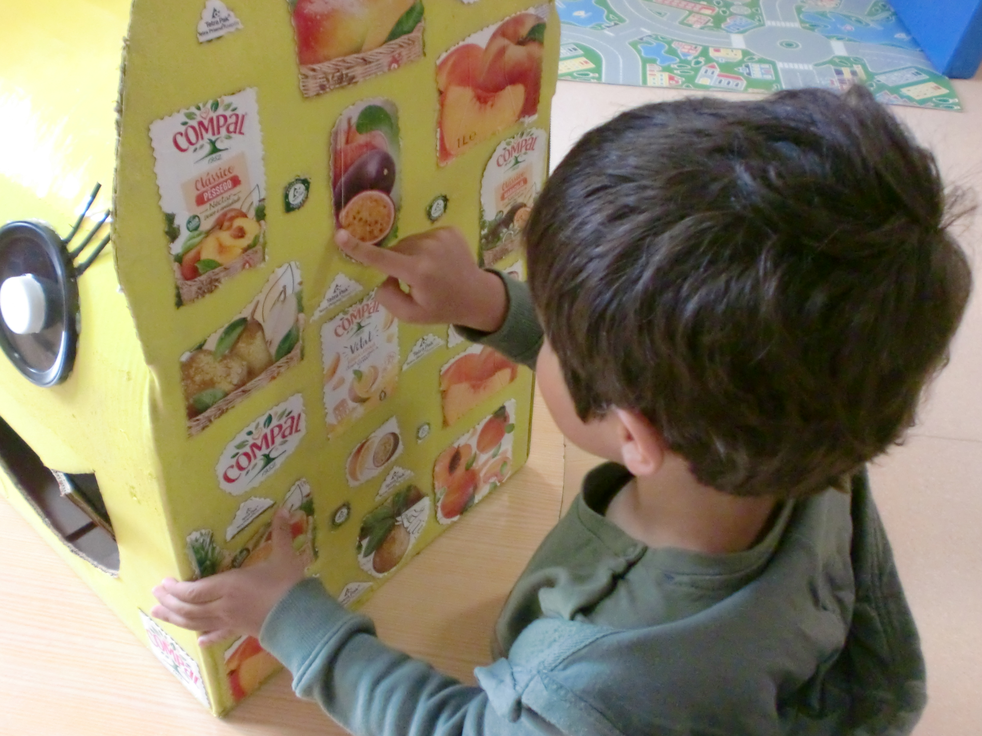 Para além da caixa de cartão e das embalagens Compal/Tetrapak foram utilizados outros materiais como tampas de plástico, uma garrafa de plástico, tintas, cola e tesoura.