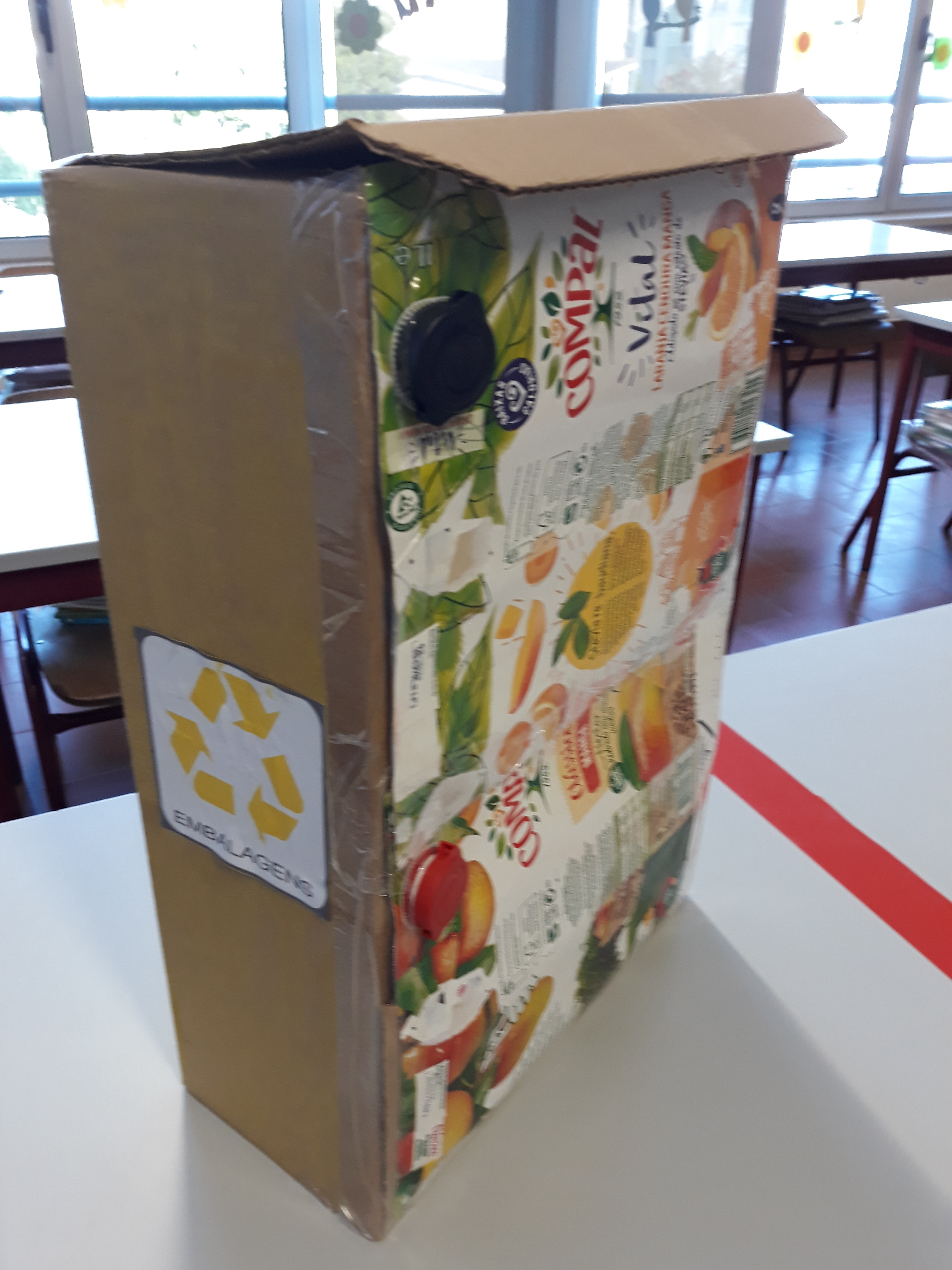 Material utilizado: caixas de papelão, pacotes de leite, pacotes de sumo da Compal, garrafas de água e tintas para pintar as caixas.