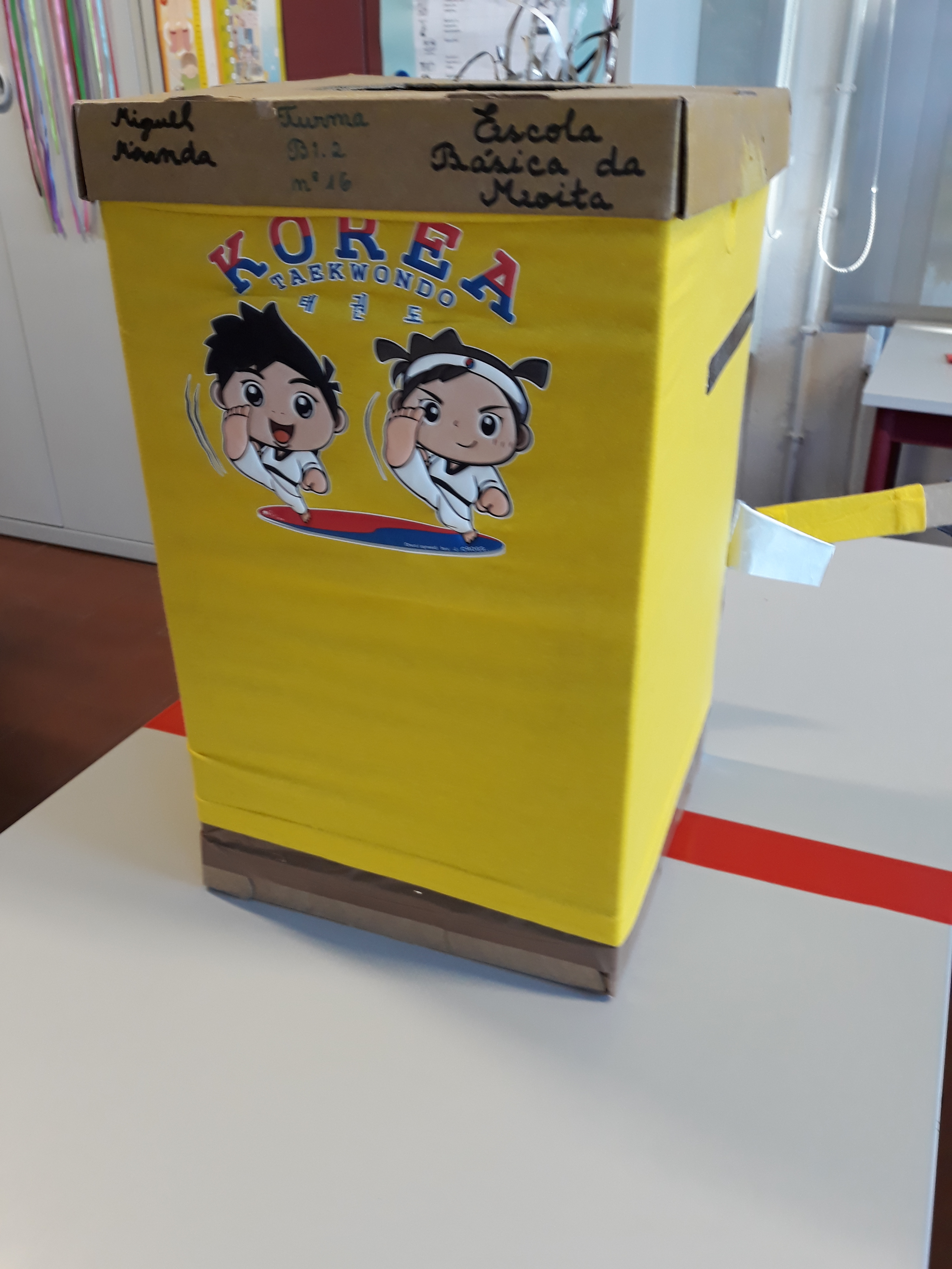 Material utilizado: caixas de papelão, pacotes de leite, pacotes de sumo da Compal, garrafas de água e tintas para pintar as caixas.