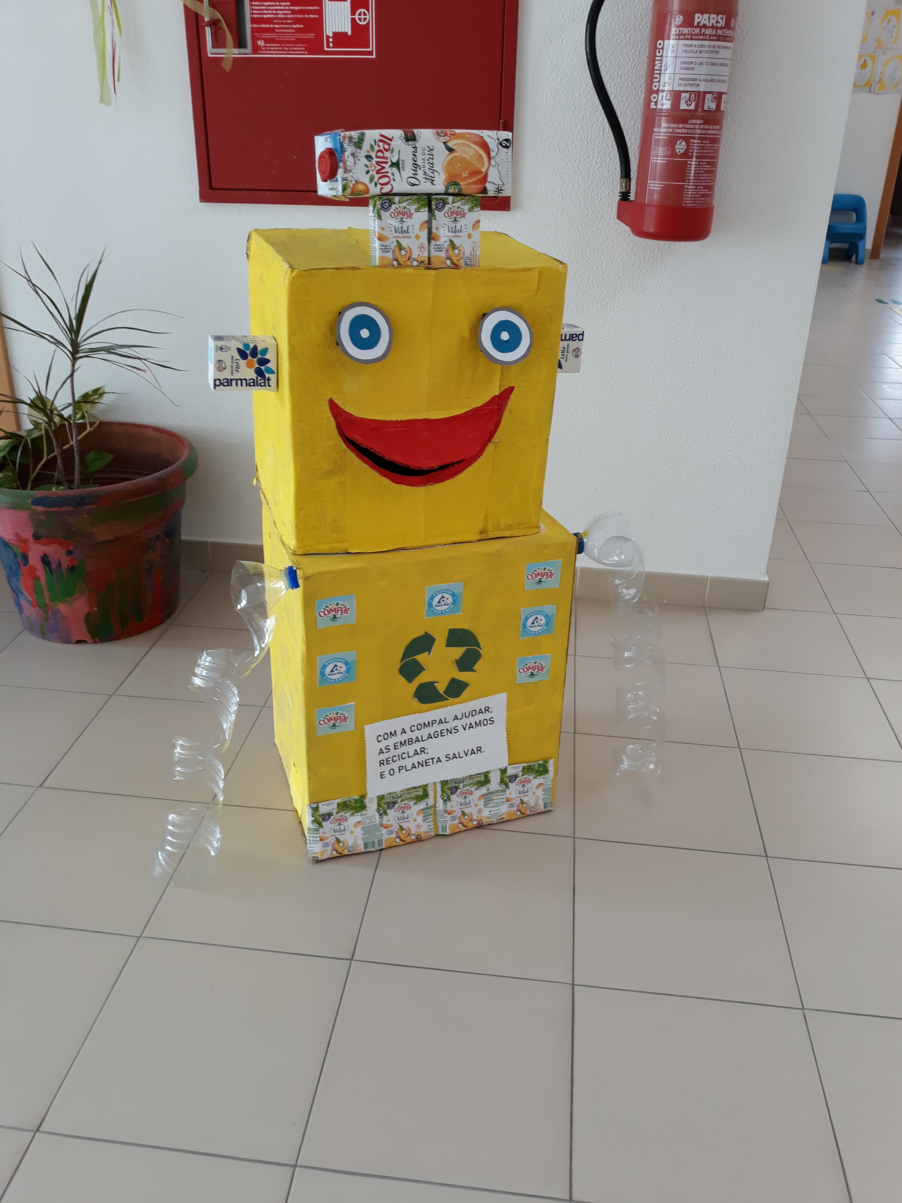 Metodologia construção do Robô da reciclagem, com duas caixas de papelão, uma grande para o corpo e outra relativamente mais pequena para a cabeça, pintadas pelas crianças, de amarelo, com pacotes de leite e de sumo da Compal fizeram as antenas, com as garrafas da água fez-se os braços. o lixo para a reciclagem introduz-se pela boca do Robô que irá cair dentro de um saco que está dentro da caixa grande (barriga), para despejar o robô basta levantar a cabeça e tirar o saco com o lixo para a reciclagem.