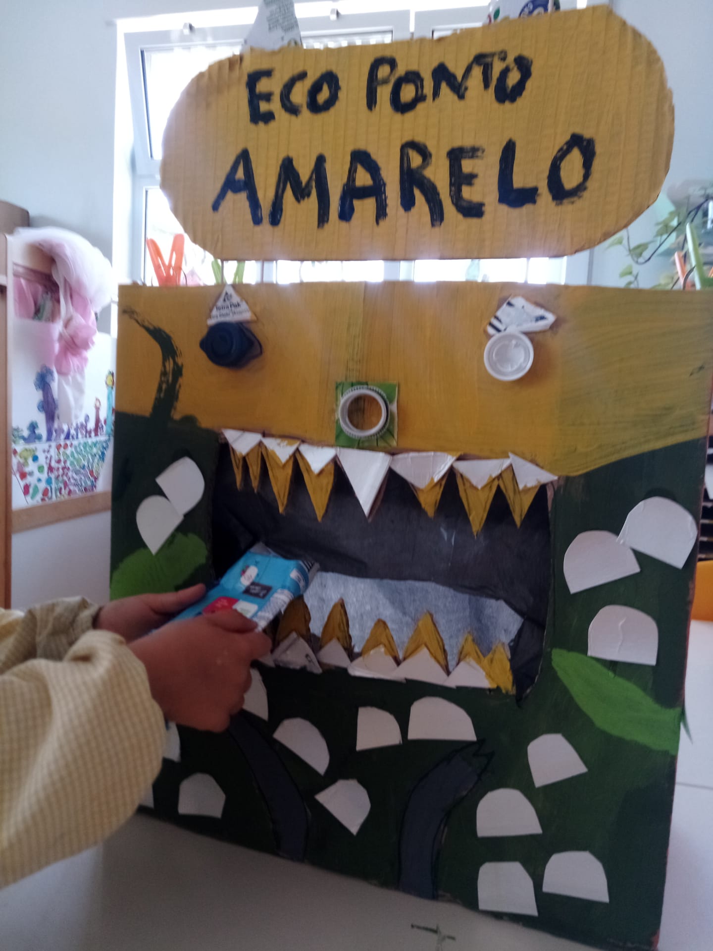 As crianças sugeriram a reutilização de uma caixa de cartão para fazer o ECO PONTO AMARELO.