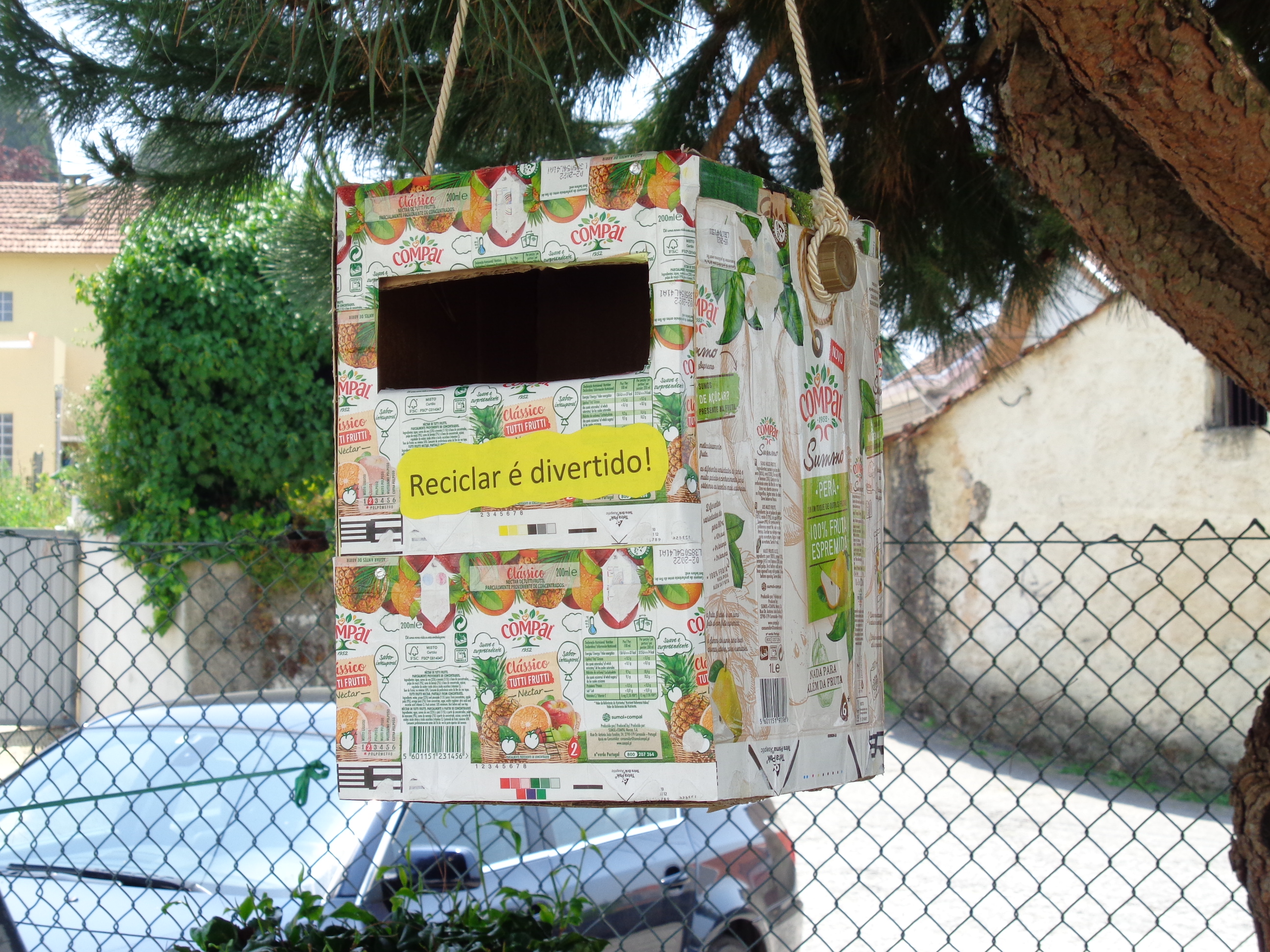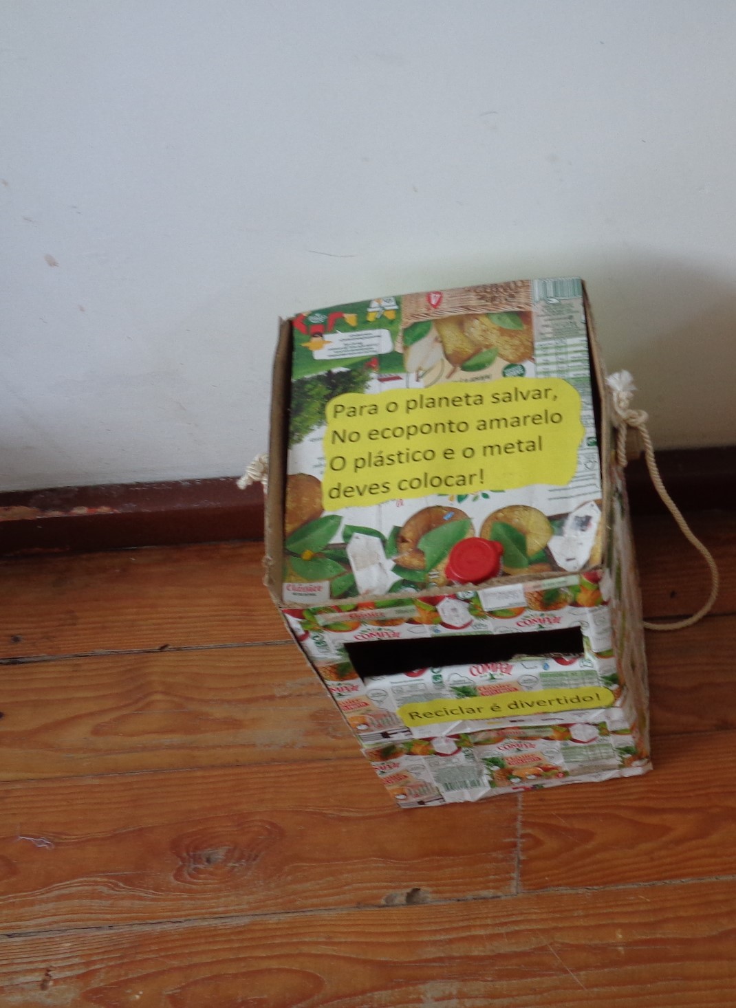 Este Ecoponto Amarelo, em forma de prisma quadrangular, foi construído com recurso ao recorte e colagem de embalagens vazias da Tetrapak/Compal formando uma caixa (dentro dos limites dimensionais previstos no regulamento). No exterior deste ecoponto foram ainda coladas frases apelativas à separação de embalagens de metal e de plástico. Possui ainda um fio de corda que o atravessa lateralmente para também poder ser pendurado.