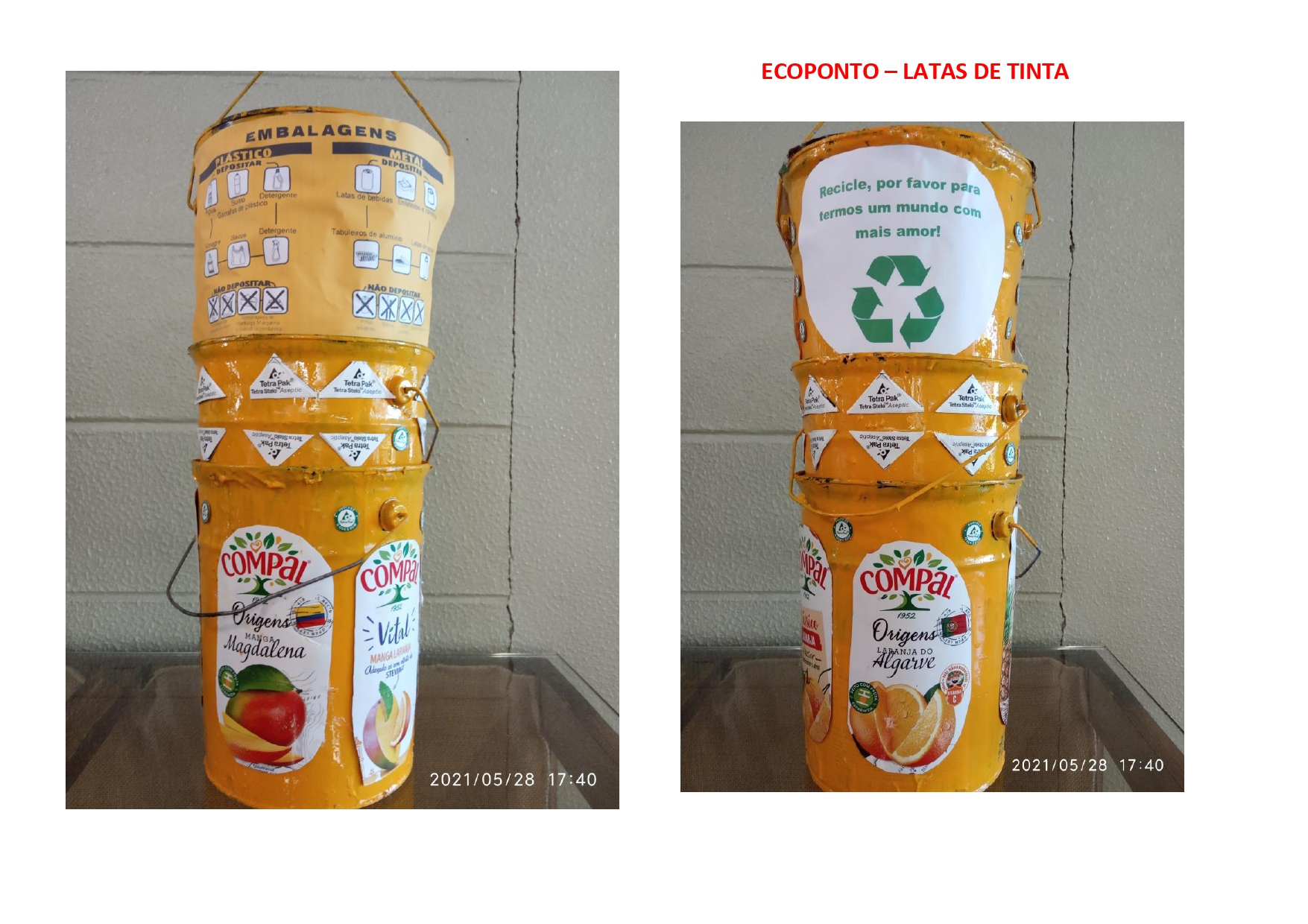 Neste seguimento os alunos construíram os ecopontos amarelos na disciplina de ECOSUST com materiais recolhidos na escola, nos espaços comerciais e em suas casas: embalagens da Compal, latas de tinta, caixas de cartão, tampinhas de garrafas, entre outros.