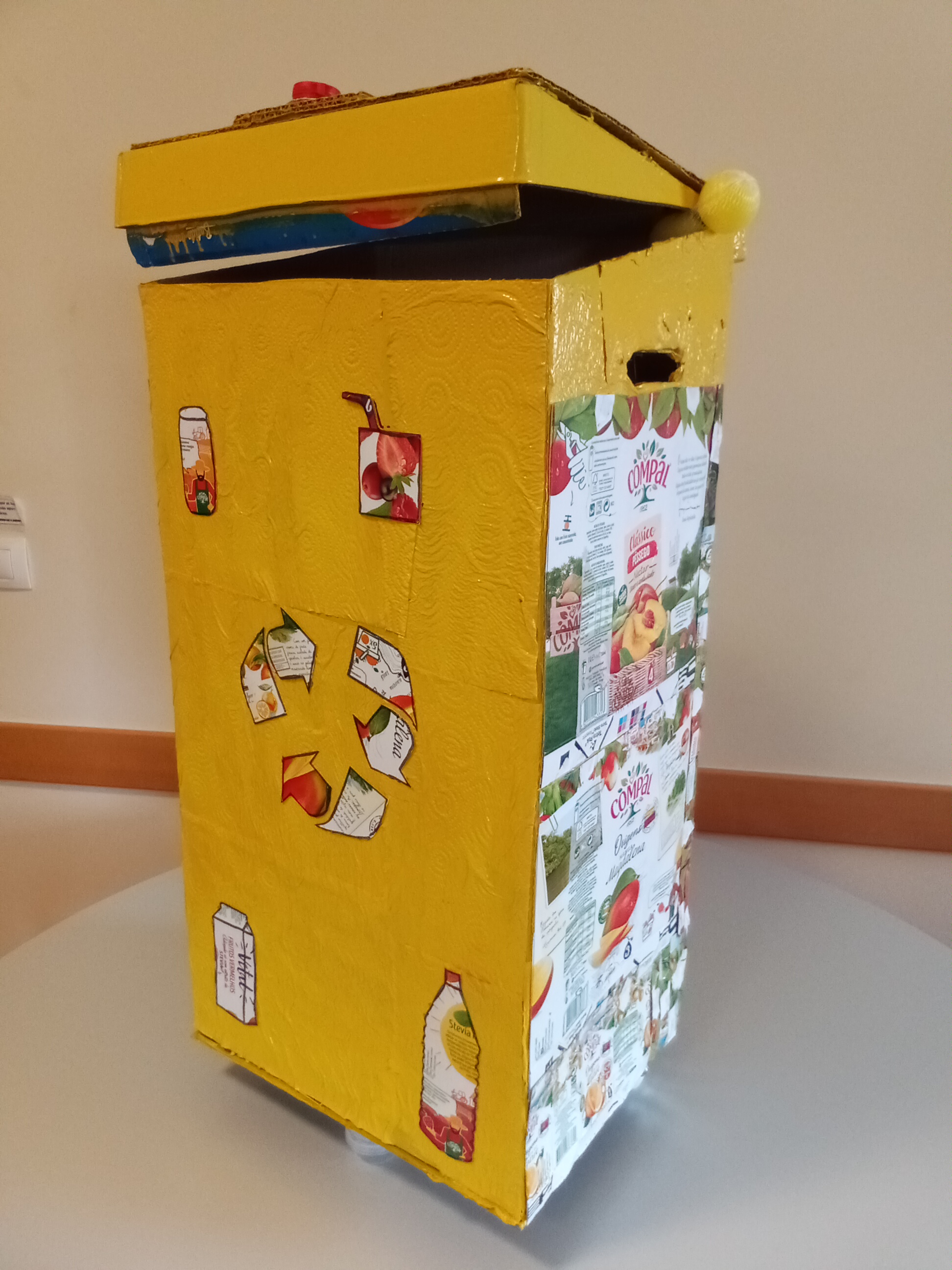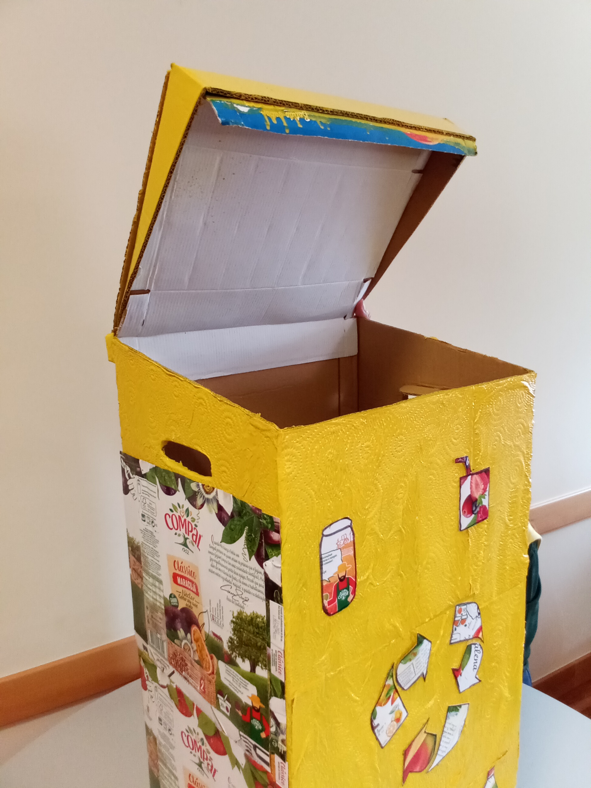 O primeiro ecoponto amarelo foi construído a partir de uma caixa de cartão de um esquentador que foi forrada com embalagens da COMPAL e pintada, de seguida, de amarelo. Foi construída uma pega na parte superior em cartão grosso e de seguida, foi cortada de modo a poder abrir para deposição das embalagens.